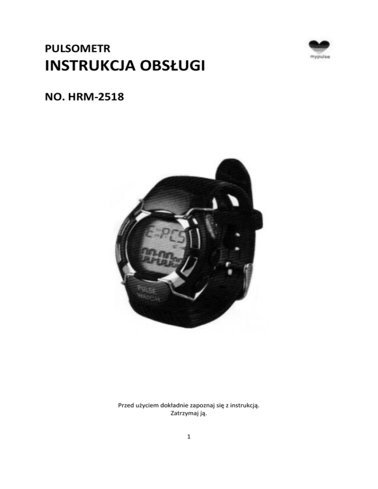 PULSOMETR INSTRUKCJA OBSŁUGI NO. HRM-2518 Przed użyciem dokładnie zapoznaj się z instrukcją. Zatrzymaj ją. 1 SPIS TREŚCI CECHY GŁÓWNE …………………………………………………………….………………………………..3 PIERWSZE KROKI ……………………………………………………………………………………………..4 SYGNAŁ TRANSMISJI ………………………………………………………………………………………..4 WŁĄCZANIE MODUŁÓW OPERACYJNYCH ………………………………………………………..4 ZEGAREK/DANE UŻYTKOWNIKA ………………………………………………………………………5 ALARM …………………………………………………………………………………………………………….6 STOPER ……………………………………………………………………………………………………..…….7 ĆWICZENIA ………………………………………………………………………………………………..…….8 TĘTNO …….………………………………………………………………………………………………..…..…9 PODŚWIETLENIE …………………………………………………………………………………………….11 BATERIA …………………………………………………………………………………………………………11 AKTYWNOŚCI WODNE I NA ZEWNĄTRZ ……………………………………………………..….11 SPECYFIKACJA ………………………………………………………………………………………………..12 2 UWAGA: Zatrzymaj tę instrukcję, ponieważ używasz nowego produktu. Zawiera ona praktyczne instrukcje krok po kroku, jak również techniczne specyfikacje i ostrzeżenia, które powinieneś znać. CECHY GŁÓWNE WIDOK Z PRZODU 1. Włącz podświetlenie. 2. MODE (moduł): przełącz do wyświetlenia innego modułu. 3. UP (do góry): Uruchom/zatrzymaj stoper; zmień ustawienia. 4. HR (tętno): Uruchom moduł Tętna; wyświetla się ikona serca. 5. SET (ustawienia): włącz tryb ustawień; ustawienia zegarka. 6. Czujnik tętna. LCD 1. Pasek statusu, wyświetla obecny status. 2. Wskazuje czy puls serca jest za wysoki lub za niski. 3 3. Poziom ćwiczeń. 4. AM/PM: 12-godzinny zegarek. 5. Główny pasek wyświetlacza, pokazuje wartości. 6. Ustawiono alarm. 7. Cogodzinny alarm o pełnej godzinie. 8. Kcal: Kalorie 9. FAT/g: Tłuszcz 10. Trwa okrążenie (miga) lub spauzowane (świeci). 11. Puls serca. 12. %: Procent odczytywania pulsu serca. PIERWSZE KROKI WAŻNE Aby efektywnie używać zegarka podczas ćwiczeń, tj. aby liczyć spalone kalorie i indeks fitness, MUSISZ ustawić limity pulsu serca i dane użytkownika jak pokazano w istotnych sekcjach. WŁĄCZANIE ZEGARKA (TYLKO PRZY PIERWSZYM UŻYCIU) Jeśli na zegarku nic się nie wyświetla, wciśnij którykolwiek przycisk przez 5 sekund, aby aktywować wyświetlacz LCD. SYGNAŁ TRANSMISJI Podczas wykrywania pulsu serca, dane będą wyświetlane zgodnie. Jeśli sygnał pulsu serca nie zostanie wykryty w ciągu 3 minut, zegarek automatycznie wyłączy moduł pulsu serca i przełączy się w moduł zegarka. IKONA OPIS Miga, kiedy sygnał został wykryty. Kiedy puls serca jest wyższy niż ustawiona górna wartość. Kiedy puls serca jest niższy niż ustawiona dolna wartość. WŁĄCZANIE MODUŁÓW OPERACYJNYCH Wciśnij przycisk MODE, aby przełączać się pomiędzy 4 modułami. Wciśnij przycisk HR, aby przełączyć się do modułu HR (Puls). 4 ZEGAREK/DANE UŻYTKOWNIKA Aby ustawić zegarek i dane użytkownika: 1. Wciśnij przycisk MODE i przełącz się do modułu zegarka. 2. Wciśnij i przytrzymaj przycisk SET aż do momentu, gdy pierwsze dane do ustawienia będą migać. 3. Wciśnij przycisk UP, aby zmienić ustawienia. 4. Wciśnij przycisk SET, aby potwierdzić ustawienia i przenieść się do kolejnych ustawień. 5. Sekwencja ustawień to: godzina, minuta, sekunda, rok, MD/DM (format dzień-miesiąc), miesiąc, dzień, rok urodzenia, miesiąc urodzenia, dzień urodzenia, płeć, jednostka, waga. Aby ustawić format zegarka: 12-godzinny lub 24-godzinny: 1. Wciśnij przycisk MODE i przełącz się do modułu zegarka. 2. Wciśnij przycisk UP, aby zmienić format. 5 ALARM Aby ustawić dzienny alarm: 1. Wciśnij przycisk MODE, aby przełączyć się do modułu alarmu. 2. Wciśnij przycisk UP aż wyświetli się ekran alarmu, możesz ustawić ALM-1, ALM-2, ALM-3, ALM-4, ALM-5, DELAY, SIG. Możesz ustawić 5 alarmów w ciągu jednego dnia: ALM-1 do ALM-5, DELAY to czas trwania alarmu, SIG to wybijanie godziny. 3. Wciśnij i przytrzymaj przycisk SET aż cyfry będą migać. 4. Wciśnij przycisk SET, aby wybrać odpowiednie wartości. Później wciśnij przycisk UP, aby zmienić ustawienia. Przytrzymaj, aby przejść szybko przez opcje. 5. Przyciśnij przycisk SET, aby potwierdzić i przenieść się do kolejnych ustawień. 6. Sekwencja ustawień to: ON/OFF, godziny, minuty. Aby ustawić długość trwania alarmu: 1. Wciśnij przycisk MODE, aby przełączyć się do modułu alarmu. 2. Wciśnij przycisk UP, aż wyświetli się ekran DELAY (czas trwania alarmu). 3. Przytrzymaj przycisk SET, aby wyświetliły się cyfry. 4. Wciśnij przycisk UP, aby ustawić czas trwania alarmu: 0’30”, 1’00”, 2’00”, 3’00”, 4’00”. 6 Włączanie/Wyłącznie wybijania godziny: 1. Wciśnij przycisk MODE, aby przełączyć się do modułu alarmu. 2. Wciśnij przycisk UP aż wyświetli się ekran SIG. 3. Wciśnij przycisk SET, aby włączyć/wyłączyć wybijanie godziny. Jeśli funkcja jest aktywna pojawi się ikona . STOPER Wciśnij przycisk MODE, aby przełączyć się do modułu stopera. Stoper ma 35 rund. Obsługa stopera: 1. Wciśnij przycisk UP, aby uruchomić stoper. 2. Kiedy stoper jest włączony, wciśnij przycisk UP, aby stoper zaczął odliczać. 3
