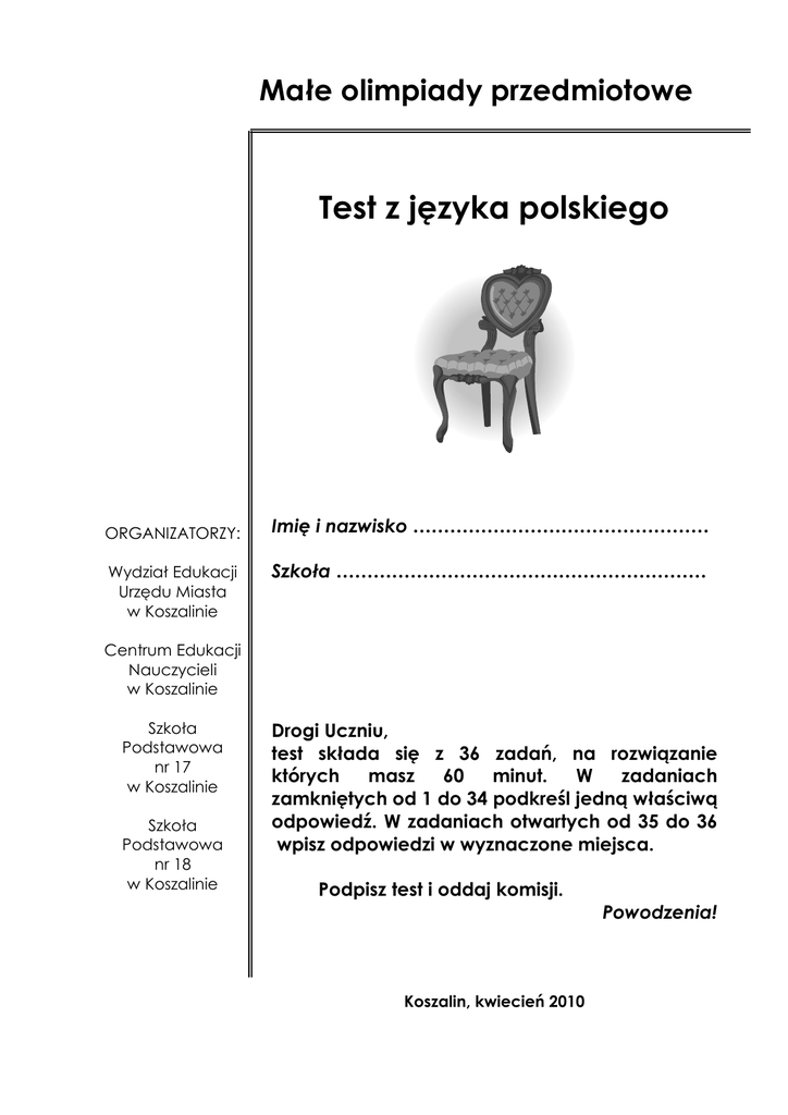 Małe olimpiady przedmiotowe Test z języka polskiego ORGANIZATORZY: Wydział Edukacji Urzędu Miasta w Koszalinie Imię i nazwisko ………………………………………… Szkoła …………………………………………………… Centrum Edukacji Nauczycieli w Koszalinie Szkoła Podstawowa nr 17 w Koszalinie Szkoła Podstawowa nr 18 w Koszalinie Drogi Uczniu, test składa się z 36 zadań, na rozwiązanie których masz 60 minut. W zadaniach zamkniętych od 1 do 34 podkreśl jedną właściwą odpowiedź. W zadaniach otwartych od 35 do 36 wpisz odpowiedzi w wyznaczone miejsca. Podpisz test i oddaj komisji. Powodzenia! Koszalin, kwiecień 2010 TEKST I W dwutysięcznym roku nad Doliną Warty przeszła straszliwa burza. Trwała bez przerwy przez trzy dni i trzy noce. Przerażone zwierzęta kryły się w najgłębszych norach. Małe dzieci chowały głowy pod poduszki, by nie słyszeć nieustającego huku grzmotów, w wielu domach zgasło światło, a dachy porwała wichura. Trzeciego dnia piorun uderzył w olbrzymi stary dąb rosnący na wzgórzu. Drzewo pękło i runęło na ziemię. Zadrżały domy w całej dolinie, a burza natychmiast ustała. Nie był to zwyczajny dąb. Było to Magiczne Drzewo. Miało w sobie ogromną, cudowną moc. Lecz wtedy nikt o tym nie wiedział. Ludzie zawieźli je do tartaku i pocięli na deski. Z drewna zrobiono setki różnych przedmiotów, a w każdym przedmiocie została cząstka magicznej mocy. W zwyczajnych rzeczach ukryła się siła, jakiej nie znał dotąd świat. Wysłano je do sklepów i od tego dnia na całym świecie zaczęły się niesamowite zdarzenia. (…) * Kuki chciał pobiec na drugą stronę mostu, kiedy coś zauważył. Rzeką płynął dziwny przedmiot. Ponad wodę wystawała tylko mała część, coś czerwonego i błyszczącego. Chłopiec wychylił się przez barierkę i patrzył uważnie. Czerwony przedmiot co chwila znikał pod wodą i znów się wynurzał. Kuki przypomniał sobie, jak w jednym filmie chłopak wyłowił kufer z mumią. Miała złotą koronę. Ale potem ożyła i pożarła pół Nowego Jorku… Kuki położył się na mostku i wychylił się. Przedmiot zatrzymał się i podpłynął wprost do jego ręki. Kuki złapał go i z trudem wyciągnął z wody. To nie był żaden skarb, tylko zwykłe krzesło. Ale wyglądało jak nowe. Czerwony lakier lśnił w słońcu. Kuki wytarł siedzisko rękawem bluzy i usiadł. Poczuł coś dziwnego, jakby przeszedł go lekki prąd. - Skąd masz to krzesło? Odwrócił się. Z zielonego domu wybiegł Filip. Za nim wyszła Tośka. - Skąd je masz? - Wyłowiłem. - Zostaw tego śmiecia. Wracamy, bo ciotka zaraz przyjdzie. - Ja je zabiorę do domu – powiedział stanowczo Kuki. - Zgłupiałeś? Po co? - Jak teraz jesteśmy biedni, to musimy zbierać różne rzeczy. Filip parsknął śmiechem. Kuki nie odpowiedział. Złapał krzesło i ruszył w stronę ulicy Weneckiej, gdzie był ich dom. Na ulicy Weneckiej, przed kamienicą numer siedem, zatrzymał się czarny mercedes M-Klasse. Wysiadła z niego wysoka chuda kobieta. Mimo ciepłego dnia była ubrana w długi płaszcz, który wyglądał jak wojskowy mundur zapięty po samą szyję. Miała czerwone buty na wysokim obcasie i czarny parasol. Jej oczy zasłaniały okulary i nie było widać, czy jest zła, ponura czy tylko smutna. Jednak na pewno nie wyglądała na osobę wesołą. Spojrzała niechętnie na kamienicę, z której w kilku miejscach odpadał tynk, a ściany były wymalowane kolorowym graffiti. Nadbiegli Filip, Tośka i Kuki dźwigający krzesło. - Nie nauczyli was, że trzeba mówić dzień dobry? – spytała kobieta. - Dzień dobry ciociu. (….) Kuki szepnął do Filipa. - Chciałbym, żeby przyleciało tysiąc ptaków i każdy zrobił kupę na jej auto. - Cicho, chodź… Kuki wstał z krzesła. Chwycili je wspólnie z Filipem i wbiegli do kamienicy. Nie widzieli, jak na niebie pojawiła się ogromna ciemna chmura, która rosła i szybko zbliżała się do ich domu. Było to wielkie stado ptaków. Andrzej Maleszka, Magiczne Drzewo (fragment) 2 Pytania 1- 19 dotyczą TEKSTU I 1. Kiedy dzieją się przedstawione wydarzenia? a) przed 2000 r., b) w 2000 r. i później, c) tylko po 2000 r., d) nie można tego stwierdzić. 2. Gdzie rozgrywają się wydarzenia, w których bierze udział Kuki? a) w Nowym Jorku, b) w Wenecji, c) nad Doliną Wisły, d) nie wiadomo. 3. Skąd najprawdopodobniej pochodziło krzesło? a) z Magicznego Drzewa, b) z tartaku, c) ze sklepu, d) wszystkie odpowiedzi są poprawne. 4. Gdzie mieszkał Kuki? a) w domu nad Wartą, b) w zielonym domu, c) w zniszczonej kamienicy, d) w kamienicy na ulicy Wiślanej. 5. Kto jest narratorem TEKSTU I? a) ciotka, b) obserwator, c) Kuki, d) Filip. 6. Co można powiedzieć o narratorze? a) jest obiektywny, b) jest subiektywny, c) jest ironiczny. d) włącza się w akcję. 7. Dlaczego Kuki zabrał krzesło do domu? a) spodobało mu się, b) chciał mieć nowy przedmiot w domu, c) poczuł coś niesamowitego, d) nie wiadomo. 8. Jakie słowo najlepiej opisuje relacje uczuciowe między młodymi bohaterami a ich ciotką? a) niechęć, b) niezależność, c) nieufność, d) lekceważenie. 3 9.W jaki sposób ujawnia się charakter ciotki Kukiego? a) poprzez myśli, b) poprzez opis wyglądu, c) poprzez opis zainteresowań, d) poprzez opis sposobu poruszania się. 10. Jakie cechy Kukiego ujawniają się w podanym fragmencie? a) zdecydowanie, spostrzegawczość, b) otwartość, wrażliwość, c) bujna wyobraźnia, egoizm, d) niecierpliwość, wybuchowość. 11. Czego można dowiedzieć się o sytuacji dzieci? a) Są biedne i nie mają rodziców. b) Nie lubią dorosłych i wierzą w magię. c) Mieszkają w odrapanej kamienicy i są biedne. d) Zazdroszczą bogatszym i mieszkają w pobliżu rzeki. 12. Co można powiedzieć o ciotce Kukiego? a) skromna i biedna, b) elegancka i bogata, c) niewyróżniająca się z tłumu, d) dziwna i zabawna. 13. Jak odzywała się ciotk