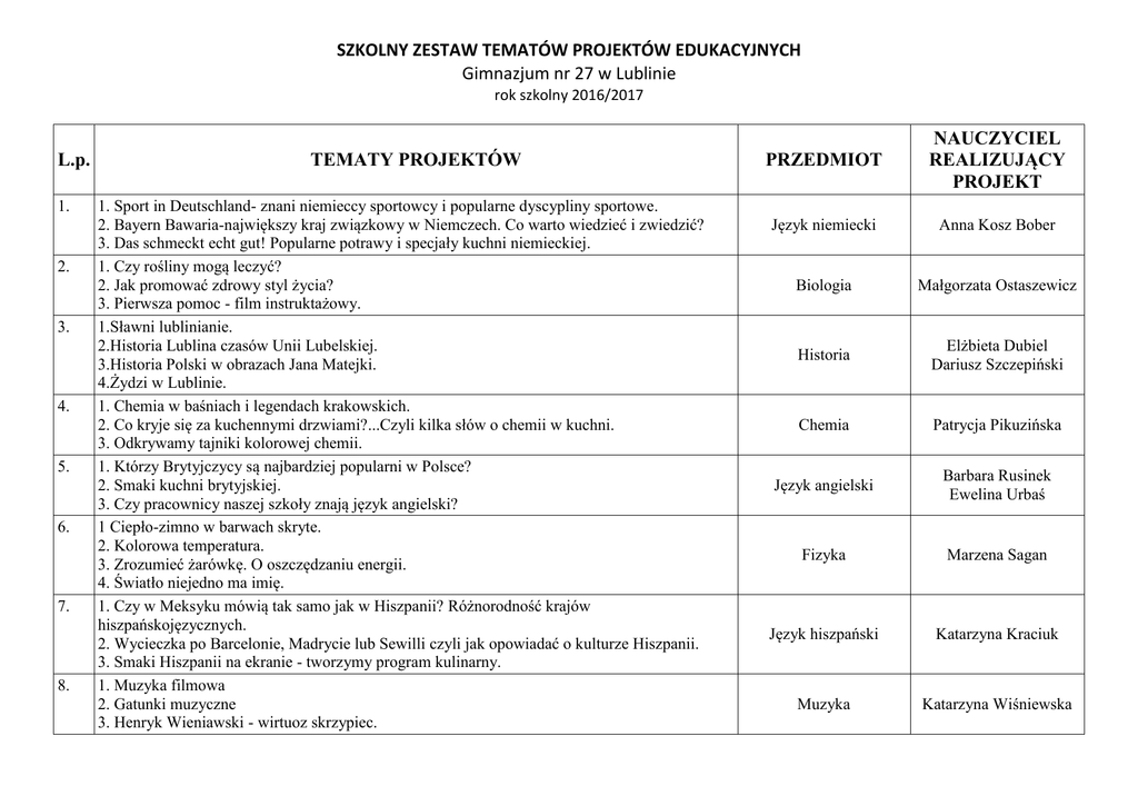 SZKOLNY ZESTAW TEMATÓW PROJEKTÓW EDUKACYJNYCH Gimnazjum nr 27 w Lublinie rok szkolny 2016/2017 L.p. 1. 2. 3. 4. 5. 6. 7. 8. TEMATY PROJEKTÓW 1. Sport in Deutschland- znani niemieccy sportowcy i popularne dyscypliny sportowe. 2. Bayern Bawaria-największy kraj związkowy w Niemczech. Co warto wiedzieć i zwiedzić? 3. Das schmeckt echt gut! Popularne potrawy i specjały kuchni niemieckiej. 1. Czy rośliny mogą leczyć? 2. Jak promować zdrowy styl życia? 3. Pierwsza pomoc - film instruktażowy. 1.Sławni lublinianie. 2.Historia Lublina czasów Unii Lubelskiej. 3.Historia Polski w obrazach Jana Matejki. 4.Żydzi w Lublinie. 1. Chemia w baśniach i legendach krakowskich. 2. Co kryje się za kuchennymi drzwiami?...Czyli kilka słów o chemii w kuchni. 3. Odkrywamy tajniki kolorowej chemii. 1. Którzy Brytyjczycy są najbardziej popularni w Polsce? 2. Smaki kuchni brytyjskiej. 3. Czy pracownicy naszej szkoły znają język angielski? 1 Ciepło-zimno w barwach skryte. 2. Kolorowa temperatura. 3. Zrozumieć żarówkę. O oszczędzaniu energii. 4. Światło niejedno ma imię. 1. Czy w Meksyku mówią tak samo jak w Hiszpanii? Różnorodność krajów hiszpańskojęzycznych. 2. Wycieczka po Barcelonie, Madrycie lub Sewilli czyli jak opowiadać o kulturze Hiszpanii. 3. Smaki Hiszpanii na ekranie - tworzymy program kulinarny. 1. Muzyka filmowa 2. Gatunki muzyczne 3. Henryk Wieniawski - wirtuoz skrzypiec. PRZEDMIOT NAUCZYCIEL REALIZUJĄCY PROJEKT Język niemiecki Anna Kosz Bober Biologia Małgorzata Ostaszewicz Historia Elżbieta Dubiel Dariusz Szczepiński Chemia Patrycja Pikuzińska Język angielski Barbara Rusinek Ewelina Urbaś Fizyka Marzena Sagan Język hiszpański Katarzyna Kraciuk Muzyka Katarzyna Wiśniewska SZKOLNY ZESTAW TEMATÓW PROJEKTÓW EDUKACYJNYCH Gimnazjum nr 27 w Lublinie rok szkolny 2016/2017 9. 10. 11. 12. 13. 1.Wykorzystanie multimedialnych środków przekazu w promocji szkoły. 2.Systemy zarządzania treścią stron internetowych - tworzenie strony internetowej Samorządu Uczniowskiego. 3.Czy Internet puka do naszych drzwi? Prywatność w Internecie. 1.Literacka podróż po Lublinie. 2. Poznajemy dzieło dramatyczne bawiąc się w teatr. 3. Sylwetki polskich noblistów. 1. W świecie liczb. 2. Wokół twierdzenia Pitagorasa. 3. Bryły platońskie. 4. Dwudziesto-dwunastościan rombowy potrójnie obcięty - co to takiego? 5. Dwudziestościan ścięty, czyli piłka nożna. 6. Matematyka w przyrodzie. 1. Czy Polska jest krajem atrakcyjnym turystycznie ? 2. Konflikty zbrojne na Bliskim Wschodzie. 3. Najciekawsze zakątki miasta Lublin. 1.”Noc sportu”. Gry, turnieje klasowe, bieg na orientację. Informatyka Jacek Daniel Język polski Małgorzata Witkowska Sylwia Smal Matematyka Danuta Soboń Ewa Iwan Geografia Kamil Szpyt Wychowanie fizyczne Kamil Stefaniak Przemysław Chudzik Konrad Radecki Katarzyna Plewko Dorota Góra