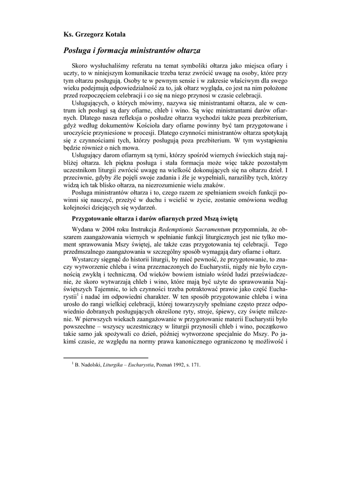 Ks. Grzegorz Kotala Posługa i formacja ministrantów ołtarza Skoro wysłuchaliśmy referatu na temat symboliki ołtarza jako miejsca ofiary i uczty, to w niniejszym komunikacie trzeba teraz zwrócić uwagę na osoby, które przy tym ołtarzu posługują. Osoby te w pewnym sensie i w zakresie właściwym dla swego wieku podejmują odpowiedzialność za to, jak ołtarz wygląda, co jest na nim położone przed rozpoczęciem celebracji i co się na niego przynosi w czasie celebracji. Usługujących, o których mówimy, nazywa się ministrantami ołtarza, ale w centrum ich posługi są dary ofiarne, chleb i wino. Są więc ministrantami darów ofiarnych. Dlatego nasza refleksja o posłudze ołtarza wychodzi także poza prezbiterium, gdyż według dokumentów Kościoła dary ofiarne powinny być tam przygotowane i uroczyście przyniesione w procesji. Dlatego czynności ministrantów ołtarza spotykają się z czynnościami tych, którzy posługują poza prezbiterium. W tym wystąpieniu będzie również o nich mowa. Usługujący darom ofiarnym są tymi, którzy spośród wiernych świeckich stają najbliżej ołtarza. Ich piękna posługa i stała formacja może więc także pozostałym uczestnikom liturgii zwrócić uwagę na wielkość dokonujących się na ołtarzu dzieł. I przeciwnie, gdyby źle pojęli swoje zadania i źle je wypełniali, naraziliby tych, którzy widzą ich tak blisko ołtarza, na niezrozumienie wielu znaków. Posługa ministrantów ołtarza i to, czego razem ze spełnianiem swoich funkcji powinni się nauczyć, przeżyć w duchu i wcielić w życie, zostanie omówiona według kolejności dziejących się wydarzeń. Przygotowanie ołtarza i darów ofiarnych przed Mszą świętą Wydana w 2004 roku Instrukcja Redemptionis Sacramentum przypomniała, że obszarem zaangażowania wiernych w spełnianie funkcji liturgicznych jest nie tylko moment sprawowania Mszy świętej, ale także czas przygotowania tej celebracji. Tego przedmszalnego zaangażowania w szczególny sposób wymagają dary ofiarne i ołtarz. Wystarczy sięgnąć do historii liturgii, by mieć pewność, że przygotowanie, to znaczy wytworzenie chleba i wina przeznaczonych do Eucharystii, nigdy nie było czynnością zwykłą i techniczną. Od wieków bowiem istniało wśród ludzi przeświadczenie, że skoro wytwarzają chleb i wino, które mają być użyte do sprawowania Najświętszych Tajemnic, to ich czynności trzeba potraktować prawie jako część Eucharystii1 i nadać im odpowiedni charakter. W ten sposób przygotowanie chleba i wina urosło do rangi wielkiej celebracji, której towarzyszyły spełniane często przez odpowiednio dobranych posługujących określone ryty, stroje, śpiewy, czy święte milczenie. W pierwszych wiekach zaangażowanie w przygotowanie materii Eucharystii było powszechne – wszyscy uczestniczący w liturgii przynosili chleb i wino, początkowo takie samo jak spożywali co dzień, później wytworzone specjalnie do Mszy. Po jakimś czasie, ze względu na normy prawa kanonicznego ograniczono tę możliwość i 1 B. Nadolski, Liturgika – Eucharystia, Poznań 1992, s. 171. Posługa i formacja ministrantów ołtarza 57 przygotowanie takie stało się zadaniem księży i zakonników. Chodziło nie tylko o pewność zachowania określonej receptury, ale także o odpowiednią dyspozycję moralną. I choć dziś nikt, a tym bardziej ministranci, nie będzie w parafialnych warunkach wypiekał chleba do Eucharystii i wytwarzał wina, to jednak warto posługującym zwrócić uwagę na to przedmszalne przygotowanie darów. Na to, skąd się bierze chleb i wino, jakie one mają być i przede wszystkim, co oznaczają. (W dyskusji, która nastąpi za chwilę, musimy też jednak zapytać, co wspomniana już instrukcja rozumie przez funkcję „przygotowania hostii”, którą dołącza do katalogu liturgicznych posług.) By zwrócić na to uwagę ministrantów, wystarczy przecież, że będą się przyglądać jak zakrystian czy starsi koledzy nakładają chleb do naczyń i nalewają do ampułek wina. Mogą też przygotowane w naczyniach liturgicznych dary zanieść na miejsce, skąd wyruszy procesja w czasie Mszy. Ale trzeba też przybliżyć posługującym przygotowania darów symbolikę chleba i wina. Z przeprowadzonych przeze mnie ankiet wynika, że spośród dzieci szkoły podstawowej i gimnazjum, a są wśród nich ministranci i członkowie wspólnoty Dzieci Bożych, tylko 4,65 procent z nich widząc pokazany im chleb używany do sprawowania Eucharystii nazywa go po prostu chlebem. Większość pojawiających się odpowiedzi typu hostia, opłatek, komunikant nie oddaje chyba tak dobrze prostoty tego znaku, wyrażającego życie człowieka, to, co zwykłe i codzienne, który dopiero w zetknięciu z Bożym działaniem staje się czymś najbardziej niezwykłym. Podobnie warto uwrażliwiać już od najmłodszych lat na znak wina, które jest niezbędne do Eucharystii. Współczesna antykultura alkoholowa sprawia, że młodzi reagują na ten znak żartami i śmiechem. Wszystkie te treści warto wpleść w przebieg spotkań formacyjnych z ministrantami ołtarza. Mogą przecież dokładnie, na tle historii, poznać sposób wytwarzania materii Eucharystii, przybliżyć sobie życiorysy pobożnych władców, którzy sami dbali o chleb i wino do Mszy, w których uczestniczyli. Powinny się także pojawić tu treści związane ze czcią i szacunkiem do chleba, także tego spożywanego na co dzień, oraz problem chrześcijańskiego traktowania ludzi nadużywających alkoholu i pomocy im, na miarę dziecka. Podobnie jeszcze przed Mszą przygotowania wymaga ołtarz. I tu szczególne zadania przypisać można ministrantowi ołtarza. Przede wszystkim powinien on pamiętać, że to ołtarz jest ośrodkiem całej Eucharystii, Jej centrum. Ministranci przeżywają to szczególnie, oddając ołtarzowi cześć przez pokłon. Uczynią go piękniej i przeżyją lepiej, jeśli na miarę ich młodych l