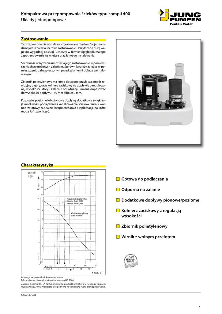 Kompaktowa przepompownia ścieków typu compli 400 Układy jednopompowe Zastosowanie Ta przepompownia została zaprojektowana dla domów jednorodzinnych i znalazła szerokie zastosowanie. Przyłożono dużą wagę do wygodnej obsługi (uchwyty w formie wgłębień), małego zapotrzebowania na miejsce oraz łatwego instalowania. Szczelność urządzenia umożliwia jego zastosowanie w pomieszczeniach zagrożonych zalaniem. Sterownik należy założyć w pomieszczeniu zabezpieczonym przed zalaniem i dobrze wentylowanym Zbiornik polietylenowy ma łatwo dostępne przyłącza, otwór rewizyjny u góry, oraz kołnierz zaciskowy na dopływie o regulowanej wysokości, który - zależnie od sytuacji - można dopasować do wysokości dopływu 180 mm albo 250 mm. Pozostałe, poziome lub pionowe dopływy dodatkowe zwiększają możliwości podłączenia i kanalizowania ścieków. Wirnik wolnoprzelotowy zapewnia bezpieczeństwo eksploatacji, na które mogą Państwo liczyć. Charakterystyka Gotowa do podłączenia Odporna na zalanie Dodatkowe dopływy pionowe/poziome Granica zastosowania Q min. Przewód tłoczny DN80 Przewód tłoczny DN80 Kołnierz zaciskowy z regulacją wysokości Wirnik wolnoprzelotowy 50 Hz 1400 min-1 Zbiornik polietylenowy Wirnik z wolnym przelotem 4 20953-01 Zastrzega się prawo do dokonywania zmian Tolerancja mocy i wydajności zgodna z normą ISO 9906 Zgodnie z normą DIN EN 12056, minimalna prędkość przepływu w rurociągu tłocznym musi wynosić0,7 m/s. Wielkość tą uwzględniono na wykresie Q-H jako granicę stosowania. D 200-3.7–1009 1 Kompaktowa przepompownia ścieków typu compli 400 Układy jednopompowe Kompaktowa przepompownia ścieków Typ compli 400 400 E (prąd przemienny) 400 z wmontowaną klapą zwrotną 400 E (prąd przemienny) z wmontowaną klapą zwrotną Pojemność zbiornika l ok. 64 ok. 64 ok. 64 Wysokość dopływu mm 180/250 180/250 180/250 ok. 64 180/250 Wolny przelot mm 70 70 70 70 Kołnierz zaciskowy na wlocie DN 100 DN 100 DN 100 Wentylacja DN 70 DN 70 DN 70 Masa ok. 55 kg 56 kg 70 kg Nr art. JP 00637 JP 09770 JP 09322 DN 100 DN 70 70 kg JP 09324 Uwaga: compli typu 400 S odpadają z powodu regulowanego na wysokość kołnierza zaciskowego na dopływie Wydajności Typ compli 400 Wysokość tłoczenia H [m] Wydajność [m3/h] 1 48 2 40 3 33 4 27 5 20 6 13 Dane elektryczne Typ compli 400 400 E Rodzaj prądu Napięcie Volt Moc silnika kW Prędkość Prąd Przewód (4 m) Przewód (1,5 m) Wty P1 P2 obrotowa Amper Zbiornik-sterownik Sterownik wtyk czka 3-fazowy 3/N/PE∼400 1,25 przemienny 1/N/PE∼230 1,55 0,87 1,10 1390 min-1 2,2 1428 min-1 7,1 H07RN-F-6G1,5 H07RN-F-4G1,5 H07RN-F-6G1,5 H05VV-F-3G1,5 CEEstyk zabezpieczający Przykład zabudowy Przyłącze bezpośrednie w pomieszczeniu sąsiednim, celem oszczędności miejsca Pozostałe odejścia połączone zostaną z dodatkowym dolotem. Przewód tłoczny powyżej poziomu podpiętrzenia Wentylacja przez dach Do agregatu 3 29748-01 Przewód tłoczny powyżej poziomu podpiętrzenia Wentylacja przez dach Przewód do agregatu 3 29749-01 2 Wszystkie typy wyposażone są w kołnierz przyłaczeniowy DN 80/1PN 10, jednakże z króćcem rurowym DN 100. W przypadku zabudowy bezpośredniej należy więc dobierać klapę zwrotną i zasuwę odcinającą tylko DN 80. Wyprowadzany dalej rurociąg tłoczny połączony jest na DN 100 za pomocą łącznika elastycznego. Przepompownie te należy stosować zgodnie z normą DIN EN 12050 oraz według opisu DIN 1986 T3 w celu kanalizowania domowych ścieków fekalnych. Należy je zabudowywać zgodnie z normą DIN EN 12056-4 ze zbiornikiem kolektorowym wewnątrz budynku, zachowując 60 cm odstęp od ścian w celach obsługi i konserwacji. Rurociąg tłoczny należy wyprowadzić na poziom lokalnego podpiętrzenia i założyć klapę zwrotną spełniającą wymagania normy DIN EN 12050-4 Przewód wentylacyjny należy wyprowadzić na dach, zgodnie z normą DIN EN 12056. Kompaktowa przepompownia ścieków typu compli 400 Układy jednopompowe Osprzęt Nr art. 1 Akumulator do sterownika do instalacji alarmowej niezależnej od sieci 2 Zasuwa dopływowa PCV (z 2 króćcami rurowymi) do dopływu 4“ (DN 100), PN 1 H 360 3 Zasuwa klinowa -GG* po stronie tłocznej 3“ (DN 80), PN 10, DIN EN 1171 H B D 315 180 DN 80 po stronie tłocznej 3 cale 4 JP 07562 B 295 E 60 Klapa zwrotna* R 80 PN 4, kołnierz PN 10, DIN 3202, DIN EN 12050-4 bez przeciwciężaru Klapa zwrotna* R 80 G PN 4, kołnierz PN 10, DIN 3202, DIN EN 12050-4 z regulowanym przeciwciężarem F 81 D 110 JP 28297 JP 00639 JP 00706 H 260 D DN 80 JP 00707 Zawór zwrotny kulowy * K 80 PN 4, kołnierz PN 10, DIN 3202, DIN EN 12050-4 JP 09842 5 Ręczna pompa membranowa do awaryjnego pompowania (do Hgeod 15 m) H E ok. 640430 D 1½” JP 00255 6 Zasuwa odcinająca, 1½“ (DN 40), PN 16 H B D 125 max. 60 1½” JP 11837 7 Łącznik elastyczny 1½“ (DN 40), PN 4 H 120 JP 20368 8 Opaska zaciskowa 1½” D 50 JP 03571 * ze śrubami i uszczelką 3 Kompaktowa przepompownia ścieków typu compli 400 Układy jednopompowe Dane techniczne Pompa Pionowa, jednostopniowa, zatapialna, wirnik z wolnym przelotem, obudowa pierścieniowa z odejściem pionowym DN 100, połączona kołnierzowo ze zbiornikiem polietylenowym posiadającym otwór rewizyjny. wysokości DN 100 dla wysokości dopływu 180/250 mm, dodatkowe dopływy o średnicy 50 mm poziome i pionowe, możliwość dopływu DN 100 od góry, zabudowana pompa zanurzeniowa i kołnierz przyłączeniowy DN 80 z rurą o średnicy 110, na życzenie montowana klapa zwrotna DN 80, po jednym łączniku elastycznym z opaskami zaciskowymi z tworzywa sztucznego oraz mufa nasuwana do przewodu wentylacyjnego DN 70, automat. wyłącznik pływakowy, sterownik (stopień ochrony IP 44) z wyłącznikiem zabezpieczającym silnik, ochroną silnika, transformatorem, instalacją alarmową zależną od sieci z bezpotencjałowym zestykiem do zbiorczego komunikatu o usterce, wskaźnik optyczny kierunku obrotów (dla