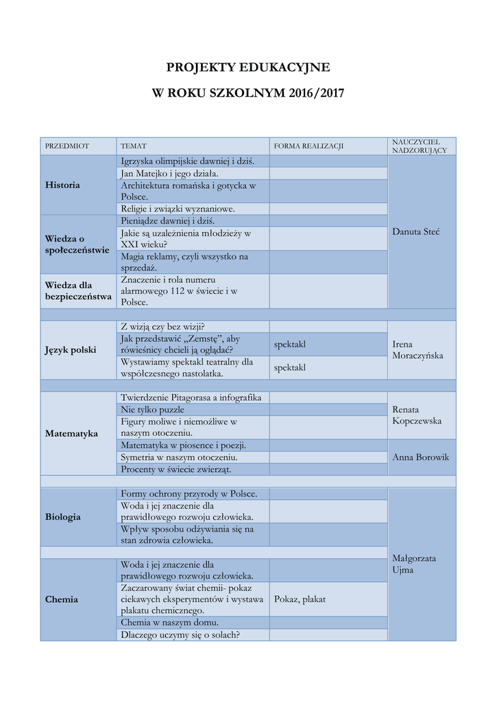 PROJEKTY EDUKACYJNE W ROKU SZKOLNYM 2016/2017 PRZEDMIOT TEMAT FORMA REALIZACJI Igrzyska olimpijskie dawniej i dziś. Jan Matejko i jego działa. Historia Architektura romańska i gotycka w Polsce. Religie i związki wyznaniowe. Pieniądze dawniej i dziś. Jakie są uzależnienia młodzieży w Wiedza o XXI wieku? społeczeństwie Magia reklamy, czyli wszystko na sprzedaż. Znaczenie i rola numeru Wiedza dla alarmowego 112 w świecie i w bezpieczeństwa Polsce. Język polski Matematyka Z wizją czy bez wizji? Jak przedstawić „Zemstę”, aby rówieśnicy chcieli ją oglądać? Wystawiamy spektakl teatralny dla współczesnego nastolatka. Danuta Steć spektakl Biologia Chemia Woda i jej znaczenie dla prawidłowego rozwoju człowieka. Zaczarowany świat chemii- pokaz ciekawych eksperymentów i wystawa plakatu chemicznego. Chemia w naszym domu. Dlaczego uczymy się o solach? Irena Moraczyńska spektakl Twierdzenie Pitagorasa a infografika Nie tylko puzzle Figury moliwe i niemożliwe w naszym otoczeniu. Matematyka w piosence i poezji. Symetria w naszym otoczeniu. Procenty w świecie zwierząt. Formy ochrony przyrody w Polsce. Woda i jej znaczenie dla prawidłowego rozwoju człowieka. Wpływ sposobu odżywiania się na stan zdrowia człowieka. NAUCZYCIEL NADZORUJĄCY Renata Kopczewska Anna Borowik Małgorzata Ujma Pokaz, plakat Zajęcia artystyczne Projekt kartki okolicznościowej. Czy filcowanie może być popularne w naszych czasach? Wielkanoc w sztuce ludowej. Technika Jak zmieniała się moda na przestrzeni XX wieku? Urządzenia techniczne wykorzystujące laser. Informacja techniczna – znaki, symbole. Instrukcje, rysunki techniczne. Jednostki miar i wag na mapie świata. Fizyka Historia elektryczności. Informatyka kartka Wykonanie mapy świata z naniesionymi danymi o pochodzeniu jednostek układu SI Film/przedstawienie/scenki rodzajowe Zjawiska fizyczne – fizyka w ciągu jednej doby. Film edukacyjny Darmowe oprogramowanie tez może być interesujące. Prezentacja multimedialna w dowolnym wolnym oprogramowaniu Jakie zagrożenia niesie Internet? Cyberprzemoc – czy nas dotyczy? Scenki rodzajowe/film Beata Holewa Eine Reise nach Europa. Język niemiecki Du und ich- wir sind Schüler. Kleider machen Menschen. Prezentacja multimedialna Iwona Wota