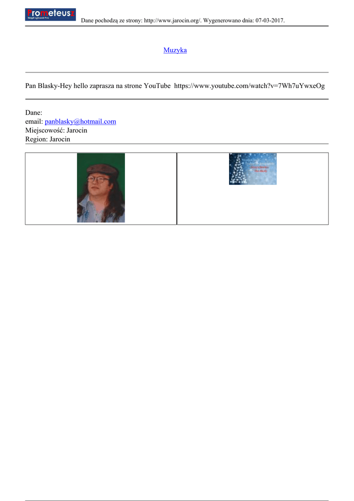 Dane pochodzą ze strony: http://www.jarocin.org/. Wygenerowano dnia: 07-03-2017. Muzyka Pan Blasky-Hey hello zaprasza na strone YouTube https://www.youtube.com/watch?v=7Wh7uYwxeOg Dane: email: [email protected] Miejscowość: Jarocin Region: Jarocin