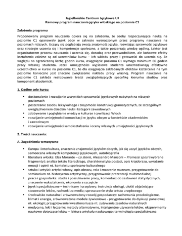 Jagiellońskie Centrum Językowe UJ Ramowy program nauczania języka włoskiego na poziomie C1 Założenia programu Proponowany program nauczania opiera się na założeniu, że osoby rozpoczynające naukę na poziomie C1 opanowały język obcy w zakresie wyznaczonym przez programy nauczania na poziomach niższych. Uczący się pogłębiają swoją znajomość języka, rozwijając sprawności językowe oraz strategie uczenia się i kompetencje społeczne, a także poszerzają wiedzę ogólną. Lektor jest organizatorem procesu nauczania i uczenia się, doradcą oraz przewodnikiem, ale końcowe efekty kształcenia zależne są od uczestników kursu – ich wkładu pracy i gotowości do uczenia się. Ze względu na ograniczoną liczbę godzin kursu, osiągnięcie poziomu C1 wymaga minimum 60 godzin pracy własnej studenta. Jeżeli umiejętności wyjściowe studenta uniemożliwiają efektywne uczestnictwo w kursie na poziomie C1, to dla osiągnięcia zakładanych efektów kształcenia na tym poziomie konieczne jest znaczne zwiększenie nakładu pracy własnej. Program nauczania na poziomie C1 zakłada realizowanie treści uwzględniających specyfikę kierunku studiów oraz komponent akademicki. 1. Ogólne cele kursu: doskonalenie i rozwijanie wszystkich sprawności językowych nabytych na niższych poziomach • poszerzanie zasobu leksykalnego i znajomości konstrukcji gramatycznych, ze szczególnym uwzględnieniem dziedzin nauki i kategorii zawodowych • zdobywanie i pogłębianie wiedzy o kulturze i cywilizacji Włoch • rozwijanie umiejętności komunikacji w języku obcym w kontekście akademickim i zawodowym • rozwijanie umiejętności samokształcenia i oceny własnych umiejętności językowych 2. Treści nauczania: • A. Zagadnienia tematyczne • • • • • • • Europa i interkultura, znaczenie znajomości języków obcych, jak się uczyć języków obcych, samoocena własnych kompetencji językowych, autobiografia literatura włoska: Elsa Morante – La storia, Alessandro Manzoni – Promessi sposi (wybrane fragmenty): analiza tekstu literackiego, charakterystyka postaci, opis krajobrazu, wyrażanie emocji i opinii nt. kontekstu społeczno-‐kulturalnego sztuka i artyści: artyści włoscy, opis obrazu, rola i znaczenie muzeum, przygotowanie do seminarium nt. historyczno-‐artystyczny, przygotowanie prezentacji multimedialnej praca i gospodarka: studia i poszukiwanie pracy, komentarz do zestawień statystycznych, znaczenie wykształcenia, ekonomia a szczęście języki specjalistyczne – techniczny i urzędowy: instrukcja obsługi, ulotki objaśniające stosowanie leków, rachunki za media; uproszczenie stylu tekstu urzędowego środowisko naturalne i zrównoważony rozwój gospodarczy: zachowania proekologiczne, klimat i energia, zrównoważone modele żywieniowe -‐ przygotowanie do dyskusji panelowej nt. ekologii; przygotowanie kwestionariusza nt. zużywania zasobów naturalnych medycyna, leki i leczenie: metody alternatywne, inteligentne używanie leków, eksperymenty naukowe dotyczące leków – lektura artykułu naukowego; terminologia specjalistyczna specjalistyczne języki branżowe: sztuka, medycyna, ekonomia i finanse: analiza cech charakterystycznych, terminologia fachowa • obywatelstwo i prawa człowieka: zaangażowanie i uczestnictwo, konstytucja włoska, zaangażowanie społeczne i polityczne pisarzy (Leonadro Sciascia); zbieranie informacji nt. powstania konstytucji włoskiej; krótki esej nt. wybranego pisarza • informacje z ostatniej chwili: język wiadomości prasowych, język świata polityki, język sportu: lektura i analiza artykułów prasowych, wyrażanie opinii na różne tematy • psychologia i świat młodzieży: rodzice i dzieci, profil społeczno-‐kulturalny współczesnej młodzieży; wywiad, recenzja filmu • historia Włoch i tożsamość narodowa: od zjednoczenia Włoch do obecnych czasów, emigracja i imigracja, przemiany gospodarcze Włoch w lachach 60. tożsamość narodowa -‐ artykuł; zbieranie informacji nt. wybranej postaci historycznej • społeczeństwo: dynamika migracji ludności, mniejszości narodowe; zbieranie informacji nt. dokonujących się zmian społeczno-‐demograficznych; dyskusja i komentarz • literatura i film: badania stanu czytelnictwa, pisarze włoscy wczoraj i dziś, recenzja; artykuł G.Manzoli: Letteratura e cinema; recenzja filmu • nauka i badania naukowe: włoscy naukowcy i wynalazcy; redagowanie tekstu akademickiego, sprawozdanie i esej nt. ważnego dla ludzkości wynalazku B. Zagadnienia gramatyczno-‐leksykalne • • • • • • • • • • • • • • • czasy przeszłe: passato prossimo i imperfetto (w redakcji sprawozdania, raportu, biografii, omówieniu CV) stopniowanie przymiotników: w komentarzu do zestawień statystycznych i sprawozdaniu z dialogu interkulturalnego czas teraźniejszy historyczny (presente storico) i czas imperfetto narracji: w prezentacji biografii i dzieła artysty, w dyskusji podczas seminarium, historii powstania zabytku lub utworu zaimki osobowe łączone: w prezentacji promującej produkt, skierowanej do określonego typu odbiorców zdania złożone podrzędnie – w trybie oznajmujących (indicativo) i łączącym (congiuntivo): z użyciem spójników: benché, anche se czasy zaprzeszłe (trapassato prossimo i trapassato remoto): tekst literacki i historyczny słownictwo: wyrazy złożone: analiza terminologii naukowej wybranych dziedzin; słowotwórstwo z użyciem: przymiotniki zakończone na -‐ are, -‐ario, -‐ ico, -‐ istico, -‐ivo czasowniki „frazeologiczne” z użyciem przyimków a i di: analiza niuansów znaczeniowych tryb łączący (congiuntivo) w zdaniach podrzędnych z użyciem określonych spójników: affinché, benché, sebbene, purché, qualora (wyrażenie opinii nt. doświadczeń i stosowania leków) zaimki względne: che, cui, il/la quale, i/le quali (omówienie treści wybranego artykułu Konstytucji Włoch