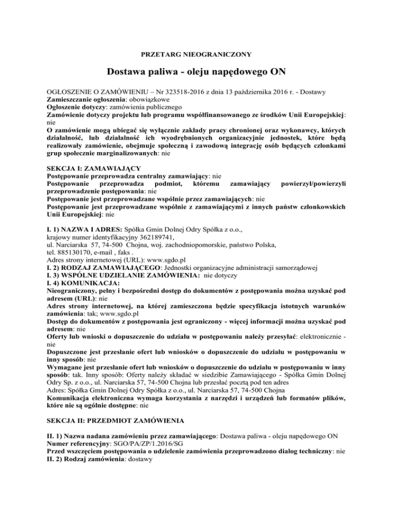 PRZETARG NIEOGRANICZONY Dostawa paliwa - oleju napędowego ON OGŁOSZENIE O ZAMÓWIENIU – Nr 323518-2016 z dnia 13 października 2016 r. - Dostawy Zamieszczanie ogłoszenia: obowiązkowe Ogłoszenie dotyczy: zamówienia publicznego Zamówienie dotyczy projektu lub programu współfinansowanego ze środków Unii Europejskiej: nie O zamówienie mogą ubiegać się wyłącznie zakłady pracy chronionej oraz wykonawcy, których działalność, lub działalność ich wyodrębnionych organizacyjnie jednostek, które będą realizowały zamówienie, obejmuje społeczną i zawodową integrację osób będących członkami grup społecznie marginalizowanych: nie SEKCJA I: ZAMAWIAJĄCY Postępowanie przeprowadza centralny zamawiający: nie Postępowanie przeprowadza podmiot, któremu zamawiający powierzył/powierzyli przeprowadzenie postępowania: nie Postępowanie jest przeprowadzane wspólnie przez zamawiających: nie Postępowanie jest przeprowadzane wspólnie z zamawiającymi z innych państw członkowskich Unii Europejskiej: nie I. 1) NAZWA I ADRES: Spółka Gmin Dolnej Odry Spółka z o.o., krajowy numer identyfikacyjny 362189741, ul. Narciarska 57, 74-500 Chojna, woj. zachodniopomorskie, państwo Polska, tel. 885130170, e-mail , faks . Adres strony internetowej (URL): www.sgdo.pl I. 2) RODZAJ ZAMAWIAJĄCEGO: Jednostki organizacyjne administracji samorządowej I. 3) WSPÓLNE UDZIELANIE ZAMÓWIENIA: nie dotyczy I. 4) KOMUNIKACJA: Nieograniczony, pełny i bezpośredni dostęp do dokumentów z postępowania można uzyskać pod adresem (URL): nie Adres strony internetowej, na której zamieszczona będzie specyfikacja istotnych warunków zamówienia: tak; www.sgdo.pl Dostęp do dokumentów z postępowania jest ograniczony - więcej informacji można uzyskać pod adresem: nie Oferty lub wnioski o dopuszczenie do udziału w postępowaniu należy przesyłać: elektronicznie nie Dopuszczone jest przesłanie ofert lub wniosków o dopuszczenie do udziału w postępowaniu w inny sposób: nie Wymagane jest przesłanie ofert lub wniosków o dopuszczenie do udziału w postępowaniu w inny sposób: tak. Inny sposób: Oferty należy składać w siedzibie Zamawiającego - Spółka Gmin Dolnej Odry Sp. z o.o., ul. Narciarska 57, 74-500 Chojna lub przesłać pocztą pod ten adres Adres: Spółka Gmin Dolnej Odry Spółka z o.o., ul. Narciarska 57, 74-500 Chojna Komunikacja elektroniczna wymaga korzystania z narzędzi i urządzeń lub formatów plików, które nie są ogólnie dostępne: nie SEKCJA II: PRZEDMIOT ZAMÓWIENIA II. 1) Nazwa nadana zamówieniu przez zamawiającego: Dostawa paliwa - oleju napędowego ON Numer referencyjny: SGO/PA/ZP/1.2016/SG Przed wszczęciem postępowania o udzielenie zamówienia przeprowadzono dialog techniczny: nie II. 2) Rodzaj zamówienia: dostawy II. 3) Informacja o możliwości składania ofert częściowych Zamówienie podzielone jest na części: Nie II. 4) Krótki opis przedmiotu zamówienia (wielkość, zakres, rodzaj i ilość dostaw, usług lub robót budowlanych lub określenie zapotrzebowania i wymagań ) a w przypadku partnerstwa innowacyjnego - określenie zapotrzebowania na innowacyjny produkt, usługę lub roboty budowlane: Przedmiotem zmówienia jest dostawa oleju napędowego w ilości 4.200 l miesięcznie na następujących warunkach: 1) paliwo musi spełniać wymagania normy PN-EN 590:2013-12E „Paliwa do pojazdów samochodowych – oleje napędowe – Wymagania i metody badań” oraz Rozporządzenia Ministra Gospodarki z dnia 9 października 2015 r. w sprawie wymagań jakościowych dla paliw ciekłych (Dz. U. 2015.1680) lub przyszłych aktów prawnych zastępujących powyższe; 2) dostawa loco zbiornik dystrybutora Zamawiającego; 3) 1, 2 lub 3 dostawy miesięcznie w zależności od potrzeb; 4) dostawa realizowana w terminie dwóch dni roboczych od dnia przekazania zapotrzebowania przez Zamawiającego; 5) płatność za dostawę odbywać się będzie wg ceny dziennej Wykonawcy pomniejszonej o zaoferowany przez niego upust; 6) Płatność za zrealizowaną dostawę odbywać się będzie w formie przelewu na rachunek Wykonawcy w terminie 14 dni od daty otrzymania faktury przez Zamawiającego. Zamawiający zastrzega sobie możliwość zmniejszenia lub zwiększenia miesięcznej dostawy paliwa o 30% w stosunku do ilości określonej wyżej bez zmiany ceny. II. 5) Główny kod CPV: 09100000-0 II. 7) Czy przewiduje się udzielenie zamówień, o których mowa w art. 67 ust. 1 pkt 6 i 7 lub w art. 134 ust. 6 pkt 3 ustawy Pzp: nie II. 8) Okres, w którym realizowane będzie zamówienie lub okres, na który została zawarta umowa ramowa lub okres, na który został ustanowiony dynamiczny system zakupów: data rozpoczęcia: 01/11/2016 data zakończenia: 31/12/2019 SEKCJA III: INFORMACJE O CHARAKTERZE PRAWNYM, EKONOMICZNYM, FINANSOWYM I TECHNICZNYM III. 1) WARUNKI UDZIAŁU W POSTĘPOWANIU III. 1.1) Kompetencje lub uprawnienia do prowadzenia określonej działalności zawodowej, o ile wynika to z odrębnych przepisów Określenie warunków: Wykonawca spełni ten warunek jeżeli wykaże, że posiada koncesję na obrót paliwami ciekłymi w zakresie objętym niniejszym zamówieniem. Informacje dodatkowe III. 1.2) Sytuacja finansowa lub ekonomiczna Określenie warunków: Zamawiający nie wyznacza szczegółowego warunku w tym zakresie. Informacje dodatkowe III. 1.3) Zdolność techniczna lub zawodowa Określenie warunków: Zamawiający nie wyznacza szczegółowego warunku w tym zakresie. Zamawiający wymaga od wykonawców wskazania w ofercie lub we wniosku o dopuszczenie do udziału w postępowaniu imion i nazwisk osób wykonujących czynności przy realizacji zamówienia wraz z informacją o kwalifikacjach zawodowych lub doświadczeniu tych osób: nie III. 2) PODSTAWY WYKLUCZENIA III. 2.1) Podstawy wykluczenia określone w art. 24 ust. 1 ustawy Pzp III.2.2) Zamawiający przewiduje wykluczenie wykonawcy na podstawie art. 24 ust. 5 ustawy Pzp: tak Zamawiający przewiduje nas
