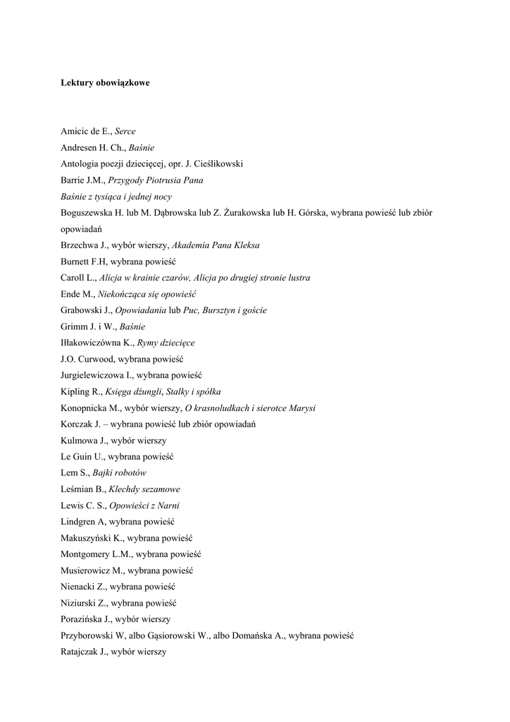 Lektury obowiązkowe Amicic de E., Serce Andresen H. Ch., Baśnie Antologia poezji dziecięcej, opr. J. Cieślikowski Barrie J.M., Przygody Piotrusia Pana Baśnie z tysiąca i jednej nocy Boguszewska H. lub M. Dąbrowska lub Z. Żurakowska lub H. Górska, wybrana powieść lub zbiór opowiadań Brzechwa J., wybór wierszy, Akademia Pana Kleksa Burnett F.H, wybrana powieść Caroll L., Alicja w krainie czarów, Alicja po drugiej stronie lustra Ende M., Niekończąca się opowieść Grabowski J., Opowiadania lub Puc, Bursztyn i goście Grimm J. i W., Baśnie Iłłakowiczówna K., Rymy dziecięce J.O. Curwood, wybrana powieść Jurgielewiczowa I., wybrana powieść Kipling R., Księga dżungli, Stalky i spółka Konopnicka M., wybór wierszy, O krasnoludkach i sierotce Marysi Korczak J. – wybrana powieść lub zbiór opowiadań Kulmowa J., wybór wierszy Le Guin U., wybrana powieść Lem S., Bajki robotów Leśmian B., Klechdy sezamowe Lewis C. S., Opowieści z Narni Lindgren A, wybrana powieść Makuszyński K., wybrana powieść Montgomery L.M., wybrana powieść Musierowicz M., wybrana powieść Nienacki Z., wybrana powieść Niziurski Z., wybrana powieść Porazińska J., wybór wierszy Przyborowski W, albo Gąsiorowski W., albo Domańska A., wybrana powieść Ratajczak J., wybór wierszy Saint-Exupery de A., Mały książę Sienkiewicz H., W pustyni i w puszczy Siesicka K. lub Nowacka E. lub E. Jackiewiczowa, wybrana powieść Stevenson R.L., Wyspa skarbów albo Porwany za młodu Szelburg-Zarębina E., wybór wierszy T. Jansonn, dowolna część z cyklu o Muminkach Terakowska D., wybrana powieść Tolkien J.R.R., Władca pierścieni lub Hobbit Tomaszewska M., wybrana powieść Tuwim J., wybór wierszy Twain M, Przygody Tomka Sawyera albo Przygody Hucka Fina albo Królewicz i żebrak Verne J., wybrana powieść Wawiłow D., wybór wierszy Wybór legend i podań polskich (dowolny) Przykłady współczesnej literatury dziecięcej i młodzieżowej Baśnie braci Grimm Obowiązkowe minimum Jaś i Małgosia, Żabi król, Kopciuszek, Śpiąca królewna, Śnieżka, Titelitury, Gęsiareczka, Gęsiareczka przy studni, Złota gęś, Wierny Jan, Białośnieżka i różyczka, Jednooczka, Dwuoczka i Trójoczka, Braciszek i siostrzyczka, O sześciu łabędziach, Dziewica Milena, Bajka o dwunastu braciach, Woda życia, Baśń o siedmiu krukach, Gryf, Trzej bracia, Wieloskórka, Bajka o dwóch braciach, Pani Zima (Pani Zamieć), Czerwony Kapturek Baśnie H. Ch. Andersena Obowiązkowe minimum Calineczka (Dziecię elfów), Brzydkie kaczątko, Słowik, Dziewczynka z zapałkami, Stokrotka, Imbryk, Krzesiwo, Mała syrena, Królowa śniegu, Księżniczka na ziarnku grochu, Kwiaty małej Idy, Świnia z brązu, Nowe szaty cesarza, Latający kufer, Dzielny ołowiany żołnierzyk, Bzowa Babuleńka, Pasterka i kominiarczyk, Dzikie łabędzie, Kalosze szczęścia, Elf różany, Pięć ziarenek grochu, Opowiadanie o matce, Choinka, Stara latarnia, Obrazek z cytadeli, Ib i Krystynka, Niegodna kobieta, Opowiadanie z diun, Cień, Towarzysz podróży, O dziewczynce, która podeptała chleb