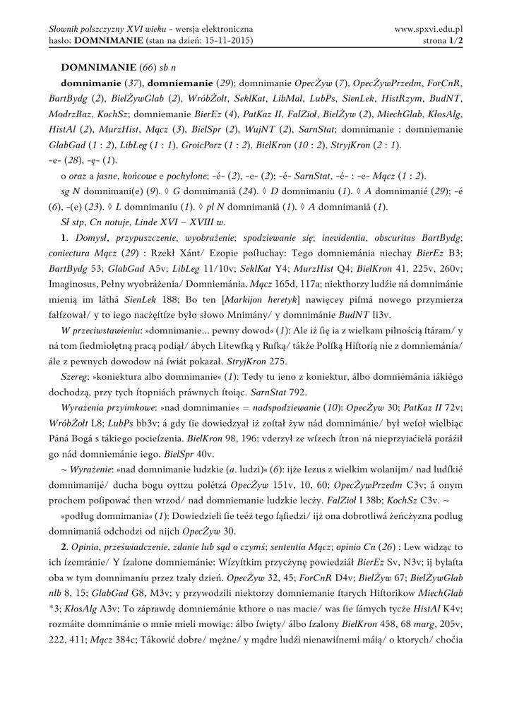 Słownik polszczyzny XVI wieku - wersja elektroniczna hasło: DOMNIMANIE (stan na dzień: 15-11-2015) www.spxvi.edu.pl strona 1/2 DOMNIMANIE (66) sb n domnimanie (37), domniemanie (29); domnimanie OpecŻyw (7), OpecŻywPrzedm, ForCnR, BartBydg (2), BielŻywGlab (2), WróbŻołt, SeklKat, LibMal, LubPs, SienLek, HistRzym, BudNT, ModrzBaz, KochSz; domniemanie BierEz (4), PatKaz II, FalZioł, BielŻyw (2), MiechGlab, KłosAlg, HistAl (2), MurzHist, Mącz (3), BielSpr (2), WujNT (2), SarnStat; domnimanie : domniemanie GlabGad (1 : 2), LibLeg (1 : 1), GroicPorz (1 : 2), BielKron (10 : 2), StryjKron (2 : 1). -e- (28), -ę- (1). o oraz a jasne, końcowe e pochylone; -é- (2), -e- (2); -é- SarnStat, -é- : -e- Mącz (1 : 2). sg N domnimani(e) (9). ◊ G domnimaniå (24). ◊ D domnimaniu (1). ◊ A domnimanié (29); -é (6), -(e) (23). ◊ L domnimaniu (1). ◊ pl N domnimaniå (1). ◊ A domnimaniå (1). Sł stp, Cn notuje, Linde XVI – XVIII w. 1. Domysł, przypuszczenie, wyobrażenie; spodziewanie się; inevidentia, obscuritas BartBydg; coniectura Mącz (29) : Rzekł Xánt/ Ezopie poſłuchay: Tego domniemánia niechay BierEz B3; BartBydg 53; GlabGad A5v; LibLeg 11/10v; SeklKat Y4; MurzHist Q4; BielKron 41, 225v, 260v; Imaginosus, Pełny wyobráżenia/ Domniemánia. Mącz 165d, 117a; niekthorzy ludźie ná domnimánie mienią im láthá SienLek 188; Bo ten [Markijon heretyk] nawięcey piſmá nowego przymierza fałſzował/ y to iego nacżęſtſze było słowo Mnimány/ y domnimánie BudNT Ii3v. W przeciwstawieniu: »domnimanie... pewny dowod« (1): Ale iż ſię ia z wielkam pilnością ſtáram/ y ná tom ſiedmiolętną pracą podiął/ ábych Litewſką y Ruſką/ tákże Polſką Hiſtorią nie z domniemánia/ ále z pewnych dowodow ná ſwiát pokazał. StryjKron 275. Szereg: »koniektura albo domnimanie« (1): Tedy tu ieno z koniektur, álbo domniémánia iákiégo dochodzą, przy tych ſtopniách práwnych ſtoiąc. SarnStat 792. Wyrażenia przyimkowe: »nad domnimanie« = nadspodziewanie (10): OpecŻyw 30; PatKaz II 72v; WróbŻołt L8; LubPs bb3v; á gdy ſie dowiedzyał iż zoſtał żyw nád domnimánie/ był weſoł wielbiąc Páná Bogá s tákiego pocieſzenia. BielKron 98, 196; vderzył ze wſzech ſtron ná nieprzyiaćielá poráźił go nád domniemánie iego. BielSpr 40v. ~ Wyrażenie: »nad domnimanie ludzkie (a. ludzi)« (6): ijże Iezus z wielkim wolanijm/ nad ludſkié domnimanijé/ ducha bogu oyttzu polétzá OpecŻyw 151v, 10, 60; OpecŻywPrzedm C3v; á onym prochem poſipować then wrzod/ nad domniemanie ludzkie lecży. FalZioł I 38b; KochSz C3v. ~ »podług domnimania« (1): Dowiedzieli ſie teéż tego ſąſiedzi/ ijż ona dobrotliwá żeńcżyzna podlug domnimaniá odchodzi od nijch OpecŻyw 30. 2. Opinia, przeświadczenie, zdanie lub sąd o czymś; sententia Mącz; opinio Cn (26) : Lew widząc to ich ſzemránie/ Y ſzalone domniemánie: Wſzyſtkim przycżynę powiedziáł BierEz Sv, N3v; ij bylaſta oba w tym domnimaniu przez tzaly dzień. OpecŻyw 32, 45; ForCnR D4v; BielŻyw 67; BielŻywGlab nlb 8, 15; GlabGad G8, M3v; y przywodzili niektorzy domniemanie ſtarych Hiſtorikow MiechGlab *3; KłosAlg A3v; To záprawdę domniemánie kthore o nas macie/ was ſie ſámych tycże HistAl K4v; rozmáite domnimánie o mnie mieli mowiąc: álbo ſwięty/ álbo ſzalony BielKron 458, 68 marg, 205v, 222, 411; Mącz 384c; Tákowić dobre/ mężne/ y mądre ludźi nienawiſnemi máią/ o ktorych/ choćia Słownik polszczyzny XVI wieku - wersja elektroniczna hasło: DOMNIMANIE (stan na dzień: 15-11-2015) www.spxvi.edu.pl strona 2/2 milcżą/ tego domnimánia ſą/ iákoby o nich źle rozumieli [de se male sentire putent] ModrzBaz [41]; Rádzą mu áby ſię z drugimi oczyśćił/ żeby vſzedł v Zydow złego domniemánia. WujNT 483, 30. W charakterystycznych połączeniach: domnimanie ludzkie (2), niskie, pospolite, rozmaite (3), szalone (2), złe (3). Szereg: »dobra sława i domnimanie« (1): y owſzem im rychley vczyni [zupełny a sprawiedliwy inwentarz] tym lepſzey ſławy y domniemánia będźie v Ludźi GroicPorz ee3v. Wyrażenie przyimkowe: »według domnimania« (3): Ia według domniemánia mego oſądzam to iż obycżáie wáſze więcey ku ſzalonoſći niż ku mądroſći ſie skłániáią. HistAl K4; A do tego dowodu pomoże mi Rzeká Libá y Miáſteczko tegoż przezwiſká ná ſamym vściu tey Rzeki/ [...] ktore według domnimánia/ od tego Liboná fundowáne być mogło. StryjKron 41, 46. 3. praw. Podejrzenie; praesumtio BartBydg; suspectio, suspicio Cn (11) : BierEz K4; Praesumtio, smyaloscz, domnymanye, podeyrzenye BartBydg 122v; BielŻyw 67; LibLeg 11/134; Alye zaſzie mvſzial powroczicz yſ nan domnymanye pewne kradziezi they bilo LibMal 1548/142v; á iáko ma być w tym oſtrożny/ áby vſzedł domnimánia s ſtrony łákomſtwá. GroicPorz c4v, ee4; BielKron 317, 423; y położył on kloc v ogniá áby wſzytcy náń pátrzáli/ áby żadny domnimánia niemiał/ iźeby [!] thám pieniądze były. HistRzym 120v; BielSpr 38. W charakterystycznych połączeniach: pewne domnimanie; ujść domnimania; wyjść z domnimania; karany dla domnimania. Synonimy: 1. domysł, przypuszczenie, wyobrażenie; 2. opinija; 3. podejrzenie. Cf DOMNIMAĆ, 1. NIEDOMNIMANIE SB