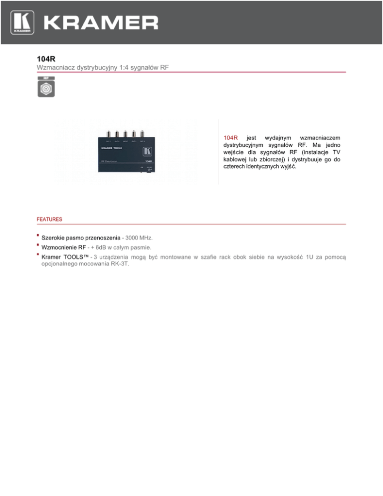 104R Wzmacniacz dystrybucyjny 1:4 sygnałów RF 104R jest wydajnym wzmacniaczem dystrybucyjnym sygnałów RF. Ma jedno wejście dla sygnałów RF (instalacje TV kablowej lub zbiorczej) i dystrybuuje go do czterech identycznych wyjść. FEATURES Szerokie pasmo przenoszenia - 3000 MHz. Wzmocnienie RF - + 6dB w całym pasmie. Kramer TOOLS™ - 3 urządzenia mogą być montowane w szafie rack obok siebie na wysokość 1U za pomocą opcjonalnego mocowania RK-3T. 104R TECHNICAL SPECIFICATIONS WEJŚCIE: 1 RF, 0.5 Vpp/75 Ω (max.) na złączu "F". WYJŚCIA: 4 RF, 0.5 Vpp/75 Ω (max.) na złączach "F". PASMO PRZENOSZENIA (-3dB): 3000 MHz. SPRZĘŻENIE WE/WY: AC. WZMOCNIENIE RF: Typowe +6 dB w całym pasmie. SZUM WŁASNY: 3.5 dB. ZASILANIE: 12 VDC, 80 mA. WYMIARY: 12cm x 7.5cm x 2.5cm (4.7" x 2.95" x 0.98", szer., głęb., wys.) MASA: Ok. 0.32 kg (0.71 lbs). AKCESORIA: Zasilacz 12 VDC, zestaw montażowy. OPCJE: Mocowanie do szaf rack 19" RK-3T.