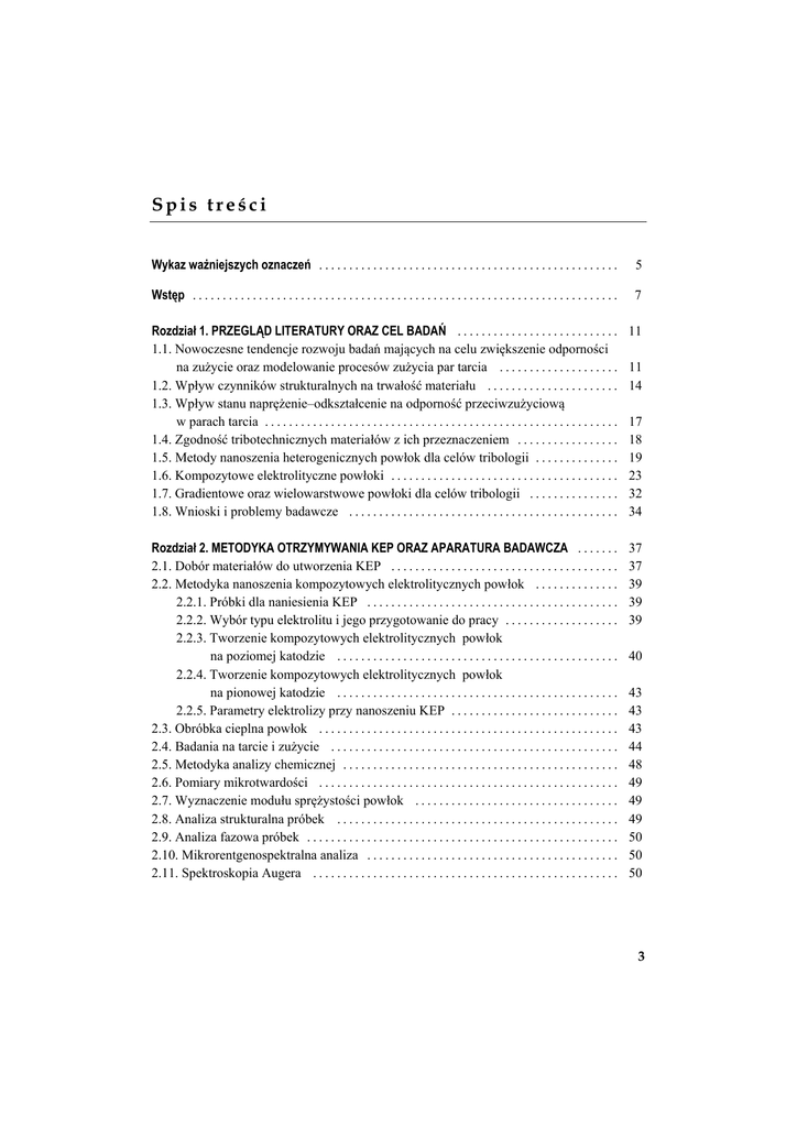 Spis treści Wykaz ważniejszych oznaczeń . . . . . . . . . . . . . . . . . . . . . . . . . . . . . . . . . . . . . . . . . . . . . . . . . . 5 Wstęp . . . . . . . . . . . . . . . . . . . . . . . . . . . . . . . . . . . . . . . . . . . . . . . . . . . . . . . . . . . . . . . . . . . . . . . 7 Rozdział 1. PRZEGLĄD LITERATURY ORAZ CEL BADAŃ . . . . . . . . . . . . . . . . . . . . . . . . . . . 1.1. Nowoczesne tendencje rozwoju badań mających na celu zwiększenie odporności na zużycie oraz modelowanie procesów zużycia par tarcia . . . . . . . . . . . . . . . . . . . . 1.2. Wpływ czynników strukturalnych na trwałość materiału . . . . . . . . . . . . . . . . . . . . . . 1.3. Wpływ stanu naprężenie–odkształcenie na odporność przeciwzużyciową w parach tarcia . . . . . . . . . . . . . . . . . . . . . . . . . . . . . . . . . . . . . . . . . . . . . . . . . . . . . . . . . . . 1.4. Zgodność tribotechnicznych materiałów z ich przeznaczeniem . . . . . . . . . . . . . . . . . 1.5. Metody nanoszenia heterogenicznych powłok dla celów tribologii . . . . . . . . . . . . . . 1.6. Kompozytowe elektrolityczne powłoki . . . . . . . . . . . . . . . . . . . . . . . . . . . . . . . . . . . . . . 1.7. Gradientowe oraz wielowarstwowe powłoki dla celów tribologii . . . . . . . . . . . . . . . 1.8. Wnioski i problemy badawcze . . . . . . . . . . . . . . . . . . . . . . . . . . . . . . . . . . . . . . . . . . . . . 11 Rozdział 2. METODYKA OTRZYMYWANIA KEP ORAZ APARATURA BADAWCZA . . . . . . . 2.1. Dobór materiałów do utworzenia KEP . . . . . . . . . . . . . . . . . . . . . . . . . . . . . . . . . . . . . . 2.2. Metodyka nanoszenia kompozytowych elektrolitycznych powłok . . . . . . . . . . . . . . 2.2.1. Próbki dla naniesienia KEP . . . . . . . . . . . . . . . . . . . . . . . . . . . . . . . . . . . . . . . . . . 2.2.2. Wybór typu elektrolitu i jego przygotowanie do pracy . . . . . . . . . . . . . . . . . . . 2.2.3. Tworzenie kompozytowych elektrolitycznych powłok na poziomej katodzie . . . . . . . . . . . . . . . . . . . . . . . . . . . . . . . . . . . . . . . . . . . . . . . 2.2.4. Tworzenie kompozytowych elektrolitycznych powłok na pionowej katodzie . . . . . . . . . . . . . . . . . . . . . . . . . . . . . . . . . . . . . . . . . . . . . . . 2.2.5. Parametry elektrolizy przy nanoszeniu KEP . . . . . . . . . . . . . . . . . . . . . . . . . . . . 2.3. Obróbka cieplna powłok . . . . . . . . . . . . . . . . . . . . . . . . . . . . . . . . . . . . . . . . . . . . . . . . . . 2.4. Badania na tarcie i zużycie . . . . . . . . . . . . . . . . . . . . . . . . . . . . . . . . . . . . . . . . . . . . . . . . 2.5. Metodyka analizy chemicznej . . . . . . . . . . . . . . . . . . . . . . . . . . . . . . . . . . . . . . . . . . . . . . 2.6. Pomiary mikrotwardości . . . . . . . . . . . . . . . . . . . . . . . . . . . . . . . . . . . . . . . . . . . . . . . . . . 2.7. Wyznaczenie modułu sprężystości powłok . . . . . . . . . . . . . . . . . . . . . . . . . . . . . . . . . . 2.8. Analiza strukturalna próbek . . . . . . . . . . . . . . . . . . . . . . . . . . . . . . . . . . . . . . . . . . . . . . . 2.9. Analiza fazowa próbek . . . . . . . . . . . . . . . . . . . . . . . . . . . . . . . . . . . . . . . . . . . . . . . . . . . . 2.10. Mikrorentgenospektralna analiza . . . . . . . . . . . . . . . . . . . . . . . . . . . . . . . . . . . . . . . . . . 2.11. Spektroskopia Augera . . . . . . . . . . . . . . . . . . . . . . . . . . . . . . . . . . . . . . . . . . . . . . . . . . . 37 37 39 39 39 11 14 17 18 19 23 32 34 40 43 43 43 44 48 49 49 49 50 50 50 3 Rozdział 3. ANALITYCZNE BADANIA STANU NAPRĘŻEŃ I ODKSZTAŁCEŃ JEDNO- I WIELOWARSTWOWYCH POWŁOK . . . . . . . . . . . . . . . . . . . . . . . . . . . 3.1. Stan naprężeń i odkształceń w parach tarcia . . . . . . . . . . . . . . . . . . . . . . . . . . . . . . . . 3.2. Analiza stanu naprężenie–odkształcenie dla kompozytowych materiałów poddanych działaniu sił tarcia . . . . . . . . . . . . . . . . . . . . . . . . . . . . . . . . . . . . . . . . . . . . . 3.2.1. Model materiału kompozytowego i schemat obciążenia . . . . . . . . . . . . . . . . 3.2.2. Przemieszczenia wzdłużne . . . . . . . . . . . . . . . . . . . . . . . . . . . . . . . . . . . . . . . . . . 3.2.3. Ściskanie wzdłużne . . . . . . . . . . . . . . . . . . . . . . . . . . . . . . . . . . . . . . . . . . . . . . . . 3.3. Badania stanu naprężeń i odkształceń wielowarstwowych powłok poddanych siłom tarcia . . . . . . . . . . . . . . . . . . . . . . . . . . . . . . . . . . . . . . . . . . . . . . . . . . 51 51 52 52 54 56 59 Rozdział 4. UTWORZENIE ODPORNYCH NA ZUŻYCIE POWŁOK Z WTRĄCENIAMI SiC ORAZ BADANIE ICH TRIBOTECHNICZNYCH WŁAŚCIWOŚCI . . . . . . . . . . . . . 77 4.1. Wpływ technologicznych parametrów osadzania elektrolitycznego na strukturę powłok . . . . . . . . . . . . . . . . . . . . . . . . . . . . . . . . . . . . . . . . . . . . . . . . . . . . . 77 4.2. Wpływ struktury KEP na ich odporność na zużycie . . . . . . . . . . . . . . . . . . . . . . . . . . 81 4.2.1. Wpływ struktury KEP na zużycie . . . . . . . . . . . . . . . . . . . . . . . . . . . . . . . . . . . . 81 4.2.2. Zależność odporności na zużycie KEP od wielkości cząstek . . . . . . . . . . . . 82 4.3. Badania tribologiczne niklowych powłok zawierających różnorodne cząstki twardej fazy . . . . . . . . . . . . . . . . . . . . . . . . . . . . . . . . . . . . . . . . . . . . . . . . . . . . . 89 4.3.1. Analiza danych z badań tribologicznych na testerze T-01M . . . . . . . . . . . . . 92 4.3.2. Zależność odporności na zużycie KEP od zawartości fazy wzmacniającej . . . 94 4.3.3. Optymalna budowa (struktura) powłok i wpływ odporności na zużycie . . . . 98 4.4. Tworzenie wielowarstwowych powłok gradientowych . . . . . . . . . . . . . . . . . . . . . . . 103 4.5. Analiza składu chemicznego z powierzchni tarcia . . . . . . . . . . . . . . . . . 
