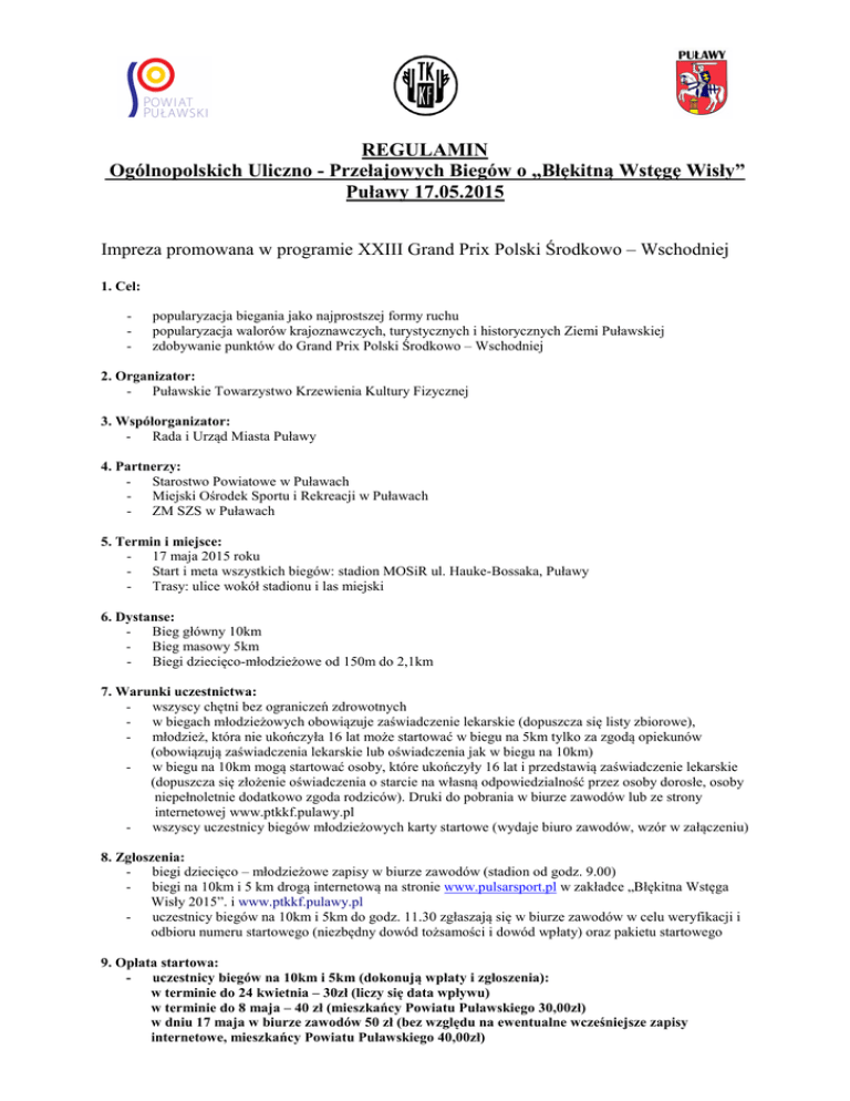 REGULAMIN Ogólnopolskich Uliczno - Przełajowych Biegów o „Błękitną Wstęgę Wisły” Puławy 17.05.2015 Impreza promowana w programie XXIII Grand Prix Polski Środkowo – Wschodniej 1. Cel: - popularyzacja biegania jako najprostszej formy ruchu popularyzacja walorów krajoznawczych, turystycznych i historycznych Ziemi Puławskiej zdobywanie punktów do Grand Prix Polski Środkowo – Wschodniej 2. Organizator: - Puławskie Towarzystwo Krzewienia Kultury Fizycznej 3. Współorganizator: Rada i Urząd Miasta Puławy 4. Partnerzy: Starostwo Powiatowe w Puławach - Miejski Ośrodek Sportu i Rekreacji w Puławach - ZM SZS w Puławach 5. Termin i miejsce: - 17 maja 2015 roku - Start i meta wszystkich biegów: stadion MOSiR ul. Hauke-Bossaka, Puławy - Trasy: ulice wokół stadionu i las miejski 6. Dystanse: - Bieg główny 10km - Bieg masowy 5km - Biegi dziecięco-młodzieżowe od 150m do 2,1km 7. Warunki uczestnictwa: wszyscy chętni bez ograniczeń zdrowotnych w biegach młodzieżowych obowiązuje zaświadczenie lekarskie (dopuszcza się listy zbiorowe), młodzież, która nie ukończyła 16 lat może startować w biegu na 5km tylko za zgodą opiekunów (obowiązują zaświadczenia lekarskie lub oświadczenia jak w biegu na 10km) w biegu na 10km mogą startować osoby, które ukończyły 16 lat i przedstawią zaświadczenie lekarskie (dopuszcza się złożenie oświadczenia o starcie na własną odpowiedzialność przez osoby dorosłe, osoby niepełnoletnie dodatkowo zgoda rodziców). Druki do pobrania w biurze zawodów lub ze strony internetowej www.ptkkf.pulawy.pl wszyscy uczestnicy biegów młodzieżowych karty startowe (wydaje biuro zawodów, wzór w załączeniu) 8. Zgłoszenia: - biegi dziecięco – młodzieżowe zapisy w biurze zawodów (stadion od godz. 9.00) - biegi na 10km i 5 km drogą internetową na stronie www.pulsarsport.pl w zakładce „Błękitna Wstęga Wisły 2015”. i www.ptkkf.pulawy.pl uczestnicy biegów na 10km i 5km do godz. 11.30 zgłaszają się w biurze zawodów w celu weryfikacji i odbioru numeru startowego (niezbędny dowód tożsamości i dowód wpłaty) oraz pakietu startowego 9. Opłata startowa: uczestnicy biegów na 10km i 5km (dokonują wpłaty i zgłoszenia): w terminie do 24 kwietnia – 30zł (liczy się data wpływu) w terminie do 8 maja – 40 zł (mieszkańcy Powiatu Puławskiego 30,00zł) w dniu 17 maja w biurze zawodów 50 zł (bez względu na ewentualne wcześniejsze zapisy internetowe, mieszkańcy Powiatu Puławskiego 40,00zł) Opłatę należy wpłacić na konto PTKKF nr 57 1020 3219 0000 9502 0043 1007 w PKO BP S.A. o/Puławy z podaniem imiennie i nazwiska oraz dopiskiem „Błękitna Wstęga Wisły” 10. Kategorie wiekowe: - biegi młodzieżowe osobno chłopcy i dziewczęta 2004 i młodsi (-sze), 2002-2003, 2001, 2000-1999, 1995-1998 - bieg na 5km: kobiety open, mężczyźni open - bieg na 10km: kobiety open, do 35 lat (1980 i młodsze), 36 lat i starsze (1979 i starsze) Mężczyźni open oraz M1 16-29lat (1999-1986); M2 30-39 lat (1985-1976); M3 40-49 lat (1975-1966), M4 50-59 lat (1965-1956), M5 60 lat i starsi (1955 i starsi) 11. Klasyfikacja: - punktuje 30 zawodników w każdym biegu rywalizacji indywidualnej: Im-35pkt; IIm-32pkt; IIIm-29pkt; IVm-27pkt; Vm-26pkt ……XXXm-1pkt. 12. Opis tras: asfalt, kostka, w lesie podłoże twarde i piaszczyste; trasa mało zróżnicowana Trasa I – stadion, Hauke-Bossaka, stadion (ok. 500m) Trasa II – stadion, Hauke-Bossaka, Bema, Kościuszki, Dąbrowskiego, Hauke-Bossaka, stadion (ok. 1050m) Trasa III – stadion, Hauke-Bossaka, Bema, Kościuszki, Sowińskiego, Hauke Bossaka, stadion (1350m) Trasa IV – stadion, Hauke-Bossaka, Bema, Kościuszki, Sowińskiego, las miejski, Hauke Bossaka, stadion (2500m) Pomiar czasu w biegach na 10km i 5km elektroniczny za pomocą zwrotnych czipów. 13. Nagrody: - wszyscy uczestnicy biegów młodzieżowych otrzymują dyplomy uczestnictwa - biegi młodzieżowe miejsca I – III medale, dyplomy, nagrody rzeczowe, IV – VI dyplomy, upominki - bieg na 5km; Kobiety i Mężczyźni za miejsca I – III; puchary, nagrody rzeczowe - bieg na 10km: kobiety i mężczyźni open za miejsca I – VI nagrody finansowe, puchary; kategorie wiekowe kobiet i mężczyzn: za miejsca I – III, puchary, nagrody rzeczowe (ew. za Im nagroda finansowa) - nagrody specjalne dla zwycięzców klasyfikacji: najlepsi puławianie, najlepsi nauczyciele, najstarsi uczestnicy (osobno kobiety i mężczyźni w biegu na 10km) 14. Finanse: - koszty organizacyjne pokrywają organizatorzy - przejazdy i inne koszty własne pokrywają uczestnicy 15. Uwagi końcowe: - wszyscy uczestnicy są ubezpieczeni na czas biegu - organizator zabezpiecza przebieralnię, ale nie bierze odpowiedzialności za pozostawiony tam sprzęt, odzież itp. - impreza odbywa się bez względu na pogodę - organizator zabezpiecza sobie prawo do zmiany regulaminu nagradzania - pobranie numeru startowego oznacza akceptację regulaminu, zgodę na przetwarzanie danych osobowych oraz wykorzystanie wizerunku uczestników dla potrzeb Biegu i Organizatora - w sprawach spornych i nie ujętych w regulaminie decyduje organizator - protesty można składać wyłącznie w formie pisemnej po wpłaceniu kaucji (100 zł) do sędziego głównego w ciągu 0,5 godz. po zakończeniu biegu. Inne formy nie będą rozpatrywane. W przypadku nie uznania protestu, kaucja nie podlega zwrotowi - organizator zastrzega sobie prawo odmowy dopuszczenia do biegu zawodnika, który w rażący sposób naruszył regulamin dowolnego biegu zgłoszonego do kalendarza PSB lub swoim zachowaniem zakłóca przebieg imprezy - pomoc medyczna będzie dostępna w czasie trwania biegu, szatnia-przebieralnia, natryski, posiłek po biegu – pomieszczania pływalni MOSiR - Wszyscy uczestnicy biegów na 10km i 5km w ramach opłaty startowej otrzymują pakiet startowy (medal, koszulka, numer startowy, bon na posiłek) - wpłacona opłata startowa nie podlega zwrotowi - w pr