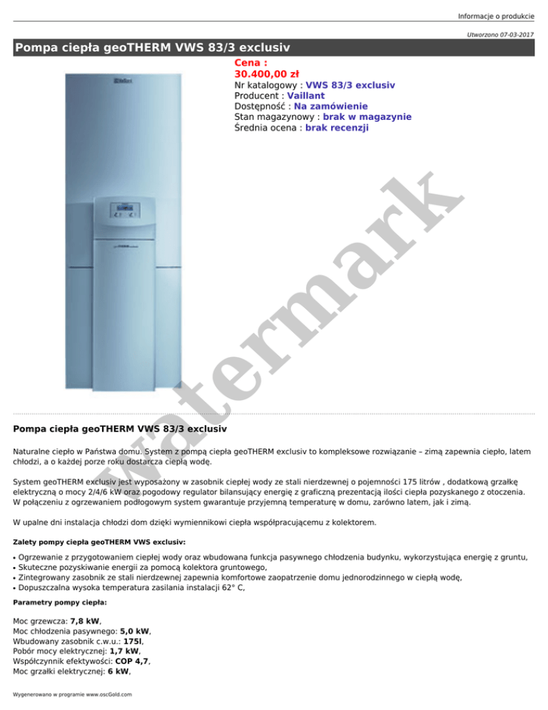 Informacje o produkcie Utworzono 07-03-2017 Pompa ciepła geoTHERM VWS 83/3 exclusiv Cena : 30.400,00 zł at er m ar k Nr katalogowy : VWS 83/3 exclusiv Producent : Vaillant Dostępność : Na zamówienie Stan magazynowy : brak w magazynie Średnia ocena : brak recenzji Pompa ciepła geoTHERM VWS 83/3 exclusiv w Naturalne ciepło w Państwa domu. System z pompą ciepła geoTHERM exclusiv to kompleksowe rozwiązanie – zimą zapewnia ciepło, latem chłodzi, a o każdej porze roku dostarcza ciepłą wodę. System geoTHERM exclusiv jest wyposażony w zasobnik ciepłej wody ze stali nierdzewnej o pojemności 175 litrów , dodatkową grzałkę elektryczną o mocy 2/4/6 kW oraz pogodowy regulator bilansujący energię z graficzną prezentacją ilości ciepła pozyskanego z otoczenia. W połączeniu z ogrzewaniem podłogowym system gwarantuje przyjemną temperaturę w domu, zarówno latem, jak i zimą. W upalne dni instalacja chłodzi dom dzięki wymiennikowi ciepła współpracującemu z kolektorem. Zalety pompy ciepła geoTHERM VWS exclusiv: ● ● ● ● Ogrzewanie z przygotowaniem ciepłej wody oraz wbudowana funkcja pasywnego chłodzenia budynku, wykorzystująca energię z gruntu, Skuteczne pozyskiwanie energii za pomocą kolektora gruntowego, Zintegrowany zasobnik ze stali nierdzewnej zapewnia komfortowe zaopatrzenie domu jednorodzinnego w ciepłą wodę, Dopuszczalna wysoka temperatura zasilania instalacji 62° C, Parametry pompy ciepła: Moc grzewcza: 7,8 kW, Moc chłodzenia pasywnego: 5,0 kW, Wbudowany zasobnik c.w.u.: 175l, Pobór mocy elektrycznej: 1,7 kW, Współczynnik efektywości: COP 4,7, Moc grzałki elektrycznej: 6 kW, Wygenerowano w programie www.oscGold.com Zawiera ogranicznik prądu rozruchowego. Opis produktu: Instalacja: Źródło ciepła: Pobór energii cieplnej z pionowych, gruntowych wymienników ciepła lub kolektorów poziomych, gruntowych (solanka /woda). Komfort obsługi: Wskazania: Podświetlany wyświetlacz graficzny ze wskazaniem stanu urządzenia i nastawień: seryjnie montowany pogodowy regulator bilansu energii steruje wszystkimi funkcjami, zapewniając najwyższy komfort ogrzewania i chłodzenia. Do wyboru zdalny nadzór przez moduł vrnetDIALOG. er m ar k Zakres zastosowań: Warunki: Zależnie od wielkości posesji i właściwości gruntu stosuje się sondy lub kolektory gruntowe. Typ budynków: domy jednorodzinne. Chłodzenie pasywne (bez udziału sprężarki): z wykorzystaniem instalacji ogrzewania podłogowego. Środowisko: w at Wysoka wydajność: 75% wytwarzanej energii cieplnej pochodzi ze środowiska naturalnego, tylko 25% energii trzeba uzyskać z dodatkowych źródeł. Brak emisji zanieczyszczeń w miejscu instalacji. Walory ekonomiczne: Wysoka niezawodność dzięki nowoczesnej, trwałej sprężarce dedykowanej dp pomp ciepła Scroll Copeland ZH. Czynnik roboczy: Zastosowano bezpieczny czynnik R407C, nieszkodliwy dla warstwy ozonowej.