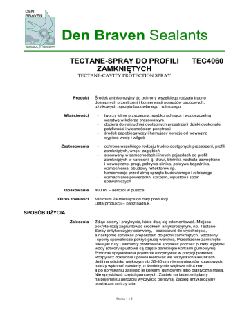 Den Braven Sealants TECTANE-SPRAY DO PROFILI ZAMKNIĘTYCH TEC4060 TECTANE-CAVITY PROTECTION SPRAY Produkt Właściwości Środek antykorozyjny do ochrony wszelkiego rodzaju trudno dostępnych przestrzeni i konserwacji pojazdów osobowych, użytkowych, sprzętu budowlanego i rolniczego - Zastosowania - - Opakowanie Okres trwałości tworzy silnie przyczepną, szybko schnącą i wodoszczelną warstwę w kolorze brązowawym dociera do najtrudniej dostępnych przestrzeni dzięki doskonałej pełzliwości i własnościom penetracji środek zapobiegawczy i hamujący korozję od wewnątrz wypiera wodę i wilgoć ochrona wszelkiego rodzaju trudno dostępnych przestrzeni, profili zamkniętych, wnęk, zagłębień stosowany w samochodach i innych pojazdach do profili zamkniętych w karoserii, tj. drzwi, błotniki, nadkola zewnętrzne i wewnętrzne, progi, pokrywa silnika, pokrywa bagażnika, wzmocnienia, obudowy reflektorów itp. konserwacja przed zimą sprzętu budowlanego i rolniczego wzmacnianie powierzchni szczelin, wpustów i spoin spawalniczych 400 ml – aerozol w puszce Minimum 24 miesiące od daty produkcji. Data produkcji – patrz nadruk. SPOSÓB UŻYCIA Zalecenia Zdjąć osłony i przykrycia, które dają się zdemontować. Miejsca pokryte rdzą zagruntować środkiem antykorozyjnym, np. TectaneSpray antykorozyjny czerwony, i pozostawić do wyschnięcia, a następnie spryskać preparatem do profili zamkniętych. Szczeliny i spoiny spawalnicze pokryć grubą warstwą. Przestrzenie zamknięte, takie jak rury i elementy profilowane spryskać poprzez punkty wypływu wody (otwory spustowe są często zamknięte korkami gumowymi). Podczas spryskiwania pojemnik utrzymywać w pozycji pionowej. Rozpylacz dokładnie i powoli kierować we wszystkich kierunkach. Jeśli na odcinku większym niż 35-40 cm nie ma otworów spustowych, należy wykonać nawierty, o średnicy nie większe niż 4 mm, a po spryskaniu zaślepić je korkami gumowymi albo plastyczna masą. Nie spryskiwać części gumowych. Zacieki na lakierze i plamy na pojemniku aerozolu wyczyścić benzyną. Zabieg antykorozyjny powtarzać co trzy lata. Strona 1 z 2 TECTANE SPRAY DO PROFILI ZAMKNIĘTYCH, TEC4060 Bezpieczeństwo ogólne ATEST Patrz: Karta charakterystyki TEC4060 UWAGA: Chronić przed dziećmi. Państwowy Zakład Higieny Odpowiedzialność: Podane informacje są wynikiem badań i doświadczeń Den Braven Sealants, co jest podstawą ich rzetelności i wiarygodności. Producent nie mógł przewidzieć jednak wszystkich możliwości zastosowania swoich produktów, a ponieważ sposób użycia produktów jest całkowicie poza jego kontrolą, użytkownik bierze na siebie odpowiedzialność za właściwy wybór i zastosowanie produktu. Producent nie bierze na siebie odpowiedzialności za występujące uszkodzenia lub zły stan podłoża, które mogą być wynikiem czynników atmosferycznych, przygotowania wstępnego lub wad konstrukcyjnych. 5/08/2011 Strona 2 z 2