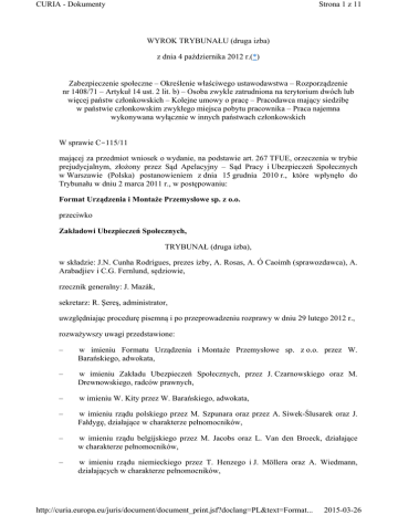 CURIA - Dokumenty Strona 1 z 11 WYROK TRYBUNAŁU (druga izba) z dnia 4 października 2012 r.(*) Zabezpieczenie społeczne – Określenie właściwego ustawodawstwa – Rozporządzenie nr 1408/71 – Artykuł 14 ust. 2 lit. b) – Osoba zwykle zatrudniona na terytorium dwóch lub więcej państw członkowskich – Kolejne umowy o pracę – Pracodawca mający siedzibę w państwie członkowskim zwykłego miejsca pobytu pracownika – Praca najemna wykonywana wyłącznie w innych państwach członkowskich W sprawie C-115/11 mającej za przedmiot wniosek o wydanie, na podstawie art. 267 TFUE, orzeczenia w trybie prejudycjalnym, złożony przez Sąd Apelacyjny – Sąd Pracy i Ubezpieczeń Społecznych w Warszawie (Polska) postanowieniem z dnia 15 grudnia 2010 r., które wpłynęło do Trybunału w dniu 2 marca 2011 r., w postępowaniu: Format Urządzenia i Montaże Przemysłowe sp. z o.o. przeciwko Zakładowi Ubezpieczeń Społecznych, TRYBUNAŁ (druga izba), w składzie: J.N. Cunha Rodrigues, prezes izby, A. Rosas, A. Ó Caoimh (sprawozdawca), A. Arabadjiev i C.G. Fernlund, sędziowie, rzecznik generalny: J. Mazák, sekretarz: R. Şereş, administrator, uwzględniając procedurę pisemną i po przeprowadzeniu rozprawy w dniu 29 lutego 2012 r., rozważywszy uwagi przedstawione: – w imieniu Formatu Urządzenia i Montaże Przemysłowe sp. z o.o. przez W. Barańskiego, adwokata, – w imieniu Zakładu Ubezpieczeń Społecznych, przez J. Czarnowskiego oraz M. Drewnowskiego, radców prawnych, – w imieniu W. Kity przez W. Barańskiego, adwokata, – w imieniu rządu polskiego przez M. Szpunara oraz przez A. Siwek-Ślusarek oraz J. Fałdygę, działające w charakterze pełnomocników, – w imieniu rządu belgijskiego przez M. Jacobs oraz L. Van den Broeck, działające w charakterze pełnomocników, – w imieniu rządu niemieckiego przez T. Henzego i J. Möllera oraz A. Wiedmann, działających w charakterze pełnomocników, http://curia.europa.eu/juris/document/document_print.jsf?doclang=PL&text=Format... 2015-03-26 CURIA - Dokumenty – Strona 2 z 11 w imieniu Komisji Europejskiej przez V. Kreuschitza oraz M. Owsiany-Hornung, działających w charakterze pełnomocników, po zapoznaniu się z opinią rzecznika generalnego na posiedzeniu w dniu 3 maja 2012 r., wydaje następujący Wyrok 1 Wniosek o wydanie orzeczenia w trybie prejudycjalnym dotyczy wykładni art. 14 ust. 2 lit. b) rozporządzenia Rady (EWG) nr 1408/71 z dnia 14 czerwca 1971 r. w sprawie stosowania systemów zabezpieczenia społecznego do pracowników najemnych, osób prowadzących działalność na własny rachunek i do członków ich rodzin przemieszczających się we Wspólnocie, w wersji zmienionej i uaktualnionej rozporządzeniem Rady (WE) nr 118/97 z dnia 2 grudnia 1996 r. (Dz.U. 1997, L 28, s. 1), ze zmianami wprowadzonymi rozporządzeniem (WE) nr 1992/2006 Parlamentu Europejskiego i Rady z dnia 18 grudnia 2006 r. (Dz.U. L 392, s. 1) (zwanego dalej „rozporządzeniem nr 1408/71”). 2 Wniosek ten został złożony w ramach sporu między spółką Format Urządzenia i Montaże Przemysłowe sp. z o.o. (zwaną dalej „spółką Format”), przy udziale jednego z jej pracowników, Wiesława Kity, a Zakładem Ubezpieczeń Społecznych (zwanym dalej „ZUS”), dotyczącego określenia ustawodawstwa właściwego w rozumieniu tego rozporządzenia w sytuacji W. Kity. Ramy prawne 3 Zgodnie z motywem szóstym rozporządzenia nr 1408/71 przepisy ustanowione w celu koordynacji powinny gwarantować pracownikom przemieszczającym się we Wspólnocie Europejskiej, osobom pozostającym na ich utrzymaniu oraz osobom pozostałym przy życiu po ich śmierci utrzymanie nabytych lub będących w trakcie nabywania praw i korzyści. 4 W myśl motywu siódmego tego rozporządzenia cele te powinny zostać osiągnięte w szczególności poprzez sumowanie wszystkich okresów uwzględnianych przez poszczególne ustawodawstwa krajowe do celów powstania i zachowania prawa do świadczeń. 5 Z motywu ósmego rzeczonego rozporządzenia wynika, że jego przepisy służą temu, aby zainteresowani byli co do zasady objęci systemem zabezpieczenia społecznego tylko jednego państwa członkowskiego, a to w celu uniknięcia zbiegu właściwych ustawodawstw krajowych i wynikających z tego komplikacji. 6 Artykuł 1 lit. h) rozporządzenia nr 1408/71 przewiduje, że do celów jego stosowania określenie „zamieszkanie” oznacza zwykły pobyt. 7 Artykuł 13 omawianego rozporządzenia, zatytułowany „Zasady ogólne”, zawarty w jego tytule II, zatytułowanym „Określenie właściwego ustawodawstwa”, stanowi: „1. Z zastrzeżeniem art. 14c i 14f osoby, do których stosuje się niniejsze rozporządzenie, podlegają ustawodawstwu tylko jednego państwa członkowskiego. Ustawodawstwo określa się zgodnie z przepisami niniejszego tytułu. 2. Z zastrzeżeniem przepisów art. 14–17: http://curia.europa.eu/juris/document/document_print.jsf?doclang=PL&text=Format... 2015-03-26 CURIA - Dokumenty a) Strona 3 z 11 pracownik najemny zatrudniony na terytorium jednego państwa członkowskiego podlega ustawodawstwu tego państwa, nawet jeżeli zamieszkuje na terytorium innego państwa członkowskiego lub jeżeli przedsiębiorstwo lub pracodawca, który go zatrudnia, ma swoją zarejestrowaną siedzibę lub miejsce prowadzenia działalności na terytorium innego państwa członkowskiego; […] f) 8 osoba, która przestaje podlegać ustawodawstwu państwa członkowskiego, a nie podlega ustawodawstwu innego państwa członkowskiego zgodnie z jedną z zasad ustanowionych w akapitach poprzednich lub zgodnie z jednym z wyjątków lub przepisów szczególnych, określonych w art. 14–17, podlega ustawodawstwu państwa członkowskiego, na którego terytorium zamieszkuje, wyłącznie zgodnie z przepisami tego ustawodawstwa”. Zawarty w tym samym tytule art. 14 rozporządzenia nr 1408/71, zatytułowany „Zasady szczególne stosowane do osób, innych niż marynarze, 