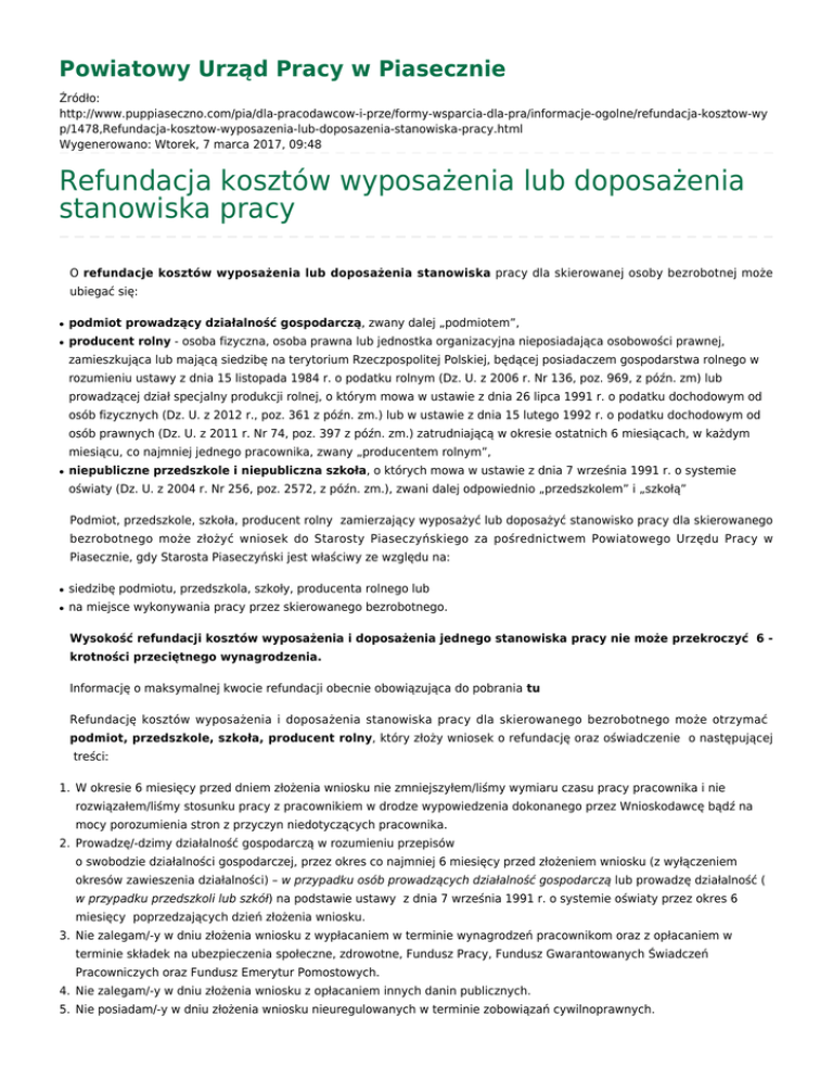 Powiatowy Urząd Pracy w Piasecznie Źródło: http://www.puppiaseczno.com/pia/dla-pracodawcow-i-prze/formy-wsparcia-dla-pra/informacje-ogolne/refundacja-kosztow-wy p/1478,Refundacja-kosztow-wyposazenia-lub-doposazenia-stanowiska-pracy.html Wygenerowano: Wtorek, 7 marca 2017, 09:48 Refundacja kosztów wyposażenia lub doposażenia stanowiska pracy O refundacje kosztów wyposażenia lub doposażenia stanowiska pracy dla skierowanej osoby bezrobotnej może ubiegać się: ● podmiot prowadzący działalność gospodarczą, zwany dalej „podmiotem”, ● producent rolny - osoba fizyczna, osoba prawna lub jednostka organizacyjna nieposiadająca osobowości prawnej, zamieszkująca lub mającą siedzibę na terytorium Rzeczpospolitej Polskiej, będącej posiadaczem gospodarstwa rolnego w rozumieniu ustawy z dnia 15 listopada 1984 r. o podatku rolnym (Dz. U. z 2006 r. Nr 136, poz. 969, z późn. zm) lub prowadzącej dział specjalny produkcji rolnej, o którym mowa w ustawie z dnia 26 lipca 1991 r. o podatku dochodowym od osób fizycznych (Dz. U. z 2012 r., poz. 361 z późn. zm.) lub w ustawie z dnia 15 lutego 1992 r. o podatku dochodowym od osób prawnych (Dz. U. z 2011 r. Nr 74, poz. 397 z późn. zm.) zatrudniającą w okresie ostatnich 6 miesiącach, w każdym miesiącu, co najmniej jednego pracownika, zwany „producentem rolnym”, ● niepubliczne przedszkole i niepubliczna szkoła, o których mowa w ustawie z dnia 7 września 1991 r. o systemie oświaty (Dz. U. z 2004 r. Nr 256, poz. 2572, z późn. zm.), zwani dalej odpowiednio „przedszkolem” i „szkołą” Podmiot, przedszkole, szkoła, producent rolny zamierzający wyposażyć lub doposażyć stanowisko pracy dla skierowanego bezrobotnego może złożyć wniosek do Starosty Piaseczyńskiego za pośrednictwem Powiatowego Urzędu Pracy w Piasecznie, gdy Starosta Piaseczyński jest właściwy ze względu na: ● siedzibę podmiotu, przedszkola, szkoły, producenta rolnego lub ● na miejsce wykonywania pracy przez skierowanego bezrobotnego. Wysokość refundacji kosztów wyposażenia i doposażenia jednego stanowiska pracy nie może przekroczyć 6 krotności przeciętnego wynagrodzenia. Informację o maksymalnej kwocie refundacji obecnie obowiązująca do pobrania tu Refundację kosztów wyposażenia i doposażenia stanowiska pracy dla skierowanego bezrobotnego może otrzymać podmiot, przedszkole, szkoła, producent rolny, który złoży wniosek o refundację oraz oświadczenie o następującej treści: 1. W okresie 6 miesięcy przed dniem złożenia wniosku nie zmniejszyłem/liśmy wymiaru czasu pracy pracownika i nie rozwiązałem/liśmy stosunku pracy z pracownikiem w drodze wypowiedzenia dokonanego przez Wnioskodawcę bądź na mocy porozumienia stron z przyczyn niedotyczących pracownika. 2. Prowadzę/-dzimy działalność gospodarczą w rozumieniu przepisów o swobodzie działalności gospodarczej, przez okres co najmniej 6 miesięcy przed złożeniem wniosku (z wyłączeniem okresów zawieszenia działalności) – w przypadku osób prowadzących działalność gospodarczą lub prowadzę działalność ( w przypadku przedszkoli lub szkół) na podstawie ustawy z dnia 7 września 1991 r. o systemie oświaty przez okres 6 miesięcy poprzedzających dzień złożenia wniosku. 3. Nie zalegam/-y w dniu złożenia wniosku z wypłacaniem w terminie wynagrodzeń pracownikom oraz z opłacaniem w terminie składek na ubezpieczenia społeczne, zdrowotne, Fundusz Pracy, Fundusz Gwarantowanych Świadczeń Pracowniczych oraz Fundusz Emerytur Pomostowych. 4. Nie zalegam/-y w dniu złożenia wniosku z opłacaniem innych danin publicznych. 5. Nie posiadam/-y w dniu złożenia wniosku nieuregulowanych w terminie zobowiązań cywilnoprawnych. 6. W okresie 2 lat przed dniem złożenia wniosku nie byłem/byliśmy karani za przestępstwa przeciwko obrotowi gospodarczemu, w rozumieniu ustawy z dnia 6 czerwca 1997 r.- Kodeks Karny (Dz. U. nr 88, poz. 553 z późn. zm.) lub ustawy z dnia 28 października 2002 r. o odpowiedzialności podmiotów zbiorowych za czyny zbiorowe pod groźbą kary (Dz. U. Nr 197, poz. 1661 z późn.z m). W ramach refundacji kosztów wyposażenia i doposażenia stanowiska pracy zatrudnienie mogą uzyskać jedynie osoby bezrobotne dla których ustalono II profil pomocy zgodnie z art. 33 ust. 2c pkt 2 ustawy o promocji zatrudnienia i instytucjach rynku pracy (t.j. Dz. U. z 2016 r., poz. 645 ze zm.) Refundacja kosztów wyposażenia lub doposażenia stanowiska pracy stanowi pomoc de minimis spełniającą warunki określone w rozporządzeniu Komisji (UE) nr 1407/2013 z dnia 18 grudnia 2013 r. w sprawie stosowania art. 107 i 108 Traktatu o funkcjonowaniu Unii Europejskiej do pomocy de minimis (Dz. Urz. UE L 352 z 24.12.2013, str. 1), rozporządzenia Komisji (UE nr 1408/2013 z dnia 18 grudnia 2013 r. w sprawie stosowania art. 107 i 108 Traktatu o funkcjonowaniu Unii Europejskiej do pomocy de minimis w sektorze rolnym (Dz. Urz. UE L 352 z 24.12.2013, str. 9). Szczegółowe warunki refundacji określają Kryteria refundacji kosztów wyposażenia lub doposażenia stanowiska pracy dla skierowanego bezrobotnego (do pobrania tu) oraz umowa. W zakresie realizacji opisywanej formy wsparcia obowiązuje następująca opinia Ministerstwa Pracy i Polityki Społecznej: „Biorąc pod uwagę całokształt obowiązujących w przedmiotowym zakresie przepisów prawa należy stwierdzić, że instrument rynku pracy w postaci refundacji należy do najkosztowniejszych narzędzi służących aktywizacji bezrobotnych.(…) Z tego względu instrument ten kierowany jest do tych grup bezrobotnych, którym urząd pracy nie może udzielić pomocy w innej formie, np. pośrednictwa, poradnictwa, szkoleń, kursów czy stażu. Stosuje się go w przypadku, kiedy starosta dysponuje dostateczną liczbą osób spełniających wymagania refundowanego stanowiska prac, ze względu na konieczność uzupełnienia wakatu na refundowanym stanowisku pracy w przypadku r