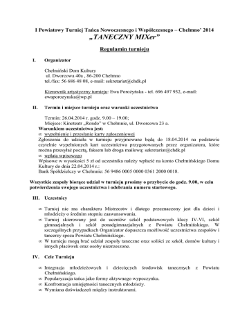 I Powiatowy Turniej Tańca Nowoczesnego i Współczesnego – Chełmno’ 2014 „TANECZNY MIXer” Regulamin turnieju I. Organizator Chełmiński Dom Kultury ul. Dworcowa 40a , 86-200 Chełmno tel./fax: 56 686 48 08, e-mail: [email protected] Kierownik artystyczny turnieju: Ewa Porożyńska - tel. 696 497 932, e-mail: [email protected] II. Termin i miejsce turnieju oraz warunki uczestnictwa Termin: 26.04.2014 r. godz. 9.00 – 19.00; Miejsce: Kinoteatr „Rondo” w Chełmnie, ul. Dworcowa 23 a. Warunkiem uczestnictwa jest: • wypełnienie i przesłanie karty zgłoszeniowej Zgłoszenia do udziału w turnieju przyjmowane będą do 18.04.2014 na podstawie czytelnie wypełnionych kart uczestnictwa przygotowanych przez organizatora, które można przesyłać pocztą, faksem lub droga mailową: [email protected] • wpłata wpisowego Wpisowe w wysokości 5 zł od uczestnika należy wpłacić na konto Chełmińskiego Domu Kultury do dnia 22.04.2014 r.: Bank Spółdzielczy w Chełmnie: 56 9486 0005 0000 0361 2000 0018. Wszystkie zespoły biorące udział w turnieju prosimy o przybycie do godz. 9.00, w celu potwierdzenia swojego uczestnictwa i odebrania numeru startowego. III. Uczestnicy • Turniej nie ma charakteru Mistrzostw i dlatego przeznaczony jest dla dzieci i młodzieży o średnim stopniu zaawansowania. • Turniej skierowany jest do uczniów szkół podstawowych klasy IV-VI, szkół gimnazjalnych i szkół ponadgimnazjalnych z Powiatu Chełmińskiego. W szczególnych przypadkach Organizator dopuszcza możliwość uczestnictwa zespołów i tancerzy spoza Powiatu Chełmińskiego. • W turnieju mogą brać udział zespoły taneczne oraz soliści ze szkół, domów kultury i innych placówek oraz osoby niezrzeszone. IV. Cele Turnieju • Integracja młodzieżowych i dziecięcych środowisk Chełmińskiego. • Popularyzacja tańca jako formy aktywnego wypoczynku. • Konfrontacja umiejętności tanecznych młodzieży. • Wymiana doświadczeń między instruktorami. tanecznych z Powiatu V. Kategorie wiekowe I kategoria - poniżej 12 lat II kategoria - 13-15 lat III kategoria - powyżej 16 lat W przypadku małej liczby formacji startujących w turnieju, organizator zastrzega sobie prawo do połączenia kategorii wiekowych. Czas prezentacji − Soliści: 1 min − Duety: 1-1,5 min − Mini formacje (3-5 osób): 1,5-2,5 min − Formacje taneczne (powyżej 5 osób): 1,5-2,5 min We wszystkich konkurencjach tancerze tańczą do muzyki organizatora (solo, duety) natomiast formacje do muzyki własnej VI. • • • • • Kryteria ocen opracowanie choreograficzne; interpretacja i dobór środków wyrazu artystycznego; technika wykonawcza; ogólny wyraz artystyczny; dobór odpowiedniego podkładu muzycznego. VII. Zasady sędziowania • Komisja sędziowska składać się będzie z trzech sędziów oceniających. • Sędziów powołuje Organizator. • Przydział miejsc nagradzanych zostanie ustalony na podstawie łącznej punktacji w danej kategorii. VIII. Warunki prezentacji • O zakwalifikowaniu do odpowiedniej kategorii wiekowej decyduje wiek najstarszego członka zespołu (w duetach wiek starszego partnera). • Wykonawcy mogą zaprezentować maksymalnie jeden taniec w jednej kategorii. • Tancerze mogą wykonywać: break dance, hip-hop/new style, funky, jazz, taniec współczesny, taniec nowoczesny, balet, dancehall, locking, popping, wacking, electric boogie, house, krumping lub kompilację kilku. • Wykonawcy są zobowiązani dostarczyć podkład muzyczny na CD lub USB wraz z dokładnym opisem (nazwa zespołu i numer utworu). IX. Przepisy ogólne 1. Uczestnicy pokrywają koszty przejazdu i ubezpieczenia od następstw nieszczęśliwych wypadków. 2. Niepełnoletniemu uczestnikowi musi towarzyszyć opiekun (rodzic lub upoważniona przezniego osoba). 3. Sprawy nieujęte w regulaminie rozstrzyga organizator. 4. Za rzeczy pozostawione w szatni i miejscach ogólnie dostępnych organizatorzy nie odpowiadają 5. Dane osobowe umieszczane na kartach zgłoszeniowych zgodnie z ustawą o ochroniedanych osobowych będą wykorzystane jedynie do celów konkursu i nie będą udostępnianeosobom trzecim. 6. Osoba odpowiedzialna za przygotowanie i koordynację turnieju: Ewa Porożyńska. 7. Organizator zastrzega sobie prawo do zmian w regulaminie Warsztaty hip-hop „TANECZNY MIXer” W dniu 25.04.2014 r. w godz. 16.00 – 19.00 w Chełmińskim Domu Kultury, dla osób chętnych, w szczególności dla uczestników Powiatowego Turnieju Tańca Nowoczesnego, odbędą się warsztaty taneczne z hip-hopu. Wysokość opłaty za warsztaty – 10 zł od osoby należy wpłacić na konto Chełmińskiego Domu Kultury do dnia 22.04.2014 r.: Bank Spółdzielczy w Chełmnie: 56 9486 0005 0000 0361 2000 0018.
