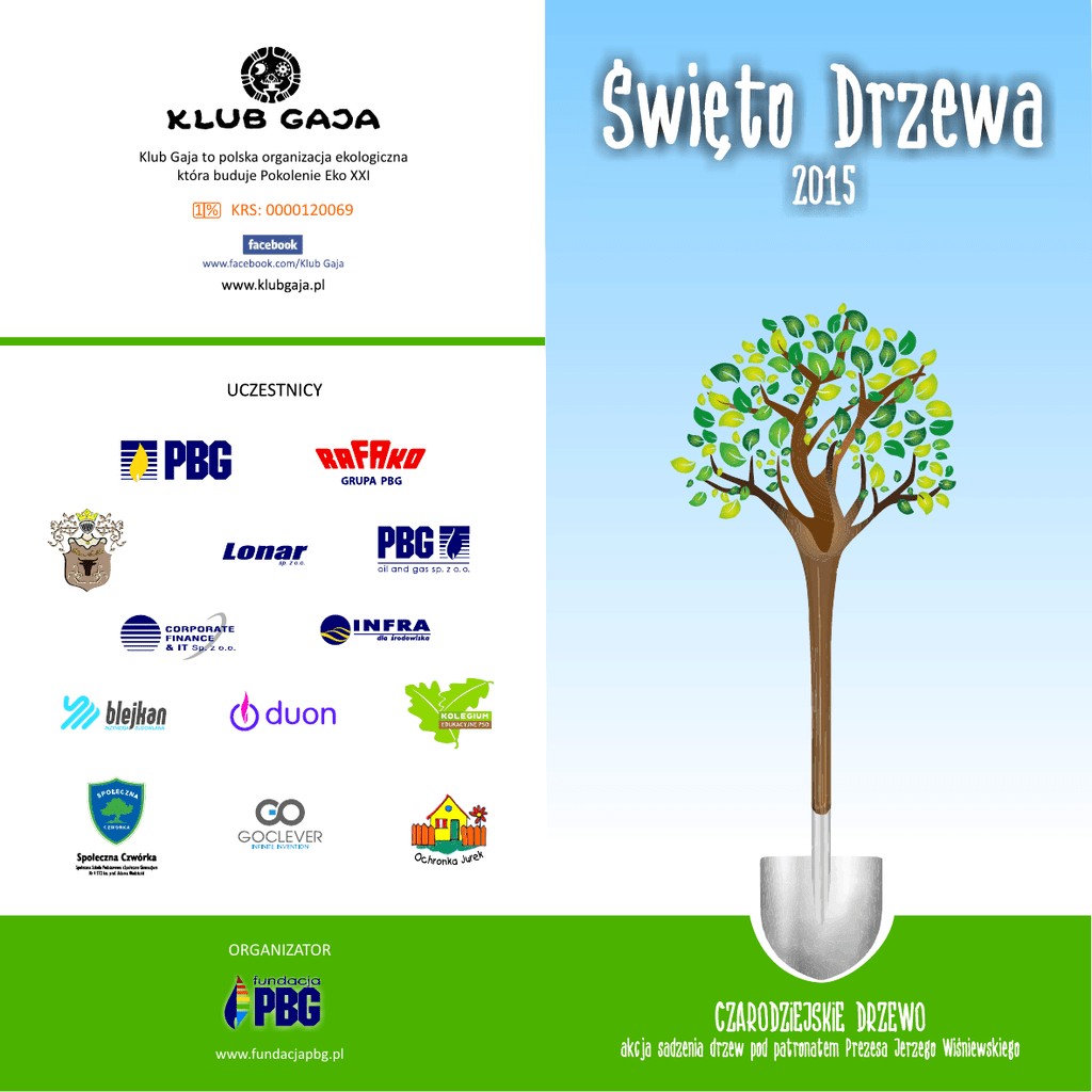 Klub Gaja to polska organizacja ekologiczna która buduje Pokolenie Eko XXI 1 % KRS: 0000120069 ORGANIZATOR www.fundacjapbg.pl Drzewa jako największe rośliny na Ziemi najskuteczniej JAK ZASADZIĆ DRZEWO produkują tlen i pochłaniają dwutlenek węgla. Odgrywają także niezastąpioną rolę w przeciwdziałaniu powodziom i spowalnianiu procesów erozji. W miastach regulują klimat otoczenia łagodząc nagłe zmiany temperatury i zwiększając wilgotność powietrza. Stanowią najważniejszy składnik lasu, tworząc środowisko życia dla co najmniej jednej trzeciej wszystkich gatunków roślin i zwierząt. Od ich obecności i stanu zdrowotnego zależy różnorodność biologiczna środowiska naturalnego. . Wybierz odpowiednią lokalizację dla Twojego drzewa. Upewnij się, że jest wystarczająco dużo miejsca gdy będzie już dorosłe. 2 1 Utrzymuj korzenie drzewa cały czas wilgotne. Suche korzenie zabiją Twoje drzewo. Święto Drzewa w Grupie PBG Wykop wystarczająco duży dół aby swobodnie rozłożyć korzenie. 10 października to dzień obchodów Święta Drzewa. Celem jest edukacja w zakresie zmian klimatycznych i ochrony drzew. W Grupie PBG Święto Drzewa obchodzimy od 2011 roku. W pierwszym roku posadziliśmy na terenie Wysogotowa pierwsze sadzonki drzew liściastych i krzewów, w roku 2012 . uzupełniliśmy je sadzonkami drzew iglastych. Przez kolejne lata zajęliśmy się pielęgnacją posadzonych drzewek. W roku 2015 zgłosiliśmy się do konkursu „Czarodziejskie Drzewo”, którego organizatorem jest Klub Gaja. Wszystkich, którzy chcieliby pomóc w akcji sadzenia drzew pod honorowym patronatem Prezesa Jerzego Wiśniewskiego zapraszamy 10 kwietnia 2015 r. Akcja zostanie przeprowadzona w trzech lokalizacjach: siedziba PBG w Wysogotowie, siedziba Rafako w Raciborzu oraz teren Pałacu w Smólsku. . Uczestnikom zapewniamy sadzonki i miejsce do sadzenia drzew, a po zakończeniu prac ciepły poczęstunek oraz pamiątkowy gadżet. Opiekunowie akcji: 1. Wysogotowo: Joanna Gościńska, tel. 605 470 550; [email protected] 4 Umieść drzewo w dole na właściwej głębokości. Delikatnie zasyp luźną glebą. Dodaj więcej gleby i utwardź stopą. 6 5 Dodaj ściółkę (taką jak kora drzewna) wokół podstawy drzewa. 2. Racibórz: Jan Zdziebczok, tel. 32 410 18 16; [email protected] 3. Smólsk: Joanna Perczyńska, tel. 883 562 500; [email protected] 3 Podlewaj regularnie i obserwuj jak rośnie! 7