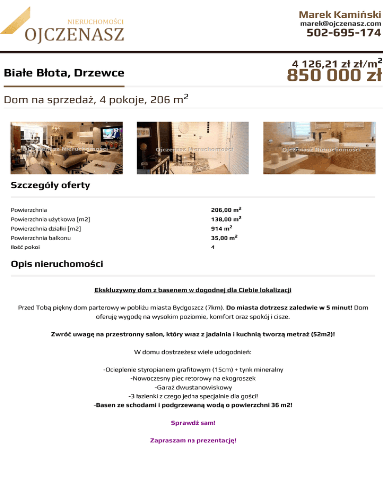 Marek Kamiński [email protected] 502-695-174 4 126,21 zł zł/m2 850 000 zł Białe Błota, Drzewce Dom na sprzedaż, 4 pokoje, 206 m2 Szczegóły oferty Powierzchnia 206,00 m2 Powierzchnia użytkowa [m2] 138,00 m2 Powierzchnia działki [m2] 914 m2 Powierzchnia balkonu 35,00 m2 Ilość pokoi 4 Opis nieruchomości Ekskluzywny dom z basenem w dogodnej dla Ciebie lokalizacji Przed Tobą piękny dom parterowy w pobliżu miasta Bydgoszcz (7km). Do miasta dotrzesz zaledwie w 5 minut! Dom oferuję wygodę na wysokim poziomie, komfort oraz spokój i cisze. Zwróć uwagę na przestronny salon, który wraz z jadalnia i kuchnią tworzą metraż (52m2)! W domu dostrzeżesz wiele udogodnień: -Ocieplenie styropianem grafitowym (15cm) + tynk mineralny -Nowoczesny piec retorowy na ekogroszek -Garaż dwustanowiskowy -3 łazienki z czego jedna specjalnie dla gości! -Basen ze schodami i podgrzewaną wodą o powierzchni 36 m2! Sprawdź sam! Zapraszam na prezentację! Nieruchomość Standard Garaż na dwa samochody Instalacje dobre Ilość tarasów 1 Zagosp. działki zagospodarowana Ukształtowanie działki płaska Kształt działki kwadrat Pokrycie dachu dachówka cementowa Stan budynku do zamieszkania Ogrodzenie działki drewniane Gaz jest Woda tak Dojazd asfalt Otoczenie las Ogrzewanie własne - piec na ekogroszek Alarm tak Tarasy taras duzy Prąd jest Kanalizacja tak