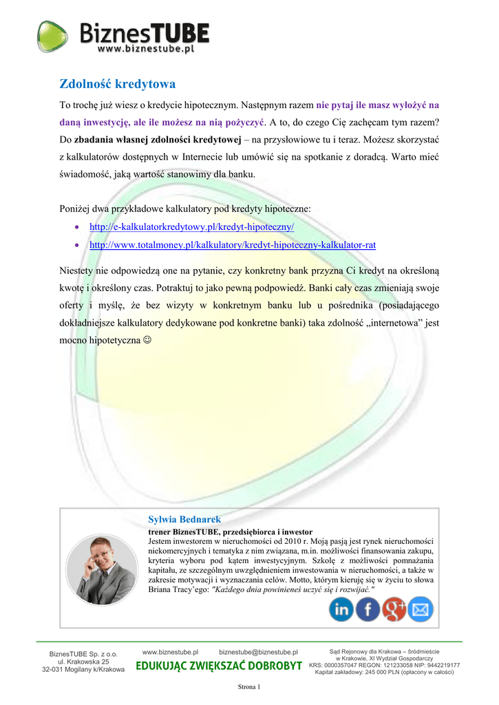 Zdolność kredytowa To trochę już wiesz o kredycie hipotecznym. Następnym razem nie pytaj ile masz wyłożyć na daną inwestycję, ale ile możesz na nią pożyczyć. A to, do czego Cię zachęcam tym razem? Do zbadania własnej zdolności kredytowej – na przysłowiowe tu i teraz. Możesz skorzystać z kalkulatorów dostępnych w Internecie lub umówić się na spotkanie z doradcą. Warto mieć świadomość, jaką wartość stanowimy dla banku. Poniżej dwa przykładowe kalkulatory pod kredyty hipoteczne: http://e-kalkulatorkredytowy.pl/kredyt-hipoteczny/ http://www.totalmoney.pl/kalkulatory/kredyt-hipoteczny-kalkulator-rat Niestety nie odpowiedzą one na pytanie, czy konkretny bank przyzna Ci kredyt na określoną kwotę i określony czas. Potraktuj to jako pewną podpowiedź. Banki cały czas zmieniają swoje oferty i myślę, że bez wizyty w konkretnym banku lub u pośrednika (posiadającego dokładniejsze kalkulatory dedykowane pod konkretne banki) taka zdolność „internetowa” jest mocno hipotetyczna Sylwia Bednarek trener BiznesTUBE, przedsiębiorca i inwestor Jestem inwestorem w nieruchomości od 2010 r. Moją pasją jest rynek nieruchomości niekomercyjnych i tematyka z nim związana, m.in. możliwości finansowania zakupu, kryteria wyboru pod kątem inwestycyjnym. Szkolę z możliwości pomnażania kapitału, ze szczególnym uwzględnieniem inwestowania w nieruchomości, a także w zakresie motywacji i wyznaczania celów. Motto, którym kieruję się w życiu to słowa Briana Tracy’ego: "Każdego dnia powinieneś uczyć się i rozwijać." BiznesTUBE Sp. z o.o. ul. Krakowska 25 32-031 Mogilany k/Krakowa www.biznestube.pl [email protected] Strona 1 Sąd Rejonowy dla Krakowa – Śródmieście w Krakowie, XI Wydział Gospodarczy KRS: 0000357047 REGON: 121233058 NIP: 9442219177 Kapitał zakładowy: 245 000 PLN (opłacony w całości)