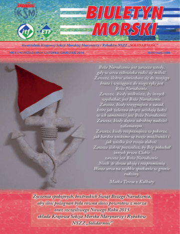 Kwartalnik Krajowej Sekcji Morskiej Marynarzy i Rybaków NSZZ „SOLIDARNOŚĆ” NR 4 (74) PAŹDZIERNIK-LISTOPAD-GRUDZIEŃ 2014 ISSN 1426-1006 Boże Narodzenie jest zawsze wtedy, gdy w sercu człowieka rodzi się miłość. Zawsze, ilekroć uśmiechasz się do swojego brata i wyciągasz do niego rękę jest Boże Narodzenie. Zawsze, kiedy milkniesz, by innych wysłuchać, jest Boże Narodzenie. Zawsze, kiedy rezygnujesz z zasad, które jak żelazna obręcz uciskają ludzi w ich samotności jest Boże Narodzenie. Zawsze, kiedy dajesz odrobinę nadziei załamanym. Zawsze, kiedy rozpoznajesz w pokorze, jak bardzo znikome są twoje możliwości i jak wielka jest twoja słabość. Zawsze ilekroć pozwolisz, by Bóg pokochał innych przez Ciebie zawsze jest Boże Narodzenie. Niech te słowa ukoją i rozpromienią Wasze serca na szybkie spotkanie w gronie rodziny. Matka Teresa z Kalkuty Życzenia spokojnych, beztroskich Świąt Bożego Narodzenia, aby ilość pożegnań była równa ilości powrotów z morza oraz szczęśliwego Nowego Roku 2015 składa Krajowa Sekcja Morska Marynarzy i Rybaków NSZZ „Solidarność” K R A J O WA S E K C J A M O R S K A M A R Y N A R Z Y I R Y B A K Ó W N S Z Z „ S O L I D A R N O Ś Ć ” Od Redakcji NR 4 Kwar (74) PA talnik Krajow ej ŹDZIE RNIK- Sekcji Morsk LISTO iej M PADarynar GRUD zy i Ry ZIEŃ baków 2014 NSZZ „SOL IDAR NOŚĆ ” ISSN Boże N gdy w arodzeni Zawsz sercu czło e jest zawsz wieka ew e, ile brata kroć uśmie rodzi się tedy, i wyc m iągasz chasz się do iłość. do Zawsz Boże Nar niego rę swojego kę jest od e, wysłu kiedy milk zenie. ch Zawsz ać, jest Bo niesz, by in e, że ny kiedy które rezygn Narodzeni ch ja e. ujesz w ich k żelazna z sa ob Zawsz motności jes ręcz ucisk zasad, ają e, kied t y dajes Boże Nar ludzi od Zawsz załam z odrobinę zenie. nadzie jak ba e, kiedy ro anym. i rdzo znikomzpoznajesz w poko Zawsz jak wielka e są twoje rze, moż jes e ilekr oć pozw t twoja sła liwości i innych olisz, by bość. Bóg zaw prze Niech sze jest Bo z Ciebie pokochał że Nar te sło Wasze odzeni serca wa ukoją e. na sz ybkie i rozpromie sp rodzin otkanie w nią Życze nia sp y. gronie Matka Teresa aby ilo okojnych, beztro z Kal ść poże kuty skich gnań Św składa 1426 -1006 była ró iąt Boż oraz sz ego N częśliw wna ilośc arodze Krajo i pow ego N nia, wa Se ro kcja M owego Rok tów z mor za u orska NSZ Mar yn 2015 Z „Sol arzy idarno i Ryb ść” aków SPIS TREŚCI Od redakcji ........................................................... 2 Z działalności ITF ............................................... 3 Nowy Inspektor ITF w Polsce ................... 9 Wywiad z Inspektorem ITF Andrzejem Kościkiem ................................. 10 Z działalności ETF .......................................... 13 Z działalności KSMMiR ............................... 14 Z historii KSMMiR .......................................... 19 Z działalności OMK ....................................... 21 Zabawa Mikołajkowa ................................. 24 Z życia marynarskiego opowieści niezwykle .................................. 25 Rozmowa z Monika Kuszyńską ........... 26 Historia................................................................... 30 Wiadomości ....................................................... 32 Pomóżmy Oliwce ........................................... 35 Humor.................................................................... 36 Krzyżówka ........................................................... 37 ADRESY ................................................................. 38 Nadesłane zdjęcia z burty od naszych marynarzy ........................... 39 Wydawca Krajowa Sekcja Morska Marynarzy i Rybaków NSZZ „Solidarność” Adres redakcji 71-604 Szczecin, ul. Szarotki 8, tel. (91) 422-33-11 fax (91) 422-29-00, e-mail: [email protected], www.solidarnosc.nms.org.pl Rękopisów nie zamówionych redakcja nie zwraca, za treść ogłoszeń redakcja nie odpowiada. Druk Drukarnia MISIURO Gdańsk-Brzeźno, ul. Gdańska 29 tel./fax 58 342 89 37 58 342 26 18 e-mail: [email protected] www.misiuro.pl Numer zamknięto 31 grudnia 2014 Zdjęcie na okładce: B.S 2 Czy Państwo również mają dziwne uczucie, że czas zbyt szybko upływa? Dopiero pisaliśmy o nadchodzącym Anno Domini 2014 a już piszemy o nadchodzącym roku 2015. W ramach podsumowania powyższej myśli, taka mało odkrywcza refleksja - zapewnie każdy z nas jest o wiele bogatszy…w doświadczenia życiowe i na pewno starszy niż rok temu Przekazujemy na Państwa ręce kolejne wydanie Biuletynu Morskiego, już ostatnie w tym roku kalendarzowym. Mamy dość łaskawą aurę, która nie wprowadza nas w ponury nastrój, miejmy nadzieję, że taki stan rzeczy pozostanie. Zapraszamy do zapoznania się z treścią artykułów, informacji i porad które pozwoliliśmy sobie dla Państwa przygotować. Polecamy Państwa uwadze ciekawy wywiad z ustępującym Inspektorem ITF Andrzejem Kościkiem, który opowiada o swoim ponad 17. letnim stażu pracy, mówi o swoich refleksjach i podsumowaniach. Umieściliśmy również informację o nowym Inspektorze ITF, którym został wybrany Grzegorz Daleki i który przejął z dniem 01/12/2014 r. obowiązki dotychczasowego Inspektora ITF Proponujemy także zapoznać się z treścią informacji o ostatnim Kongresie ITF, na którym został przyjęty program działania na następne cztery lata. Ponadto jak co kwartał umieszczamy cykliczne porady dla marynarzy, z działalności Krajowej Sekcji Morskiej, Kongresu ITF, ETF i wiele innych bardzo ciekawych materiałów do poczytania. Proponujemy przeczytać bardzo pouczający i bardzo ciepły wywiad z Moniką Kuszyńską, którą bardzo ciężko doświadczył los. Jej optymizm i chęć do życia powinna zmienić naszą perspektywę postrzegania złych zdarzeń, które nas spotykają, zwłaszcza przy podsumowaniach, na jakie sobie pozwalamy na koniec roku.