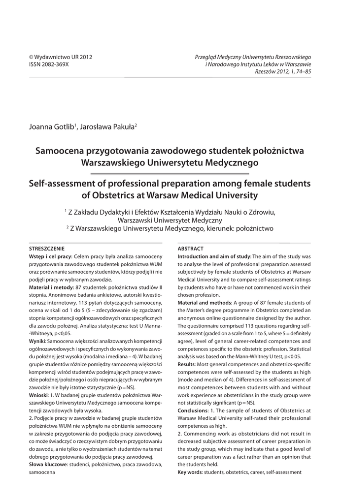 74 Przegląd Medyczny Uniwersytetu Rzeszowskiego i Narodowego Instytutu Leków w Warszawie, 2012, 1, 74–85 © Wydawnictwo UR 2012 ISSN 2082-369X Przegląd Medyczny Uniwersytetu Rzeszowskiego i Narodowego Instytutu Leków w Warszawie Rzeszów 2012, 1, 74–85 Joanna Gotlib1, Jarosława Pakuła2 Samoocena przygotowania zawodowego studentek położnictwa Warszawskiego Uniwersytetu Medycznego Self-assessment of professional preparation among female students of Obstetrics at Warsaw Medical University Z Zakładu Dydaktyki i Efektów Kształcenia Wydziału Nauki o Zdrowiu, Warszawski Uniwersytet Medyczny 2 Z Warszawskiego Uniwersytetu Medycznego, kierunek: położnictwo 1 Streszczenie Wstęp i cel pracy: Celem pracy była analiza samooceny przygotowania zawodowego studentek położnictwa WUM oraz porównanie samooceny studentów, którzy podjęli i nie podjęli pracy w wybranym zawodzie. Materiał i metody: 87 studentek położnictwa studiów II stopnia. Anonimowe badania ankietowe, autorski kwestionariusz internetowy, 113 pytań dotyczących samooceny, ocena w skali od 1 do 5 (5 – zdecydowanie się zgadzam) stopnia kompetencji ogólnozawodowych oraz specyficznych dla zawodu położnej. Analiza statystyczna: test U Manna-Whitneya, p<0,05. Wyniki: Samoocena większości analizowanych kompetencji ogólnozawodowych i specyficznych do wykonywania zawodu położnej jest wysoka (modalna i mediana – 4). W badanej grupie studentów różnice pomiędzy samooceną większości kompetencji wśród studentów podejmujących pracę w zawodzie położnej/położnego i osób niepracujących w wybranym zawodzie nie były istotne statystycznie (p = NS). Wnioski: 1. W badanej grupie studentów położnictwa Warszawskiego Uniwersytetu Medycznego samoocena kompetencji zawodowych była wysoka. 2. Podjęcie pracy w zawodzie w badanej grupie studentów położnictwa WUM nie wpłynęło na obniżenie samooceny w zakresie przygotowania do podjęcia pracy zawodowej, co może świadczyć o rzeczywistym dobrym przygotowaniu do zawodu, a nie tylko o wyobrażeniach studentów na temat dobrego przygotowania do podjęcia pracy zawodowej. Słowa kluczowe: studenci, położnictwo, praca zawodowa, samoocena Abstract Introduction and aim of study: The aim of the study was to analyse the level of professional preparation assessed subjectively by female students of Obstetrics at Warsaw Medical University and to compare self-assessment ratings by students who have or have not commenced work in their chosen profession. Material and methods: A group of 87 female students of the Master’s degree programme in Obstetrics completed an anonymous online questionnaire designed by the author. The questionnaire comprised 113 questions regarding selfassessment (graded on a scale from 1 to 5, where 5 = definitely agree), level of general career-related competences and competences specific to the obstetric profession. Statistical analysis was based on the Mann-Whitney U test, p<0.05. Results: Most general competences and obstetrics-specific competences were self-assessed by the students as high (mode and median of 4). Differences in self-assessment of most competences between students with and without work experience as obstetricians in the study group were not statistically significant (p = NS). Conclusions: 1. The sample of students of Obstetrics at Warsaw Medical University self-rated their professional competences as high. 2. Commencing work as obstetricians did not result in decreased subjective assessment of career preparation in the study group, which may indicate that a good level of career preparation was a fact rather than an opinion that the students held. Key words: students, obstetrics, career, self-assessment