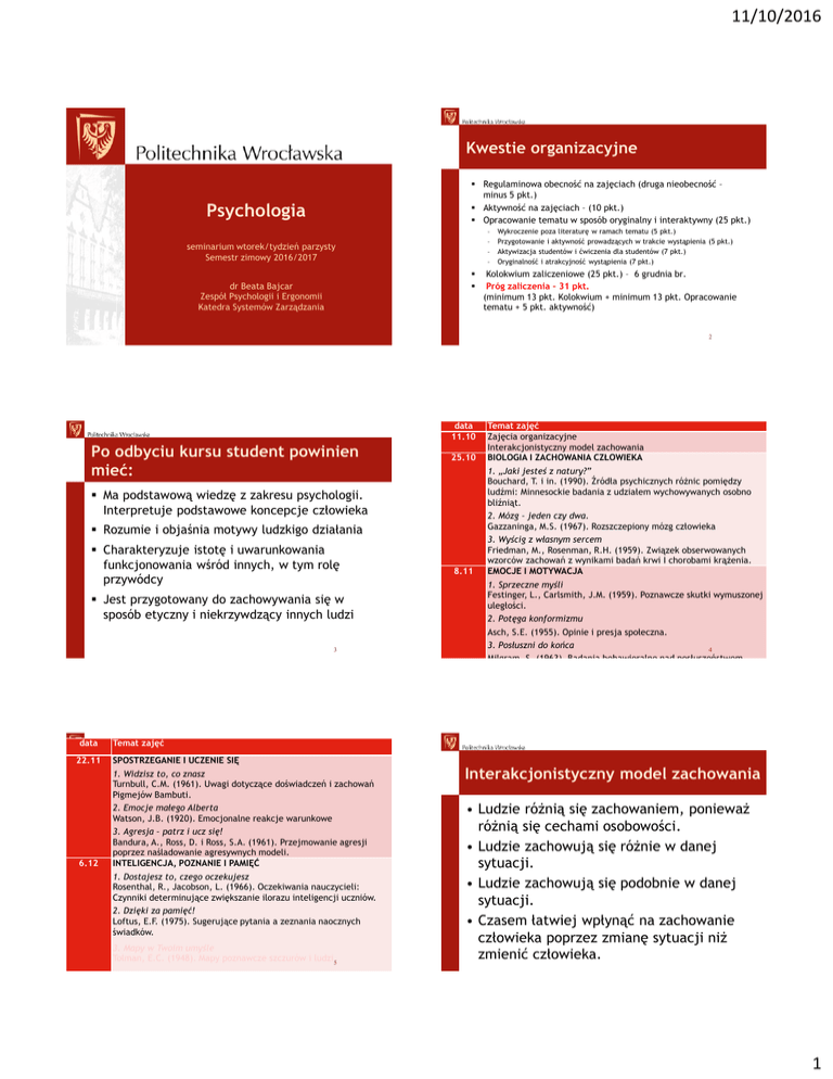 11/10/2016 Kwestie organizacyjne Regulaminowa obecność na zajęciach (druga nieobecność – minus 5 pkt.) Aktywność na zajęciach – (10 pkt.) Opracowanie tematu w sposób oryginalny i interaktywny (25 pkt.) Psychologia – – – – seminarium wtorek/tydzień parzysty Semestr zimowy 2016/2017 dr Beata Bajcar Zespół Psychologii i Ergonomii Katedra Systemów Zarządzania Wykroczenie poza literaturę w ramach tematu (5 pkt.) Przygotowanie i aktywność prowadzących w trakcie wystąpienia (5 pkt.) Aktywizacja studentów i ćwiczenia dla studentów (7 pkt.) Oryginalność i atrakcyjność wystąpienia (7 pkt.) Kolokwium zaliczeniowe (25 pkt.) – 6 grudnia br. Próg zaliczenia – 31 pkt. (minimum 13 pkt. Kolokwium + minimum 13 pkt. Opracowanie tematu + 5 pkt. aktywność) 2 data 11.10 Po odbyciu kursu student powinien mieć: 25.10 Ma podstawową wiedzę z zakresu psychologii. Interpretuje podstawowe koncepcje człowieka Rozumie i objaśnia motywy ludzkigo działania Charakteryzuje istotę i uwarunkowania funkcjonowania wśród innych, w tym rolę przywódcy Jest przygotowany do zachowywania się w sposób etyczny i niekrzywdzący innych ludzi 3 data 22.11 6.12 8.11 Temat zajęć Zajęcia organizacyjne Interakcjonistyczny model zachowania BIOLOGIA I ZACHOWANIA CZŁOWIEKA 1. „Jaki jesteś z natury?” Bouchard, T. i in. (1990). Źródła psychicznych różnic pomiędzy ludźmi: Minnesockie badania z udziałem wychowywanych osobno bliźniąt. 2. Mózg – jeden czy dwa. Gazzaninga, M.S. (1967). Rozszczepiony mózg człowieka 3. Wyścig z własnym sercem Friedman, M., Rosenman, R.H. (1959). Związek obserwowanych wzorców zachowań z wynikami badań krwi I chorobami krążenia. EMOCJE I MOTYWACJA 1. Sprzeczne myśli Festinger, L., Carlsmith, J.M. (1959). Poznawcze skutki wymuszonej uległości. 2. Potęga konformizmu Asch, S.E. (1955). Opinie i presja społeczna. 3. Posłuszni do końca 4 Milgram, S. (1963). Badania behawioralne nad posłuszeństwem. Temat zajęć SPOSTRZEGANIE I UCZENIE SIĘ 1. Widzisz to, co znasz Turnbull, C.M. (1961). Uwagi dotyczące doświadczeń i zachowań Pigmejów Bambuti. 2. Emocje małego Alberta Watson, J.B. (1920). Emocjonalne reakcje warunkowe 3. Agresja – patrz i ucz się! Bandura, A., Ross, D. i Ross, S.A. (1961). Przejmowanie agresji poprzez naśladowanie agresywnych modeli. INTELIGENCJA, POZNANIE I PAMIĘĆ 1. Dostajesz to, czego oczekujesz Rosenthal, R., Jacobson, L. (1966). Oczekiwania nauczycieli: Czynniki determinujące zwiększanie ilorazu inteligencji uczniów. 2. Dzięki za pamięć! Loftus, E.F. (1975). Sugerujące pytania a zeznania naocznych świadków. 3. Mapy w Twoim umyśle Tolman, E.C. (1948). Mapy poznawcze szczurów i ludzi.5 Interakcjonistyczny model zachowania • Ludzie różnią się zachowaniem, ponieważ różnią się cechami osobowości. • Ludzie zachowują się różnie w danej sytuacji. • Ludzie zachowują się podobnie w danej sytuacji. • Czasem łatwiej wpłynąć na zachowanie człowieka poprzez zmianę sytuacji niż zmienić człowieka. 1 11/10/2016 Interakcjonistyczny model zachowania Interakcjonistyczny model zachowania • Wpływ cech podmiotowych na zachowanie: • Wpływ sytuacji na ludzkie zachowanie: – – – – – – – – cechy osobowości cechy temperamentu inteligencja motywacja poglądy i postawy system wartości potrzeby …. – – – – – – – – cechy osobowości cechy temperamentu inteligencja motywacja poglądy i postawy system wartości potrzeby …. KWESTIONARIUSZ MPI • Kwestionariusz ten zawiera stwierdzenie dotyczące Twojego zachowania, odczuwania i samopoczucia. Przeczytaj każde z nich i potem odpowiedz poprzez wpisanie w arkuszu odpowiedzi litery T (tak, zgadzam się) lub N ( nie, nie zgadzam się). Jeżeli będzie Ci bardzo trudno zdecydować się na którąś z tych odpowiedzi, wtedy zakreśl w arkuszu odpowiedzi znak zapytania "?". • Nie zastanawiaj się nad stwierdzeniem zbyt długo. Nie chodzi tu bowiem o szczegółowo przemyślaną odpowiedź, a o pierwszą reakcję. KWESTIONARIUSZ MPI 1. Zmiana mojego samopoczucia dokonuje się czasem bez widocznego powodu. 2. Bez widocznego powodu bywam raz smutny raz wesoły. 3. Czasem miewam takie myśli, że nie chciałbym, aby inni o nich wiedzieli. 4. W chwilach gdy staram się skupić, spostrzegam, że myśli moje są rozproszone. 5. Miewam czasami kłopoty pieniężne. 6. Zdarza mi się plotkować. 7. Chętnie nawiązuję rozmowę z nowo zapoznaną osobą. 8. Wśród znanych mi osób są tacy, których zdecydowanie nie lubię. 9. Sytuacje, wymagające szybkiego działania dają mi dużo zadowolenia. 10. Zdarza mi się czasem kłamać. 11. Odkładam czasem do jutra to, co powinienem zrobić dzisiaj. KWESTIONARIUSZ MPI 12. Wolę działać natychmiast niż po dłuższym zastanowieniu. 13. Uważam się za człowieka ruchliwego. Wyniki T = 1 pkt. N = 0 pkt. ? = ½ pkt. 14. Czuje się czasem pełen energii, a czasem leniwy i ospały. 15. Zwykle działam szybko i pewnie. 16. Zdarza mi się mówi o rzeczach, na których się nie znam. 17. Łatwo wpadam w przygnębienie. 18. Czasem chwalę się trochę. 19. Byłoby mi bardzo smutno, gdybym musiał zrezygnować z częstego przebywania w towarzystwie. 20. Jeżeli gram w coś, znacznie bardziej wolę wygrać niż przegrać. Ekstrawersja – Introwersja E = suma (7, 9, 13, 15, 19, 21). Neurotyczność vs Stabilność emocjonalna N = suma (1, 2, 4, 12, 14, 17). Kłamstwo K = suma (3, 5, 6, 8, 10, 11, 16, 18, 20, 22). 21. Mając wziąć udział w rozmowie spostrzegam, że gubię się w swoich myślach. 22. Zdarza mi się śmiać się ze świńskich dowcipów. 2 11/10/2016 Wpływ sytuacji na zachowanie Wpływ sytuacji na zachowanie • Sytuacja definiowana jako ogół warunków, w których ktoś się znajduje lub coś się dzieje. • Elementy sytuacji determinujące zachowanie - cel - reguły postępowania - repertuar zachowań Główne cele zachowań społecznych • akceptacja