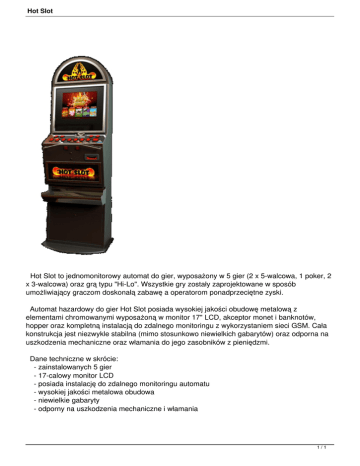 Hot Slot Hot Slot to jednomonitorowy automat do gier, wyposażony w 5 gier (2 x 5-walcowa, 1 poker, 2 x 3-walcowa) oraz grą typu "Hi-Lo". Wszystkie gry zostały zaprojektowane w sposób umożliwiający graczom doskonałą zabawę a operatorom ponadprzeciętne zyski. Automat hazardowy do gier Hot Slot posiada wysokiej jakości obudowę metalową z elementami chromowanymi wyposażoną w monitor 17" LCD, akceptor monet i banknotów, hopper oraz kompletną instalacją do zdalnego monitoringu z wykorzystaniem sieci GSM. Cała konstrukcja jest niezwykle stabilna (mimo stosunkowo niewielkich gabarytów) oraz odporna na uszkodzenia mechaniczne oraz włamania do jego zasobników z pieniędzmi. Dane techniczne w skrócie: - zainstalowanych 5 gier - 17-calowy monitor LCD - posiada instalację do zdalnego monitoringu automatu - wysokiej jakości metalowa obudowa - niewielkie gabaryty - odporny na uszkodzenia mechaniczne i włamania 1/1