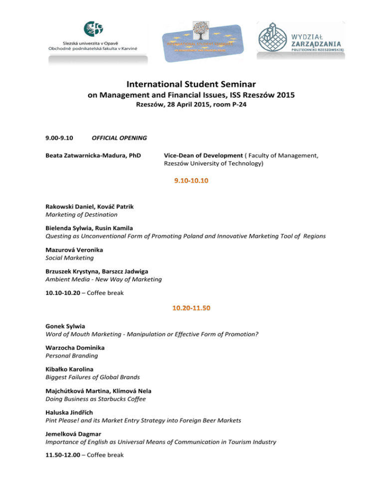 International Student Seminar on Management and Financial Issues, ISS Rzeszów 2015 Rzeszów, 28 April 2015, room P-24 9.00-9.10 OFFICIAL OPENING Beata Zatwarnicka-Madura, PhD Vice-Dean of Development ( Faculty of Management, Rzeszów University of Technology) Rakowski Daniel, Kováč Patrik Marketing of Destination Bielenda Sylwia, Rusin Kamila Questing as Unconventional Form of Promoting Poland and Innovative Marketing Tool of Regions Mazurová Veronika Social Marketing Brzuszek Krystyna, Barszcz Jadwiga Ambient Media - New Way of Marketing 10.10-10.20 – Coffee break Gonek Sylwia Word of Mouth Marketing - Manipulation or Effective Form of Promotion? Warzocha Dominika Personal Branding Kibałko Karolina Biggest Failures of Global Brands Majchútková Martina, Klímová Nela Doing Business as Starbucks Coffee Haluska Jindřích Pint Please! and its Market Entry Strategy into Foreign Beer Markets Jemelková Dagmar Importance of English as Universal Means of Communication in Tourism Industry 11.50-12.00 – Coffee break Bernat Paulina, Chodorek Michał Your Knowledge Isn't Everything - Success Secrets of Public Performances? Przewoźnik Grzegorz Project Management – Way to Business Success Jordan Katarzyna, Bąk Katarzyna Academic Business Incubators Dyrda Paweł, Chudy Adrian The EBS, Semi-automatic Express Boarding System Ziemkiewicz Karolina Short Study of the Burj Khalifa Tower Project Mokrzycka Katarzyna, Kopeć Katarzyna, Ziajor Maciej Project of Balanced Scorecard for Municipal Office of Cmolas 13.30 FIRST DAY CLOSING International Student Seminar on Management and Financial Issues, ISS Rzeszów 2015 Rzeszów, 29 April 2015, room P-24 9.00-9.10 SECOND DAY OPENING Dobroňová Dominka Gold in World since 1971 Caputo Benedetta, Sueli Okyanus Poverty Kamila Pacholarz Laundering Money Prucnal Marta Pyramide Scheme Kubicki Mateusz Illegal Work 10.10-10.20 – Coffee break Turková Markéta Bancassurance Products of Société Générale on Czech and French Market Kopřiva Michael CAMEL Model and its Application Mendrela Magdalena Currency Risk - One of Problems of Modern Enterprises Płocica Wiktoria Economic Situation of Ukraine Horúcková Michaela Assessment of Progress of Western Balkans in Economic Field of Copenhagen Criteria Mikešková Jana European Union Structural Funds and their Use in Non-profit Organizations 11.50-12.00 – Coffee break Bielec Katarzyna, Bazan Sylwia New Business Trends - Most Popular Companies which Introduced CSR Policy Kılıç Hazal, Kocek Damla Going Green in Logistics Poźniak Monika Rzeszów as place for Development of Outsourcing Services Trojniar Krzysztof, Wysocki Jakub eSport – History and Opportunities 13.30-14.30 – Lunch break 15.00 Additional Info: 1. The order of presentations may change. All speakers are asked to submit their electronic presentations before the section during which they present. 2. All of the students presenting during seminar ISS Rzeszów 2015 are invited to participate in Best Presentation Award announcement ceremony. 3. Certificates of attendance for students who took part in International Student Seminars will be available on Tuesday, 29 April shortly after the Best Presentation Awards announcement.