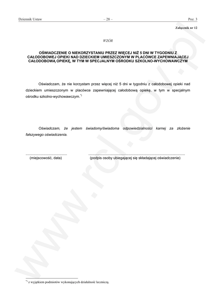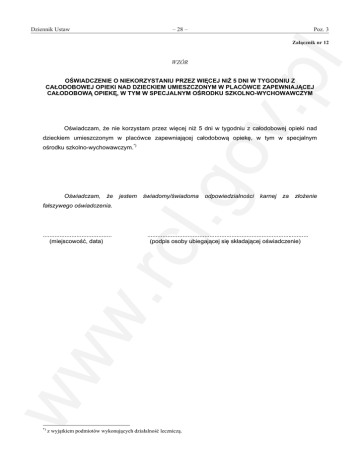 Dziennik Ustaw – 28 – Poz. 3 Załącznik nr 12 .rc l.g ov .pl Załącznik nr 12 WZÓR WZÓR OŚWIADCZENIE O NIEKORZYSTANIU PRZEZ WIĘCEJ NIŻ 5 DNI W TYGODNIU Z CAŁODOBOWEJ OPIEKI NAD DZIECKIEM UMIESZCZONYM W PLACÓWCE ZAPEWNIAJĄCEJ CAŁODOBOWĄ OPIEKĘ, W TYM W SPECJALNYM OŚRODKU SZKOLNO-WYCHOWAWCZYM Oświadczam, że nie korzystam przez więcej niż 5 dni w tygodniu z całodobowej opieki nad dzieckiem umieszczonym w placówce zapewniającej całodobową opiekę, w tym w specjalnym ośrodku szkolno-wychowawczym.*) Oświadczam, że jestem świadomy/świadoma odpowiedzialności karnej za złożenie fałszywego oświadczenia. ww w ......................................... (miejscowość, data) ................................................................................................ (podpis osoby ubiegającej się składającej oświadczenie) *) z wyjątkiem podmiotów wykonujących działalność leczniczą. 31