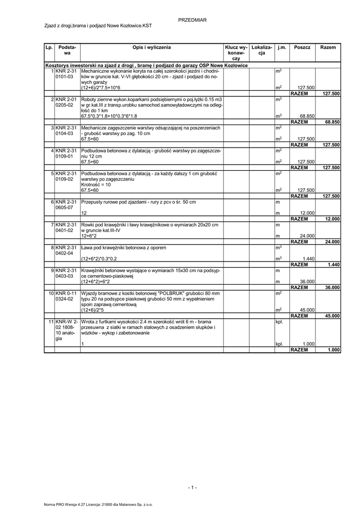 PRZEDMIAR Zjazd z drogi,brama i podjazd Nowe Kozłowice.KST Lp. Podstawa Opis i wyliczenia Klucz wy- Lokaliza- j.m. konawcja czy Kosztorys inwestorski na zjazd z drogi , bramę i podjazd do garazy OSP Nowe Kozłowice 1 KNR 2-31 Mechaniczne wykonanie koryta na całej szerokości jezdni i chodnim2 0101-03 ków w gruncie kat. V-VI głębokości 20 cm - zjazd i podjazd do nowych garaży (12+6)/2*7.5+10*6 m2 2 KNR 2-01 Roboty ziemne wykon.koparkami podsiębiernymi o poj.łyżki 0.15 m3 0205-02 w gr.kat.III z transp.urobku samochod.samowyładowczymi na odległość do 1 km 67.5*0.3*1.8+10*0.3*6*1.8 m3 3 KNR 2-31 Mechanicze zagęszczenie warstwy odsączającej na poszerzeniach 0104-03 - grubość warstwy po zag. 10 cm 67.5+60 m2 4 KNR 2-31 Podbudowa betonowa z dylatacją - grubość warstwy po zagęszcze0109-01 niu 12 cm 67.5+60 m2 5 KNR 2-31 Podbudowa betonowa z dylatacją - za każdy dalszy 1 cm grubość 0109-02 warstwy po zagęszczeniu Krotność = 10 67.5+60 m2 6 KNR 2-31 Przepusty rurowe pod zjazdami - rury z pcv o śr. 50 cm 0605-07 12 m 7 KNR 2-31 Rowki pod krawężniki i ławy krawężnikowe o wymiarach 20x20 cm 0401-02 w gruncie kat.III-IV 12+6*2 m 8 KNR 2-31 Ława pod krawężniki betonowa z oporem 0402-04 (12+6*2)*0.3*0.2 m3 9 KNR 2-31 Krawężniki betonowe wystające o wymiarach 15x30 cm na podsyp0403-03 ce cementowo-piaskowej (12+6*2)+6*2 m m3 m2 m2 m2 m m m3 m 10 KNR 0-11 Wjazdy bramowe z kostki betonowej "POLBRUK" grubości 80 mm 0324-02 typu 20 na podsypce piaskowej grubości 50 mm z wypełnieniem spoin zaprawą cementową (12+6)/2*5 m2 11 KNR-W 2- Wrota z furtkami wysokości 2.4 m szerokość wrót 6 m - brama 02 1808- przesuwna z siatki w ramach stalowych z osadzeniem słupków i 10 analo- wózków - wykop i zabetonowanie gia 1 kpl. -1- Norma PRO Wersja 4.27 Licencja: 21800 dla Malanowo Sp. z o.o. m2 kpl. Poszcz Razem 127.500 RAZEM 127.500 68.850 RAZEM 68.850 127.500 RAZEM 127.500 127.500 RAZEM 127.500 127.500 RAZEM 127.500 12.000 RAZEM 12.000 24.000 RAZEM 24.000 1.440 RAZEM 1.440 36.000 RAZEM 36.000 45.000 RAZEM 45.000 1.000 RAZEM 1.000