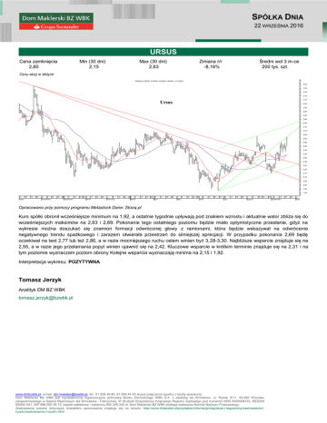 SPÓŁKA DNIA 22 WRZEŚNIA 2016 URSUS Cena zamknięcia 2,60 Min (30 dni) 2,15 Max (30 dni) 2,63 Średni wol 3 m-ce 200 tys. szt. Zmiana r/r -8,16% Ceny akcji w złotych URSUS (2.50000, 2.62000, 2.50000, 2.60000, +0.13000) 3.30 3.25 3.20 3.15 3.10 Ursus 3.05 3.00 2.95 2.90 2.85 2.80 2.75 2.70 2.65 2.60 2.55 2.50 2.45 2.40 2.35 2.30 2.25 2.20 2.15 2.10 2.05 2.00 1.95 1.90 5 12 October 19 26 2 9 16 November 23 30 7 14 December 21 28 4 11 2016 18 25 1 8 February 15 22 29 7 March 14 21 29 4 April 11 18 25 2 9 May 16 23 30 6 June 13 20 27 4 July 11 18 25 1 8 August 16 22 29 5 12 September 19 26 3 October Opracowano przy pomocy programu Metastock Dane: Stooq.pl Kurs spółki obronił wcześniejsze minimum na 1,92, a ostatnie tygodnie upływają pod znakiem wzrostu i aktualnie walor zbliża się do wcześniejszych maksimów na 2,63 i 2,69. Pokonanie tego ostatniego poziomu będzie miało optymistyczne przesłanie, gdyż na wykresie można doszukać się znamion formacji odwróconej głowy z ramionami, która będzie wskazywał na odwrócenie negatywnego trendu spadkowego i zarazem otwierała przestrzeń do silniejszej aprecjacji. W przypadku pokonania 2,69 będę oczekiwał na test 2,77 lub też 2,86, a w razie mocniejszego ruchu celem winien być 3,28-3,30. Najbliższe wsparcie znajduje się na 2,55, a w razie jego przełamania popyt winien ujawnić się na 2,42. Kluczowe wsparcie w krótkim terminie znajduje się na 2,31 i na tym poziomie wyznaczam poziom obrony Kolejne wsparcia wyznaczają minima na 2,15 i 1,92. Interpretacja wykresu: POZYTYWNA Tomasz Jerzyk Analityk DM BZ WBK [email protected] www.dmbzwbk.pl, e-mail: [email protected], tel.: 61 856 48 80, 61 856 44 45 (koszt połączenia zgodny z taryfą operatora) Dom Maklerski BZ WBK jest wyodrębnioną organizacyjnie jednostką Banku Zachodniego WBK S.A. z siedzibą we Wrocławiu, ul. Rynek 9/11, 50-950 Wrocław, zarejestrowanego w Sądzie Rejonowym dla Wrocławia - Fabrycznej, VI Wydział Gospodarczy Krajowego Rejestru Sądowego pod numerem KRS 0000008723, REGON 930041341, NIP 896 000 56 73, kapitał zakładowy i wpłacony 992.345.340 zł. Dom Maklerski BZ WBK podlega nadzorowi Komisji Nadzoru Finansowego. Zastrzeżenia prawne dotyczące charakteru opracowania znajdują się na stronie: http://www.dmbzwbk.pl/przydatne-informacje/regulacje-i-regulaminy/zastrzezenia-iryzyko/zastrzezenia-i-ryzyko.html.