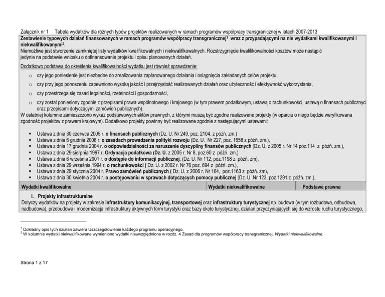 Załącznik nr 1 Tabela wydatków dla róŜnych typów projektów realizowanych w ramach programów współpracy transgranicznej w latach 2007-2013 Zestawienie typowych działań finansowanych w ramach programów współpracy transgranicznej1 wraz z przypadającymi na nie wydatkami kwalifikowanymi i niekwalifikowanymi2. NiemoŜliwe jest stworzenie zamkniętej listy wydatków kwalifikowalnych i niekwalifikowalnych. Rozstrzygnięcie kwalifikowalności kosztów moŜe nastąpić jedynie na podstawie wniosku o dofinansowanie projektu i opisu planowanych działań. Dodatkowo podstawą do określenia kwalifikowalności wydatku jest równieŜ sprawdzenie: o czy jego poniesienie jest niezbędne do zrealizowania zaplanowanego działania i osiągnięcia zakładanych celów projektu, o czy przy jego ponoszeniu zapewniono wysoką jakość i przejrzystość realizowanych działań oraz uŜyteczność i efektywność wykorzystania, o czy przestrzega się zasad legalności, rzetelności i gospodarności, o czy został poniesiony zgodnie z przepisami prawa wspólnotowego i krajowego (w tym prawem podatkowym, ustawą o rachunkowości, ustawą o finansach publicznych oraz przepisami dotyczącymi zamówień publicznych). W ostatniej kolumnie zamieszczono wykaz podstawowych aktów prawnych, z którymi muszą być zgodne realizowane projekty (w oparciu o niego będzie weryfikowana zgodność projektów z prawem krajowym). Dodatkowo projekty powinny być realizowane zgodnie z następującymi ustawami: Ustawa z dnia 30 czerwca 2005 r. o finansach publicznych (Dz. U. Nr 249, poz. 2104, z późń. zm.) Ustawa z dnia 6 grudnia 2006 r. o zasadach prowadzenia polityki rozwoju (Dz. U. Nr 227, poz. 1658 z późń. zm.), Ustawa z dnia 17 grudnia 2004 r. o odpowiedzialności za naruszenie dyscypliny finansów publicznych (Dz. U. z 2005 r. Nr 14 poz.114 z późń. zm.), Ustawa z dnia 29 sierpnia 1997 r. Ordynacja podatkowa (Dz. U. z 2005 r. Nr 8, poz.60 z późń. zm.) Ustawa z dnia 6 września 2001 r. o dostępie do informacji publicznej. (Dz. U. Nr 112, poz.1198 z późń. zm), Ustawa z dnia 29 września 1994 r. o rachunkowości ( Dz. U. z 2002 r. Nr 76 poz. 694 z późń. zm.), Ustawa z dnia 29 stycznia 2004 r. Prawo zamówień publicznych ( Dz. U. z 2006 r. Nr 164, poz.1163 z późń. zm), Ustawa z dnia 30 kwietnia 2004 r. o postępowaniu w sprawach dotyczących pomocy publicznej (Dz. U. Nr 123, poz.1291 z późń. zm.), Wydatki kwalifikowalne Wydatki niekwalifikowalne Podstawa prawna I. Projekty infrastrukturalne Dotyczy wydatków na projekty w zakresie infrastruktury komunikacyjnej, transportowej oraz infrastruktury turystycznej np. budowa (w tym rozbudowa, odbudowa, nadbudowa), przebudowa i modernizacja infrastruktury aktywnych form turystyki oraz bazy około turystycznej, działań przyczyniających się do wzrostu ruchu turystycznego, 1 2 Dokładny opis tych działań zawiera Uszczegółowienie kaŜdego programu operacyjnego. W kolumnie wydatki niekwalifikowane wymieniono wydatki nieuwzględnione w rozdz. 4 Zasad dla programów współpracy transgranicznej, Wydatki niekwalifikowalne. Strona 1 z 17 Załącznik nr 1 Tabela wydatków dla róŜnych typów projektów realizowanych w ramach programów współpracy transgranicznej w latach 2007-2013 wzmacniania bezpieczeństwa oraz infrastruktury ochrony środowiska, np. drobna infrastruktura sieci kanalizacyjnych dla ścieków komunalnych, budowa (w tym rozbudowa) i modernizacja oczyszczalni ścieków komunalnych, budowa (w tym rozbudowa) i modernizacja elementów systemów zaopatrzenia w wodę, telekomunikacja, parkingi samochodowe3. Projekt określany jest jako infrastrukturalny, jeśli całkowite nakłady na inwestycje (usługi, dostawy) przekraczają 75% całkowitych wydatków kwalifikowalnych projektu. Wnioskodawca powinien być albo właścicielem gruntu, na którym mają zostać przeprowadzone roboty, albo powinien posiadać prawo uŜytkowania tego gruntu. 1. Prace przygotowawcze, w tym: przygotowanie projektu (np. przeprowadzenie prac studialnych, ekspertyz, badań geologicznych, uzyskanie opinii konserwatorskich), przygotowanie dokumentacji technicznej (np. studium wykonalności, raport oddziaływania na środowisko, koncepcja budowlana, projekt budowlany, projekt wykonawczy, specyfikacja techniczna), prace projektantów, architektów i konserwatorów, koszty przetargów (w tym przygotowanie dokumentacji przetargowej, przygotowanie przetargu, publikacja ogłoszeń przetargowych), koszty spotkań z partnerami i tłumaczenia. 2. Prace inwestycyjne i związane z procesem inwestycyjnym, w tym: opłaty za pozwolenia na budowę, zakup niezabudowanych nieruchomości lub nieruchomości, jeśli jest on nierozerwalnie związany z realizacją projektu (nie więcej niŜ 10% wartości całkowitych kosztów kwalifikowalnych projektu), przygotowanie terenu pod budowę, w tym prace geodezyjne, prace ziemne, prace budowlano-montaŜowe, przebudowa infrastruktury technicznej niezbędnej dla realizacji projektu towarzyszącej lub kolidującej z inwestycją, w tym linii elektroenergetycznej, teletechnicznej, kanalizacji sanitarnej, sieci gazowej, ciepłowniczej, wodociągowej, urządzeń wodnych melioracji, urządzeń podziemnych zakup niezabudowanych nieruchomości lub nieruchomości, które nie są bezpośrednio związane z realizacją projektu lub nie będą trwale do niej wykorzystane, wydatki, do których poniesienia z mocy ustaw zobowiązana jest inna instytucji niŜ beneficjent projektu, wydatki na naprawę, modernizację i utrzymanie wyników inwestycji (np. instalacji drogowotransportowych), koszty modernizacji i napraw przyległych Ustawa z dnia 7 lipca 1994 r. Prawo budowlane (Dz.U. z 2006 r. Nr 156, poz.1118 z późń. zm.); Ustawa z dnia 21 sierpnia 1997 r. o gospodarce nieruchomościami (Dz. U. z 2004 r. Dz.U. Nr 261, poz. 2603. z późń. zm.); Rozporządzenie Ministra Infrastruktury z dnia 2 września 2004 r. w sprawie szczegółowego zakresu i formy dokumentacji 