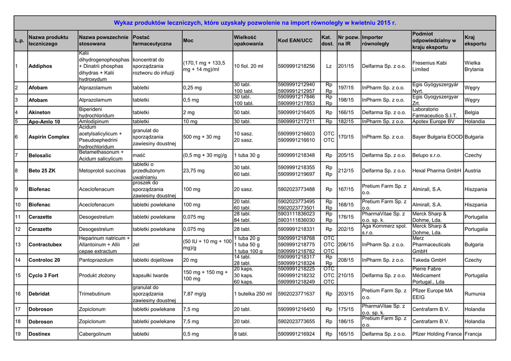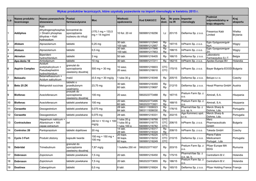 Wykaz produktów leczniczych, które uzyskały pozwolenie na import równoległy w kwietniu 2015 r. Nazwa produktu leczniczego Nazwa powszechnie Postać stosowana farmaceutyczna Moc Wielkość opakowania Kod EAN/UCC 1 Addiphos Kalii dihydrogenophosphas koncentrat do sporządzania + Dinatrii phosphas roztworu do infuzji dihydras + Kalii hydroxydum (170,1 mg + 133,5 mg + 14 mg)/ml 10 fiol. 20 ml 5909991218256 Lz 2 Afobam Alprazolamum tabletki 0,25 mg 3 Afobam Alprazolamum tabletki 0,5 mg 30 tabl. 100 tabl. 30 tabl. 100 tabl. 5909991212940 5909991212957 5909991217846 5909991217853 Rp Rp Rp Rp 4 Akineton 5 Apo-Amlo 10 6 Aspirin Complex 7 Belosalic 8 Beto 25 ZK Metoprololi succinas 9 Biofenac Aceclofenacum 10 Biofenac Aceclofenacum L.p. Biperideni hydrochloridum Amlodipinum Acidum acetylsalicylicum + Pseudoephedrini hydrochloridum Betamethasonum + Acidum salicylicum Kat. Nr pozw. Importer dost. na IR równoległy 201/15 Delfarma Sp. z o.o. 197/15 InPharm Sp. z o.o. 198/15 InPharm Sp. z o.o. Podmiot odpowiedzialny w kraju eksportu Kraj eksportu Fresenius Kabi Limited Wielka Brytania tabletki 2 mg 50 tabl. 5909991216405 Rp 166/15 Delfarma Sp. z o.o. tabletki 10 mg 30 tabl. 5909991217211 Rp 182/15 InPharm Sp. z o.o. Egis Gyógyszergyár Nyrt. Egis Gyogyszergyar Zrt. Laboratorio Farmaceutico S.I.T. Apotex Europe BV granulat do sporządzania zawiesiny doustnej 500 mg + 30 mg 10 sasz. 20 sasz. 5909991216603 5909991216610 OTC 170/15 OTC InPharm Sp. z o.o. Bayer Bułgaria EOOD Bułgaria maść (0,5 mg + 30 mg)/g 1 tuba 30 g 5909991218348 Rp 205/15 Delfarma Sp. z o.o. Belupo s.r.o. 23,75 mg 30 tabl. 60 tabl. 5909991218355 5909991219697 Rp Rp 212/15 Delfarma Sp. z o.o. Hexal Pharma GmbH Austria 100 mg 20 sasz. 5902023773488 Rp 167/15 Pretium Farm Sp. z o.o. Almirall, S.A. Hiszpania 20 tabl. 60 tabl. 28 tabl. 84 tabl. 5902023773495 5902023773501 5903111836023 5903111836030 Rp Rp Rp Rp Almirall, S.A. Hiszpania 28 tabl. 5909991218331 tabletki o przedłużonym uwalnianiu proszek do sporządzania zawiesiny doustnej tabletki powlekane 100 mg 11 Cerazette Desogestrelum tabletki powlekane 0,075 mg 12 Cerazette Desogestrelum tabletki powlekane 0,075 mg 13 Contractubex Heparinum natricum + Allantoinum + Allii żel cepae extractum 14 Controloc 20 Pantoprazolum tabletki dojelitowe 15 Cyclo 3 Fort Produkt złożony kapsułki twarde 16 Debridat Trimebutinum 17 Dobroson 18 19 Rp 168/15 176/15 202/15 1 tuba 20 g (50 IU + 10 mg + 100 1 tuba 50 g mg)/g 1 tuba 100 g 14 tabl. 20 mg 28 tabl. 20 kaps. 150 mg + 150 mg + 30 kaps. 100 mg 60 kaps. 5909991218768 5909991218775 5909991218782 5909991218317 5909991218324 5909991218225 5909991218232 5909991218249 OTC OTC 206/15 OTC Rp 208/15 Rp OTC OTC 210/15 OTC granulat do sporządzania zawiesiny doustnej 7,87 mg/g 1 butelka 250 ml 5902023771637 Rp 203/15 Zopiclonum tabletki powlekane 7,5 mg 20 tabl. 5909991216450 Rp 175/15 Dobroson Zopiclonum tabletki powlekane 7,5 mg 20 tabl. 5902023773655 Rp 186/15 Dostinex Cabergolinum tabletki 0,5 mg 8 tabl. 5909991216924 Rp 165/15 Pretium Farm Sp. z o.o. PharmaVitae Sp. z o.o. sp. k. Aga Kommerz spol. s.r.o. InPharm Sp. z o.o. Merck Sharp & Dohme, Lda. Merck Sharp & Dohme, Lda. Merz Pharmaceuticals GmbH Węgry Węgry Belgia Holandia Czechy Portugalia Portugalia Bułgaria InPharm Sp. z o.o. Takeda GmbH Czechy Delfarma Sp. z o.o. Pierre Fabre Médicament Portugal., Lda Portugalia Pretium Farm Sp. z o.o. Pfizer Europe MA EEIG Rumunia Centrafarm B.V. Holandia Centrafarm B.V. Holandia PharmaVitae Sp. z o.o. sp. k. Pretium Farm Sp. z o.o. Delfarma Sp. z o.o. Pfizer Holding France Francja Wykaz produktów leczniczych, które uzyskały pozwolenie na import równoległy w kwietniu 2015 r. L.p. 20 21 Nazwa produktu leczniczego Nazwa powszechnie Postać stosowana farmaceutyczna Paracetamolum + Codeini phosphas Efferalgan Vitamina Paracetamolum + Acidum ascorbicum C Efferalgan Codeine Olaflurum + Dectaflurum + Natrii fluoridum Moc Wielkość opakowania Kod EAN/UCC 500 mg + 30 mg 16 tabl. 5902023773693 tabletki musujące 330 mg + 200 mg 10 tabl. 20 tabl. 5902023773150 5902023773167 OTC 164/15 OTC żel 12,5 mg fluoru/g 1 tuba 25 g 5903415003152 OTC 162/15 tabletka 1500 mikrogramów 1 tabl. 5909991218751 Rp 211/15 Delfarma Sp. z o.o. tabletki musujące Kat. Nr pozw. Importer dost. na IR równoległy Rp 187/15 Pretium Farm Sp. z o.o. Pretium Farm Sp. z o.o. RADA spółka z ograniczoną odpowiedzialnością spółka jawna Podmiot odpowiedzialny w kraju eksportu Bristol-Myers Squibb S.A. Bristol-Myers Squibb S.A. Hiszpania Hiszpania 22 Elmex 23 Escapelle tabletka Levonorgestrelum 1500 mikrogramów 24 Gopten 2,0 Trandolaprilum kapsułki twarde 2 mg 28 kaps. 5909991218614 Rp 207/15 InPharm Sp. z o.o. 25 Hypnomidate Etomidatum roztwór do wstrzykiwań 2 mg/ml 5 amp. 10 ml 5909991216931 Lz 163/15 Delfarma Sp. z o.o. 26 Izotek 20 mg Isotretinoinum kapsułki miękkie 20 mg 30 kaps. 60 kaps. 5902023771613 5902023771620 Rp Rp 178/15 Pretium Farm Sp. z o.o. 27 Kaldyum Kalii chloridum 600 mg 50 kaps. 100 kaps. 5909991217693 5909991217709 Rp Rp 191/15 Delfarma Sp. z o.o. Egis Pharmaceuticals Słowacja PLC 28 Kaldyum Kalii chloridum 600 mg 50 kaps. 100 kaps. 5909991216986 5909991216993 Rp Rp 183/15 InPharm Sp. z o.o. Egis Pharmaceuticals Słowacja PLC 29 Laticort 0,1% Hydrocortisoni butyras maść 1 mg/g 1 tuba 15 g 5909991217839 Rp 192/15 Delfarma Sp. z o.o. PharmaSwiss Česká Bułgaria republika s.r.o. 30 Lozap 50 Losartanum kalicum tabletki powlekane 50 mg 30 tabl. 60 tabl. 90 tabl. 5909991217044 5909991217051 5909991217068 Rp Rp Rp 181/15 PharmaVitae Sp. z o.o. sp. k. ZENTIVA, a.s. Rumunia 31 Nivalin Galantamini hydrobromidum roztwór do wstrzykiwań 5 mg/ml 10 amp. 1 ml 5902023772184 Rp 185/15 Pretium Farm Sp. z o.o. Sopharma PLC Bułgaria 32 Olzin Olanzapinum tabletki 10 mg 28 tabl. 5909991216559 Rp 169/15 InPharm Sp. z o.o. 33 Omacor kapsułki miękkie 1000 mg 28 kaps. 5909991216528 Rp 174/15 PharmaVitae Sp. z o.o. sp. k. 34 Omacor kapsułki miękkie 1000 mg table