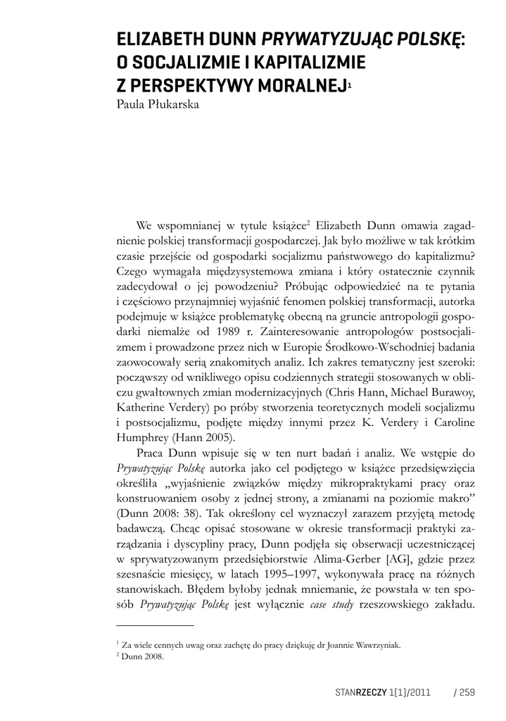 Elizabeth Dunn Prywatyzując Polskę: o socjalizmie i kapitalizmie z perspektywy moralnej 1 Paula Płukarska We wspomnianej w tytule książce2 Elizabeth Dunn omawia zagadnienie polskiej transformacji gospodarczej. Jak było możliwe w tak krótkim czasie przejście od gospodarki socjalizmu państwowego do kapitalizmu? Czego wymagała międzysystemowa zmiana i który ostatecznie czynnik zadecydował o jej powodzeniu? Próbując odpowiedzieć na te pytania i częściowo przynajmniej wyjaśnić fenomen polskiej transformacji, autorka podejmuje w książce problematykę obecną na gruncie antropologii gospodarki niemalże od 1989 r. Zainteresowanie antropologów postsocjalizmem i prowadzone przez nich w Europie Środkowo-Wschodniej badania zaowocowały serią znakomitych analiz. Ich zakres tematyczny jest szeroki: począwszy od wnikliwego opisu codziennych strategii stosowanych w obliczu gwałtownych zmian modernizacyjnych (Chris Hann, Michael Burawoy, Katherine Verdery) po próby stworzenia teoretycznych modeli socjalizmu i postsocjalizmu, podjęte między innymi przez K. Verdery i Caroline Humphrey (Hann 2005). Praca Dunn wpisuje się w ten nurt badań i analiz. We wstępie do Prywatyzując Polskę autorka jako cel podjętego w książce przedsięwzięcia określiła „wyjaśnienie związków między mikropraktykami pracy oraz konstruowaniem osoby z jednej strony, a zmianami na poziomie makro” (Dunn 2008: 38). Tak określony cel wyznaczył zarazem przyjętą metodę badawczą. Chcąc opisać stosowane w okresie transformacji praktyki zarządzania i dyscypliny pracy, Dunn podjęła się obserwacji uczestniczącej w sprywatyzowanym przedsiębiorstwie Alima-Gerber [AG], gdzie przez szesnaście miesięcy, w latach 1995–1997, wykonywała pracę na różnych stanowiskach. Błędem byłoby jednak mniemanie, że powstała w ten sposób Prywatyzując Polskę jest wyłącznie case study rzeszowskiego zakładu. 1 2 Za wiele cennych uwag oraz zachętę do pracy dziękuję dr Joannie Wawrzyniak. Dunn 2008. StanRzeczy 1(1)/2011 / 259 Podejmując bowiem centralne dla książki pytanie: „w jaki sposób społeczeństwo może w tak krótkim czasie przeprowadzić głęboką zmianę ekonomiczną?”, Elizabeth Dunn stwierdza: „Płynąca z doświadczeń Alimy odpowiedź na to pytanie – skoncentrowana wokół prywatyzacji firmy i transformacji zatrudnionych w niej pracowników – powala zrozumieć część procesów składających się na prywatyzację i transformację gospodarczą w Polsce” (Dunn 2008: 19). Co konkretnie, według Elizabeth Dunn, przypadek przedsiębiorstwa Alima-Gerber wnosi do rozumienia makrotransformacji polskiej gospodarki? Odpowiedź autorki można by streścić następująco: „powodzenie w tworzeniu gospodarki rynkowej wymaga zmiany samych podstaw tego, co to znaczy być osobą” (Dunn 2008: 19). Stwierdzenie to da się uznać za podsumowanie wniosków wyłaniających się z książki. Warto pokrótce przedstawić sposób, w jaki autorka dochodzi do takiej konstatacji. Punktem wyjścia dla rozważań Dunn jest stwierdzenie, że u progu zmiany systemowej najpierw „projektodawcy postsocjalistycznych reform gospodarczych”, następnie zaś kierownictwo Gerbera popełnili zasadniczy błąd, przypisując Polakom cechy właściwe dla kapitalistycznej racjonalności zysku3. Gdy z czasem okazało się, że pracownicy AG nie są tacy sami, jak amerykańscy robotnicy, Polska nie jest przypadkiem „wstrzymanego rozwoju”, a wieloletnie doświadczenie socjalizmu „coś” po sobie jednak pozostawiło, firma, jak stwierdza Dunn, „podjęła wysiłek s t w o r z e n i a [wyróżnienie w oryginale] z ludzi, z którymi miała do czynienia w Polsce, takich, do jakich była przyzwyczajona” (Dunn 2008: 18). Opis zastosowanych w tym celu technik dyscypliny pracy stanowi przedmiot kolejnych rozdziałów Prywatyzując Polskę. Autorka próbuje wyjaśnić, w jaki sposób ich wdrażanie doprowadzić miało do „stworzenia” nowego rodzaju jednostek. Marketing niszowy, kapitalistyczna rachunkowość, audyt, standaryzacja, „ideologia” rozliczalności, zarządzanie uczestniczące oraz kompleksowe zarządzanie jakością służyły według niej „przekształceniu ludzi w elastycznych, zręcznych, samoregulujących się robotników” (Dunn 2008: 20), stworzeniu „«przedsiębiorczego ja» – osoby konstruującej samą siebie poprzez aktywne wybieranie i kombinowanie” (Dunn 2008: 36). 3 Menadżerowie Gerbera „założyli, że Polska jest przypadkiem wstrzymanego rozwoju i że zarówno przedsiębiorstwo, jak i cały kraj znajdują się na początku tego samego szlaku, jakim przebiegał rozwój Gerbera w początkach XX w. […] kierownictwo Gerbera doszło do wniosku, że polscy rolnicy, robotnicy oraz konsumenci również muszą być podobni do tych, których znali z Fremont. […] Projektodawcy postsocjalistycznych reform gospodarczych wierzyli, że Polacy byli tacy sami, jak mieszkańcy kapitalistycznych krajów zachodnich. Jeśli tylko usunąć komunistyczne ograniczenia, naturalna skłonność do kapitalistycznej racjonalności ekonomicznej, maksymalizacji zysku, przedsiębiorczości, etyki pracy i konsumpcji spowodują, że gospodarka kapitalistyczna rozwinie się w sposób spontaniczny” (Dunn 2008, 16, 17). / 260 StanRzeczy 1(1)/2011 W tym miejscu postawić należy pytanie, w jaki sposób opisywane przez Dunn techniki dyscypliny pracy umożliwić miały przeprowadzenie systemowej zmiany gospodarczej? Dlaczego, idąc za stwierdzeniem autorki, „regulowanie podmiotowości – tworzenie osób nowego typu – jest tak integralną częścią tworzenia kapitalizmu” (Dunn 2008: 35)? W jaki sposób przemiana polskich robotników w „elastyczne”, „zręczne” i „samoregulujące się” jednostki doprowadzić miała do przyjęcia się gospodarki rynkowej? Elizabeth Dunn stwierdza: „[…] «tranzycja» to przede wszystkim fundamentalna zmiana natury władzy w Europie Ws