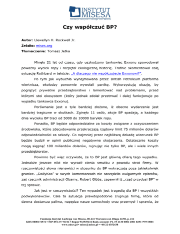 Czy współczuć BP? Autor: Llewellyn H. Rockwell Jr. Źródło: mises.org Tłumaczenie: Tomasz Jetka Minęło 21 lat od czasu, gdy uszkodzony tankowiec Exxonu spowodował poważny wyciek ropy i rozpętał ekologiczną histerię. Trafnie skomentował całą sytuację Rothbard w tekście: „A dlaczego nie współczujecie Exxonowi?”. Po tym jak wybuchła wynajmowana przez British Petroleum platforma wiertnicza, ekolodzy ponownie wywołali panikę. Wykorzystują okazję, by pogrążyć prywatne przedsiębiorstwo i lamentować nad problemami, przed którymi stoi ekosystem (który jednak zdołał przetrwać i dalej funkcjonuje po wypadku tankowca Exxonu). Porównanie jest o tyle bardziej złożone, iż obecne wydarzenie jest bardziej tragiczne w skutkach. Zginęło 11 osób, akcje BP spadają, a każdego dnia wycieku BP traci od 5000 do 10000 baryłek ropy. Ponadto, BP będzie odpowiedzialne za koszty związane z oczyszczeniem środowiska, które zdecydowanie przekraczają rządowy limit 75 milionów dolarów odpowiedzialności za szkody. Co najmniej przez najbliższą dekadę wizerunek BP będzie budził w opinii publicznej negatywne skojarzenia. Ostatecznie koszty mogą sięgnąć 100 miliardów dolarów, rujnując nie tylko BP, ale i wiele innych przedsiębiorstw. Powinno być więc oczywiste, że to BP jest główną ofiarą tego wypadku. Jednakże jeszcze nikt nie wyraził cienia smutku z powodu strat firmy. W rzeczywistości słowa nienawiści w stosunku do BP wykraczają poza jakiekolwiek granice. „DailyKos” w swych komentarzach nie szczędziło wulgarnych epitetów, zaś rzecznik administracji Obamy, Robert Gibbs, zapewnił iż „rząd przydusi BP” w tej sprawie. Jak jest w rzeczywistości? Ten wypadek jest tragedią dla BP i wszystkich podwykonawców. Cała ta sytuacja prawdopodobnie zrujnuje firmę, która od dawna dostarcza paliwa, napędza nasze samochody oraz przemysł i sprawia, że Fundacja Instytut Ludwiga von Misesa, 00-241 Warszawa ul. Długa 44/50, p. 214 KRS 0000174572 ▪ NIP 894 277 56 04 ▪ Regon 932949234 Bank account: PL 19 2130 0004 2001 0253 7975 0001 www.mises.pl ▪ [email protected] ▪ +48 22 6352438 współczesny świat sprawnie funkcjonuje. Przekonanie, iż BP powinno zostać powszechnie znienawidzone i potępione jest niedorzeczne. Przecież BP nie zarabia na wyciekach ropy, nikt też nie znajduje przyjemności w wylewaniu cennego surowca do oceanu. BP nic na tym nie zyskuje. Prezes zarządu firmy przez lata robił wszystko, by uniknąć właśnie takich zdarzeń. Czynił to jednak nie z pragnienia dostosowania się do regulacji, ale ponieważ jest to dobra, biznesowa praktyka. W przeciwieństwie do tych, którzy opłakują to, co się stało, możemy zastanowić się, kto cieszy się z tego nieszczęścia: 1. ekolodzy, rozsiewający strach i nienawiść do współczesnego świata 2. rząd, który stara się obskubać każdego przedsiębiorcę z pieniędzy. Ekolodzy są podekscytowani, ponieważ mają kolejny pretekst do opłakiwania ich ukochanych bagien i innych „wrażliwych” terenów. Strata ryb i innych morskich stworzeń jest smutna, jednak nie straciliśmy ich bezpowrotnie: po wypadku tankowca Exxonu połów ryb był rekordowy już w następnym roku. Główną korzyścią propagandowej krucjacie dla ekologów przeciwko złu jest kolejny producentów argument w ich ropy i oceanicznym odwiertom. Jeżeli osiągną to, do czego dążą, ceny ropy będą dwukrotnie lub trzykrotnie wyższe. Nigdy już nie zostanie wybudowana żadna rafineria, zatrzymany zostanie także rozwój wszelkich ludzkich przedsięwzięć prowadzonych na oceanach, a wszystko to w imię „ochrony” czegoś, co ani trochę nie liczy się z dobrem istot ludzkich. W zasadzie ekonomiczna kwestia związana ze środowiskiem naturalnym dotyczy tak naprawdę odpowiedzialności za szkody. W świecie prywatnej własności, jeżeli niszczysz własność innej osoby, ponosisz odpowiedzialność. Jednak jak przedstawia się sprawa w świecie, w którym rząd posiada rozległe połacie ziemi, a oceany uznawane są za wspólne dobro wszystkich? Niezwykle trudne staje się wtedy oszacowanie jakichkolwiek szkód wyrządzonych środowisku. Mamy tutaj do czynienia również z innym poważnym problemem — rządowych limitów odpowiedzialności za szkody. To jest prawdziwa niedorzeczność etatyzmu. Odpowiedzialność za szkody powinna sięgać co najmniej 100% ich wartości. Tylko taki system zmusiłby przedsiębiorstwa do działań, które brałyby pod uwagę faktyczne ryzyko strat. Mniejsze limity Fundacja Instytut Ludwiga von Misesa, 00-241 Warszawa ul. Długa 44/50, p. 214 KRS 0000174572 ▪ NIP 894 277 56 04 ▪ Regon 932949234 Bank account: PL 19 2130 0004 2001 0253 7975 0001 www.mises.pl ▪ [email protected] ▪ +48 22 6352438 skłaniają firmy do przywiązywania mniejszej, niż powinny, uwagi do wyrządzanych przez nie zniszczeń. Znajdują się one wtedy w takiej samej sytuacji, jak firmy posiadające rządową gwarancję pomocy — ulegają one pokusie nadużycia, by być mniej efektywnym, niż musiałyby być na wolnym rynku. Jednak powyższa zasada odpowiedzialności zakłada przede wszystkim istnienie własności, tak iż właściciel sam mógłby domagać się zadośćuczynienia za powstałe szkody. Nie ma szans na obiektywne rozstrzygnięcie takiego sporu, jeżeli oceany są własnością wspólną i gdy ogromne tereny należą do rządu. I to właśnie rząd i administracja prezydenta Obamy zyskuje na tym wypadku. Otrzymali oni kolejną „szansę od życia”. Wysyłają tysiące ludzi, by „ratowali” region. Cytując Obamę: „każdy Amerykanin dotknięty tym wyciekiem powinien wiedzieć, że jego rząd zrobi wszystko, co tylko konieczne i jak długo będzie trzeba, żeby powstrzymać ten kryzys”. Czy naprawdę powinniśmy wierzyć, że rząd poradzi sobie z tym problemem lepiej niż prywatne przedsiębiorstwo? W międzyczasie, administracja Obamy zapewne cieszy s