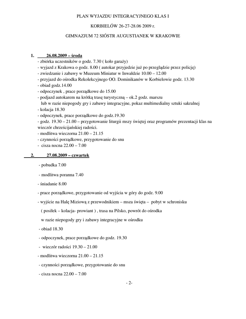 PLAN WYJAZDU INTEGRACYJNEGO KLAS I KORBIELÓW 26-27-28.06 2009 r. GIMNAZJUM 72 SIÓSTR AUGUSTIANEK W KRAKOWIE 1. 2. 26.08.2009 – środa - zbiórka uczestników o godz. 7.30 ( koło garaży) - wyjazd z Krakowa o godz. 8.00 ( autokar przyjedzie już po przeglądzie przez policję) - zwiedzanie i zabawy w Muzeum Miniatur w Inwałdzie 10.00 – 12.00 - przyjazd do ośrodka Rekolekcyjnego OO. Dominikanów w Korbielowie godz. 13.30 - obiad godz.14.00 - odpoczynek , prace porządkowe do 15.00 - podjazd autokarem na krótką trasę turystyczną – ok.2 godz. marszu lub w razie niepogody gry i zabawy integracyjne, pokaz multimedialny sztuki sakralnej - kolacja 18.30 - odpoczynek, prace porządkowe do godz.19.30 - godz. 19.30 – 21.00 – przygotowanie liturgii mszy świętej oraz programów prezentacji klas na wieczór chrześcijańskiej radości. - modlitwa wieczorna 21.00 – 21.15 - czynności porządkowe, przygotowanie do snu - cisza nocna 22.00 – 7.00 27.08.2009 – czwartek - pobudka 7.00 - modlitwa poranna 7.40 - śniadanie 8.00 - prace porządkowe, przygotowanie od wyjścia w góry do godz. 9.00 - wyjście na Halę Miziową z przewodnikiem – msza święta – pobyt w schronisku ( posiłek – kolacja- prowiant ) , trasa na Pilsko, powrót do ośrodka w razie niepogody gry i zabawy integracyjne w ośrodku - obiad 18.30 - odpoczynek, prace porządkowe do godz. 19.30 - wieczór radości 19.30 – 21.00 - modlitwa wieczorna 21.00 – 21.15 - czynności porządkowe, przygotowanie do snu - cisza nocna 22.00 – 7.00 - 2- 3. 28.08.2009 – piątek - pobudka 7.00 - modlitwa poranna 7.40 - śniadanie 8.00 - prace porządkowe, przygotowanie do wyjazdu - wyjazd godz.10.00 - przyjazd do Krakowa około godz. 13.00 ADRES: DOM REKOLEKCYJNY OO.DOMINIKANÓW KORBIELÓW UL.BESKIDZKA 24 34 – 335 KRZYŻOWA PROSIMY ZABRAĆ: - WYGODNE OBUWIE – ADIDASY LUB TREKINGI - STRÓJ SPORTOWY - KURTKĘ LUB PŁASZCZ PRZECIWDESZCZOWY - MAŁY TURYSTYCZNY PLECAK Koszt ( rozliczony na 30 osób) – 230 zł I rata 100 zł do 10.07.2009 II rata 130 zł do 3- 7.08.2009 SERDECZNIE ZAPRASZAMY!!!!!
