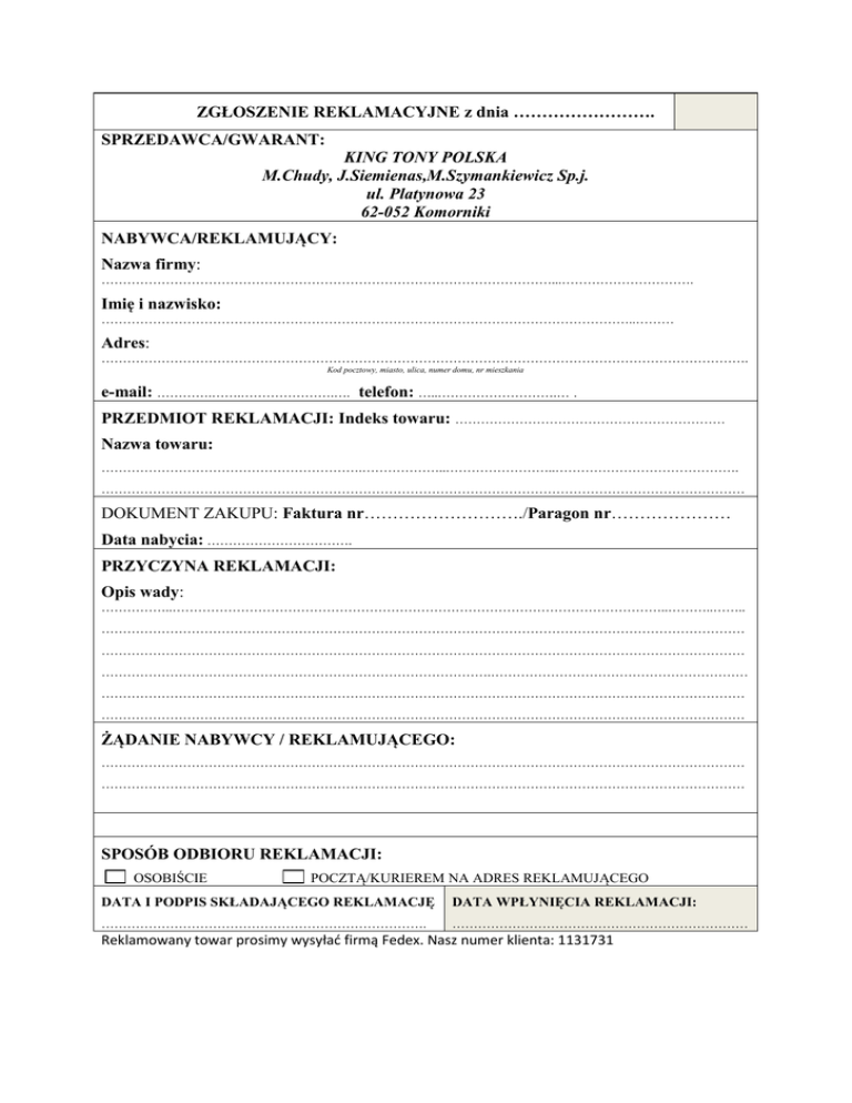 ZGŁOSZENIE REKLAMACYJNE z dnia ……………………. SPRZEDAWCA/GWARANT: KING TONY POLSKA M.Chudy, J.Siemienas,M.Szymankiewicz Sp.j. ul. Platynowa 23 62-052 Komorniki NABYWCA/REKLAMUJĄCY: Nazwa firmy: ……………………………………………………………………………………………...…………………………. Imię i nazwisko: ……………………………………………………………………………………………………………..……… Adres: ……………………………………………………………………………………………………………………………………. Kod pocztowy, miasto, ulica, numer domu, nr mieszkania e-mail: ………….…….………………….…. telefon: …..……………………….… . PRZEDMIOT REKLAMACJI: Indeks towaru: ……………………………………………………… Nazwa towaru: …………………………………………………….………………..……………………..……………………………………. …………………………………………………………………………………………………………………………………… DOKUMENT ZAKUPU: Faktura nr………………………./Paragon nr………………… Data nabycia: ……………………………. PRZYCZYNA REKLAMACJI: Opis wady: ……………..……………………………………………………………………………………………………..………..…….. …………………………………………………………………………………………………………………………………… …………………………………………………………………………………………………………………………………… ……………………………………………………………………………….…………………………………………………… …………………………………………………………………………………………………………………………………… …………………………………………………………………………………………………………………………………… ŻĄDANIE NABYWCY / REKLAMUJĄCEGO: …………………………………………………………………………………………………………………………………… …………………………………………………………………………………………………………………………………… SPOSÓB ODBIORU REKLAMACJI: OSOBIŚCIE POCZTĄ/KURIEREM NA ADRES REKLAMUJĄCEGO DATA I PODPIS SKŁADAJĄCEGO REKLAMACJĘ DATA WPŁYNIĘCIA REKLAMACJI: …………………………………………………………………. …………………………………………………………… Reklamowany towar prosimy wysyłać firmą Fedex. Nasz numer klienta: 1131731