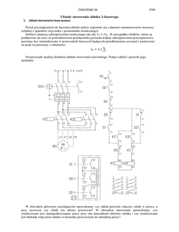 ĆWICZENIE 34 2TM Układy sterowanie silnika 3-fazowego 1. Układ sterowania lewo prawo. Przed przystąpieniem do łączenia układu należy zapoznać się z danymi znamionowymi maszyny (silnika) i aparatów (stycznika i przekaźnika termicznego) Dobierz nastawę zabezpieczenia termicznego tak aby Iz=1,1IN . W przypadku silników, które są podłączone do sieci za pośrednictwem przełącznika gwiazda-trójkąt zabezpieczenia przeciążeniowe powinny być zainstalowane w przewodach fazowych będących przedłużeniem uzwojeń i nastawione na prąd wyznaczony z zależności: 𝐼 𝐼𝑍 = 1,1 𝑁 √3 Przeprowadź analizę działania układu sterowania nawrotnego. Połącz układ i sprawdź jego działanie. W obwodzie głównym (zasilającym) sprawdzamy: czy układ pozwala włączyć silnik w prawo, a przy nawrocie czy silnik ma obroty przeciwne? W obwodzie sterowania sprawdzamy: czy zrealizowane jest samopodtrzymanie pracy przy obu kierunkach obrotów silnika i czy zrealizowana jest blokada włączenia silnika w kierunku przeciwnym do aktualnej pracy? Opisz działanie układu. Wyjaśnij, działanie blokady stycznikowej i przełącznikowej. Zaproponuj modyfikację układu sterowania tak, aby można było zmienić kierunek bez użycia przycisku S0. 2. Układ rozruchu gwiazda trójkąt. Przeprowadź analizę działania układu sterowania rozruchem silnika indukcyjnego. Połącz układ sterowania i sprawdź jego działanie. Połącz tory prądowe i przeprowadź rozruch silnika. Zaproponuj modyfikację układu sterowania z wykorzystaniem przekaźnika czasowego. Przeprowadź rozruch silnika z nowym układem sterowania.