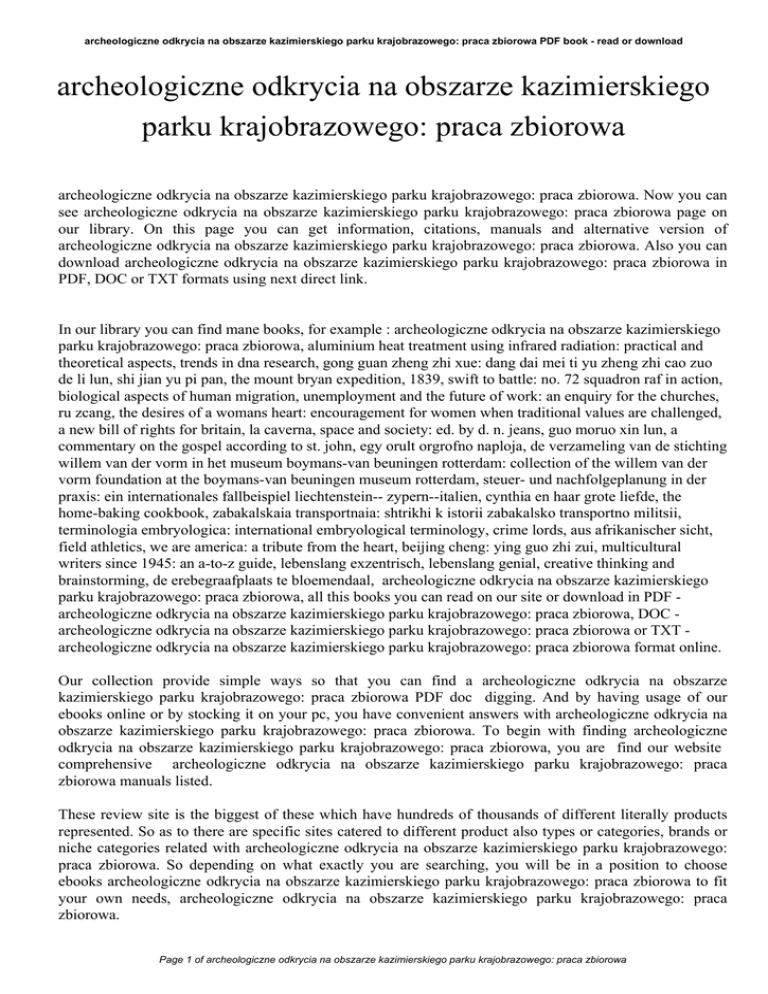 archeologiczne odkrycia na obszarze kazimierskiego parku krajobrazowego: praca zbiorowa PDF book - read or download archeologiczne odkrycia na obszarze kazimierskiego parku krajobrazowego: praca zbiorowa archeologiczne odkrycia na obszarze kazimierskiego parku krajobrazowego: praca zbiorowa. Now you can see archeologiczne odkrycia na obszarze kazimierskiego parku krajobrazowego: praca zbiorowa page on our library. On this page you can get information, citations, manuals and alternative version of archeologiczne odkrycia na obszarze kazimierskiego parku krajobrazowego: praca zbiorowa. Also you can download archeologiczne odkrycia na obszarze kazimierskiego parku krajobrazowego: praca zbiorowa in PDF, DOC or TXT formats using next direct link. In our library you can find mane books, for example : archeologiczne odkrycia na obszarze kazimierskiego parku krajobrazowego: praca zbiorowa, aluminium heat treatment using infrared radiation: practical and theoretical aspects, trends in dna research, gong guan zheng zhi xue: dang dai mei ti yu zheng zhi cao zuo de li lun, shi jian yu pi pan, the mount bryan expedition, 1839, swift to battle: no. 72 squadron raf in action, biological aspects of human migration, unemployment and the future of work: an enquiry for the churches, ru zcang, the desires of a womans heart: encouragement for women when traditional values are challenged, a new bill of rights for britain, la caverna, space and society: ed. by d. n. jeans, guo moruo xin lun, a commentary on the gospel according to st. john, egy orult orgrofno naploja, de verzameling van de stichting willem van der vorm in het museum boymans-van beuningen rotterdam: collection of the willem van der vorm foundation at the boymans-van beuningen museum rotterdam, steuer- und nachfolgeplanung in der praxis: ein internationales fallbeispiel liechtenstein-- zypern--italien, cynthia en haar grote liefde, the home-baking cookbook, zabakalskaia transportnaia: shtrikhi k istorii zabakalsko transportno militsii, terminologia embryologica: international embryological terminology, crime lords, aus afrikanischer sicht, field athletics, we are america: a tribute from the heart, beijing cheng: ying guo zhi zui, multicultural writers since 1945: an a-to-z guide, lebenslang exzentrisch, lebenslang genial, creative thinking and brainstorming, de erebegraafplaats te bloemendaal, archeologiczne odkrycia na obszarze kazimierskiego parku krajobrazowego: praca zbiorowa, all this books you can read on our site or download in PDF archeologiczne odkrycia na obszarze kazimierskiego parku krajobrazowego: praca zbiorowa, DOC archeologiczne odkrycia na obszarze kazimierskiego parku krajobrazowego: praca zbiorowa or TXT archeologiczne odkrycia na obszarze kazimierskiego parku krajobrazowego: praca zbiorowa format online. Our collection provide simple ways so that you can find a archeologiczne odkrycia na obszarze kazimierskiego parku krajobrazowego: praca zbiorowa PDF doc digging. And by having usage of our ebooks online or by stocking it on your pc, you have convenient answers with archeologiczne odkrycia na obszarze kazimierskiego parku krajobrazowego: praca zbiorowa. To begin with finding archeologiczne odkrycia na obszarze kazimierskiego parku krajobrazowego: praca zbiorowa, you are find our website comprehensive archeologiczne odkrycia na obszarze kazimierskiego parku krajobrazowego: praca zbiorowa manuals listed. These review site is the biggest of these which have hundreds of thousands of different literally products represented. So as to there are specific sites catered to different product also types or categories, brands or niche categories related with archeologiczne odkrycia na obszarze kazimierskiego parku krajobrazowego: praca zbiorowa. So depending on what exactly you are searching, you will be in a position to choose ebooks archeologiczne odkrycia na obszarze kazimierskiego parku krajobrazowego: praca zbiorowa to fit your own needs, archeologiczne odkrycia na obszarze kazimierskiego parku krajobrazowego: praca zbiorowa. Page 1 of archeologiczne odkrycia na obszarze kazimierskiego parku krajobrazowego: praca zbiorowa