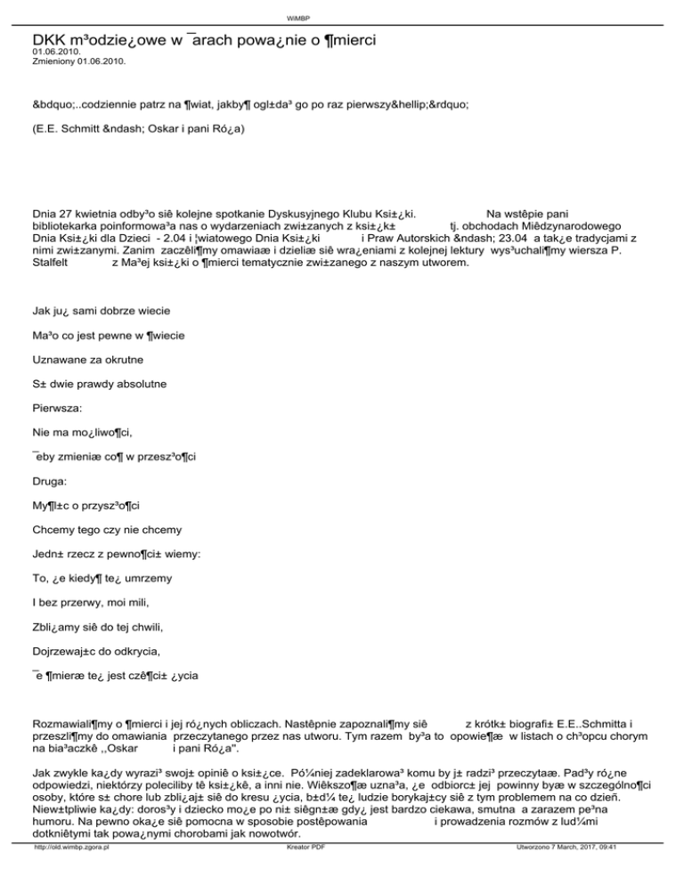 WiMBP DKK m³odzie¿owe w ¯arach powa¿nie o ¶mierci 01.06.2010. Zmieniony 01.06.2010. „..codziennie patrz na ¶wiat, jakby¶ ogl±da³ go po raz pierwszy…” (E.E. Schmitt – Oskar i pani Ró¿a) Dnia 27 kwietnia odby³o siê kolejne spotkanie Dyskusyjnego Klubu Ksi±¿ki. Na wstêpie pani bibliotekarka poinformowa³a nas o wydarzeniach zwi±zanych z ksi±¿k± tj. obchodach Miêdzynarodowego Dnia Ksi±¿ki dla Dzieci - 2.04 i ¦wiatowego Dnia Ksi±¿ki i Praw Autorskich – 23.04 a tak¿e tradycjami z nimi zwi±zanymi. Zanim zaczêli¶my omawiaæ i dzieliæ siê wra¿eniami z kolejnej lektury wys³uchali¶my wiersza P. Stalfelt z Ma³ej ksi±¿ki o ¶mierci tematycznie zwi±zanego z naszym utworem. Jak ju¿ sami dobrze wiecie Ma³o co jest pewne w ¶wiecie Uznawane za okrutne S± dwie prawdy absolutne Pierwsza: Nie ma mo¿liwo¶ci, ¯eby zmieniæ co¶ w przesz³o¶ci Druga: My¶l±c o przysz³o¶ci Chcemy tego czy nie chcemy Jedn± rzecz z pewno¶ci± wiemy: To, ¿e kiedy¶ te¿ umrzemy I bez przerwy, moi mili, Zbli¿amy siê do tej chwili, Dojrzewaj±c do odkrycia, ¯e ¶mieræ te¿ jest czê¶ci± ¿ycia Rozmawiali¶my o ¶mierci i jej ró¿nych obliczach. Nastêpnie zapoznali¶my siê z krótk± biografi± E.E..Schmitta i przeszli¶my do omawiania przeczytanego przez nas utworu. Tym razem by³a to opowie¶æ w listach o ch³opcu chorym na bia³aczkê ,,Oskar i pani Ró¿a''. Jak zwykle ka¿dy wyrazi³ swoj± opiniê o ksi±¿ce. Pó¼niej zadeklarowa³ komu by j± radzi³ przeczytaæ. Pad³y ró¿ne odpowiedzi, niektórzy poleciliby tê ksi±¿kê, a inni nie. Wiêkszo¶æ uzna³a, ¿e odbiorc± jej powinny byæ w szczególno¶ci osoby, które s± chore lub zbli¿aj± siê do kresu ¿ycia, b±d¼ te¿ ludzie borykaj±cy siê z tym problemem na co dzieñ. Niew±tpliwie ka¿dy: doros³y i dziecko mo¿e po ni± siêgn±æ gdy¿ jest bardzo ciekawa, smutna a zarazem pe³na humoru. Na pewno oka¿e siê pomocna w sposobie postêpowania i prowadzenia rozmów z lud¼mi dotkniêtymi tak powa¿nymi chorobami jak nowotwór. http://old.wimbp.zgora.pl Kreator PDF Utworzono 7 March, 2017, 09:41 WiMBP W nawi±zaniu do tematu miêli¶my okazjê poznaæ historiê i cele Fundacji Mam Marzenie dzia³aj±cej na rzecz dzieci cierpi±cych na choroby zagra¿aj±ce ich ¿yciu jak równie¿ ustanowionym przez tê fundacjê Ogólnopolskim Dniu Marzeñ obchodzonym 12 wrze¶nia. Ostatnim punktem naszej wizyty w bibliotece by³o otrzymanie kolejnej ksi±¿ki do przeczytania tym razem J. Olech „Gdzie diabe³ mówi do us³ug…” Na zakoñczenie zostali¶my poczêstowani s³odko¶ciami i rozeszli¶my siê do domów. Aleksandra Zaborna uczennica kl. VI SP 8 w ¯arach Ma³gorzata Paw³owska moderator DKK http://old.wimbp.zgora.pl Kreator PDF Utworzono 7 March, 2017, 09:41