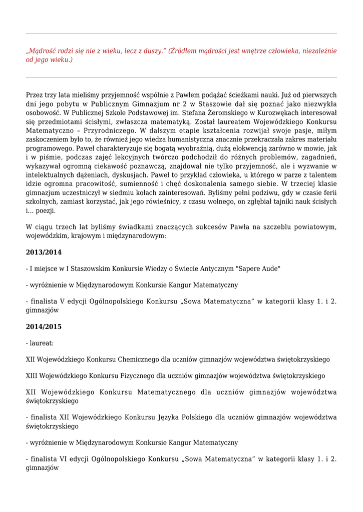 „Mądrość rodzi się nie z wieku, lecz z duszy.” (Źródłem mądrości jest wnętrze człowieka, niezależnie od jego wieku.) Przez trzy lata mieliśmy przyjemność wspólnie z Pawłem podążać ścieżkami nauki. Już od pierwszych dni jego pobytu w Publicznym Gimnazjum nr 2 w Staszowie dał się poznać jako niezwykła osobowość. W Publicznej Szkole Podstawowej im. Stefana Żeromskiego w Kurozwękach interesował się przedmiotami ścisłymi, zwłaszcza matematyką. Został laureatem Wojewódzkiego Konkursu Matematyczno – Przyrodniczego. W dalszym etapie kształcenia rozwijał swoje pasje, miłym zaskoczeniem było to, że również jego wiedza humanistyczna znacznie przekraczała zakres materiału programowego. Paweł charakteryzuje się bogatą wyobraźnią, dużą elokwencją zarówno w mowie, jak i w piśmie, podczas zajęć lekcyjnych twórczo podchodził do różnych problemów, zagadnień, wykazywał ogromną ciekawość poznawczą, znajdował nie tylko przyjemność, ale i wyzwanie w intelektualnych dążeniach, dyskusjach. Paweł to przykład człowieka, u którego w parze z talentem idzie ogromna pracowitość, sumienność i chęć doskonalenia samego siebie. W trzeciej klasie gimnazjum uczestniczył w siedmiu kołach zainteresowań. Byliśmy pełni podziwu, gdy w czasie ferii szkolnych, zamiast korzystać, jak jego rówieśnicy, z czasu wolnego, on zgłębiał tajniki nauk ścisłych i… poezji. W ciągu trzech lat byliśmy świadkami znaczących sukcesów Pawła na szczeblu powiatowym, wojewódzkim, krajowym i międzynarodowym: 2013/2014 - I miejsce w I Staszowskim Konkursie Wiedzy o Świecie Antycznym "Sapere Aude" - wyróżnienie w Międzynarodowym Konkursie Kangur Matematyczny - finalista V edycji Ogólnopolskiego Konkursu „Sowa Matematyczna” w kategorii klasy 1. i 2. gimnazjów 2014/2015 - laureat: XII Wojewódzkiego Konkursu Chemicznego dla uczniów gimnazjów województwa świętokrzyskiego XIII Wojewódzkiego Konkursu Fizycznego dla uczniów gimnazjów województwa świętokrzyskiego XII Wojewódzkiego Konkursu Matematycznego dla uczniów gimnazjów województwa świętokrzyskiego - finalista XII Wojewódzkiego Konkursu Języka Polskiego dla uczniów gimnazjów województwa świętokrzyskiego - wyróżnienie w Międzynarodowym Konkursie Kangur Matematyczny - finalista VI edycji Ogólnopolskiego Konkursu „Sowa Matematyczna” w kategorii klasy 1. i 2. gimnazjów - II miejsce w dekanalnym etapie XVIII Diecezjalnego Konkursu Wiedzy Biblijnej "Z Pismem Świętym w Trzecie Tysiąclecie" (udział w etapie diecezjalnym) - I miejsce w konkursie "Arystoteles Junior" w kategorii wiedza matematyczno – przyrodnicza - I miejsce w XIV Powiatowym Turnieju Ortograficznym 2015/2016 - laureat: XIV Wojewódzkiego Konkursu Informatycznego dla uczniów gimnazjów województwa świętokrzyskiego XIII Wojewódzkiego Konkursu Historycznego dla uczniów gimnazjów województwa świętokrzyskiego XIII Wojewódzkiego Konkursu Chemicznego dla uczniów gimnazjów województwa świętokrzyskiego XIV Wojewódzkiego Konkursu Fizycznego dla uczniów gimnazjów województwa świętokrzyskiego XIII Wojewódzkiego Konkursu Matematycznego dla uczniów gimnazjów województwa świętokrzyskiego XIII Wojewódzkiego Konkursu Geograficznego dla uczniów gimnazjów województwa świętokrzyskiego - finalista XIII Wojewódzkiego Konkursu Języka Polskiego dla uczniów gimnazjów województwa świętokrzyskiego - wynik bardzo dobry w Międzynarodowym Konkursie Kangur Matematyczny - laureat ogólnopolskiego konkursu literackiego "Opowieści rodzinne" organizowanego przez czasopismo "Victor Gimnazjalista" - I miejsce w ogólnopolskim konkursie literackim Wyzwania XXI wieku zorganizowanym przez Towarzystwo Szkół Zjednoczonego Świata im. prof. Pawła Czartoryskiego - II miejsce w Ogólnopolskim Konkursie „Sowa Matematyczna” w kategorii klasy 3. gimnazjów, 1. liceów i techników, 1., 2., 3. zasadniczych szkół zawodowych - II etap Ogólnopolskiej Olimpiady Matematycznej Gimnazjalistów - I miejsce w konkursie "Arystoteles Junior" w kategorii wiedza matematyczno – przyrodnicza - I miejsce w XV Powiatowym Turnieju Ortograficznym - I miejsce w XIX Diecezjalnym Konkursie Wiedzy Biblijnej "Z Pismem Świętym w Trzecie Tysiąclecie" - I miejsce w X Drużynowym Konkursie Matematycznym organizowanym przez Publiczne Gimnazjum im. Marszałka Józefa Piłsudskiego w Jarosławicach Te osiągnięcia są wynikiem nie tylko szczególnych zdolności, wybitnej pamięci, ale i ogromnej pracy, jaką wykazał się Paweł w czasie dotychczasowych lat swojej edukacji. W ciągu trzyletniego cyklu kształcenia gimnazjalnego uczeń ten osiągał bardzo dobre i celujące wyniki w nauce. W klasie trzeciej uzyskał średnią ocen 5,50 i wysoki wynik z egzaminu gimnazjalnego: w części humanistycznej – historia i wos - 100 %, język polski – 94%; w części matematyczno – przyrodniczej – matematyka - 100%, część przyrodnicza –100%; z języka angielskiego – poziom podstawowy – 85%, poziom rozszerzony – 90%. Dzięki tym sukcesom Paweł został nagrodzony zaszczytnym tytułem Prymusa Roku. Ponadto Paweł podczas wszystkich lat nauki dał się poznać jako osoba o wysokim poziomie kultury osobistej. Wykazywał ogromne zaangażowanie w pracy na rzecz klasy, szkoły(udział w akademiach). Na uwagę zasługują również jego zdolności przywódcze- przez trzy lata gimnazjum był wybierany, prawie jednogłośnie, na przewodniczącego klasy. Paweł łatwo nawiązuje kontakt z ludźmi, cieszy się sympatią zarówno rówieśników, jak i nauczycieli, charakteryzuje się również dużym poczuciem humoru. Chętnie pomaga osobom mającym trudności w nauce, potrafi je zmobilizować do dodatkowych działań. Jest stypendystą Fundacji „Vive Serce Dzieciom”, a także służy pomocą jako wolontariusz w „Dziupli naukowej” działającej przy Szkole Podstawowej nr 3 w Staszowie . Ten młody człow