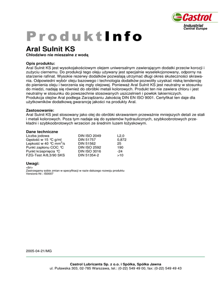 Aral Sulnit KS Chłodziwo nie mieszalne z wod Opis produktu: Aral Sulnit KS jest wysokojako ciowym olejem uniwersalnym zawieraj cym dodatki przeciw korozji i zu yciu ciernemu. Do produkcji tego oleju u ywany jest specjalnie wyselekcjonowany, odporny na starzenie rafinat. Wysokie rezerwy dodatków pozwalaj utrzyma długi okres skuteczno ci skrawania. Odpowiedni wybór oleju bazowego i technologia dodatków pozwoliły uzyska nisk tendencj do pienienia oleju i tworzenia si mgły olejowej. Poniewa Aral Sulnit KS jest neutralny w stosunku do miedzi, nadaj si równie do obróbki metali kolorowych. Produkt ten nie zawiera chloru i jest neutralny w stosunku do powszechnie stosowanych uszczelnie i powłok lakierniczych. Produkcja olejów Aral podlega Zarz dzaniu Jako ci DIN EN ISO 9001. Certyfikat ten daje dla u ytkowników dodatkow gwarancj jako ci na produkty Aral. Zastosowanie: Aral Sulnit KS jest stosowany jako olej do obróbki skrawaniem przewa nie mniejszych detali ze stali i metali kolorowych. Poza tym nadaje si do systemów hydraulicznych, szybkoobrotowych przekładni i szybkoobrotowych wrzecion ze rednim luzem ło yskowym. Dane techniczne Liczba jodowa G sto w 15 °C g/ml 2 Lepko w 40 °C mm /s Punkt zapłonu COC °C Punkt krzepni cia °C FZG-Test A/8,3/90 SKS DIN ISO 2049 DIN 51757 DIN 51562 DIN ISO 2592 DIN ISO 3016 DIN 51354-2 L2,0 0,872 25 190 -24 >10 Uwagi: <br> Zastrzegamy sobie zmian w specyfikacji w razie dalszego rozwoju produktu Versions-Nr.: IS0007 2005-04-21/MG Castrol Lubricants Sp. z o.o. i Spółka, Spółka Jawna ul. Puławska 303, 02-785 Warszawa, tel.: (0-22) 549 49 00, fax: (0-22) 549 49 43