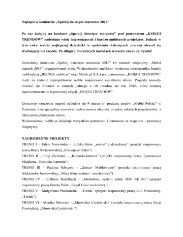 Najlepsi w konkursie „Spełnij dziecięce marzenia 2016” Po raz kolejny na konkurs „Spełnij dziecięce marzenia” pod patronatem „KSIĘGI TRENDÓW” nadesłano wiele interesujących i bardzo ambitnych projektów. Jednak w tym roku wybór najlepszej dziesiątki w spełnianiu dziecięcych marzeń okazał się trudniejszy niż zwykle. Po długich, burzliwych naradach wreszcie znane są wyniki! Uczestnicy konkursu „Spełnij dziecięce marzenia 2016” (w ramach inicjatywy „Mebel marzeń 2016” organizowanej przez Wydawnictwo meble.pl, wydawcę miesięcznika branży meblarskiej „BIZNES meble.pl” oraz Meble.pl S.A.) pod patronatem „KSIĘGI TRENDÓW” mieli za zadanie zaprojektować meble inspirowane rysunkami dzieci. Projekty musiały mieścić się również w ramach jednego z 10 trendów na rok 2016, które zostaną zaprezentowane w tegorocznej edycji „KSIĘGI TRENDÓW”. Uroczyste wręczenie nagród odbędzie się 9 marca br. podczas targów „Meble Polska” w Poznaniu, a na specjalnej wystawie będzie można obejrzeć projekty młodych projektantów, a także prace plastyczne dzieci. Wydawnictwo meble.pl dziękuje wszystkim partnerom i patronom za wsparcie i promocję inicjatywy. NAGRODZONE PROJEKTY TREND I – Edyta Niewińska – „Łóżko które „rośnie” z dzieckiem” (projekt inspirowany pracą Beaty Świątkowskiej „Fruwające łóżko”) TREND II – Filip Zieliński – „Komodo-latarnia” (projekt inspirowany pracą Tymoteusza Majchera, „Komodo-Latarnia”) TREND III – Paulina Sobczyk – „Zestaw Meblobranie” (projekt inspirowany pracą Aleksandry Jankowskiej, „Moja leśna szatnia – muchomory”) TREND IV – Elżbieta Redelbach – „Modułowy system półek #DO RE Mi” (projekt inspirowany pracą Doroty Piłat, „Regał klucz wiolinowy”) TREND V – Małgorzata Płoskońska – „Turlak” (projekt inspirowany pracą Julii Powieckiej, „Turlak”) TREND VI – Monika Mrowiec – „Mrowisko Czytelnisko” (projekt inspirowany pracą Alicji Powieckiej, „MrowiskoCzytelnisko”) TREND VII – Marta Wójtowicz – „Żyrafa Fotel” (projekt inspirowany pracą Marysi Wilczyńskiej, „Żyrafa - fotel na kółkach”) TREND VIII – Sylwia Siekirka – „Regał Op-Rack” (projekt inspirowany pracą Pawła Wolnego, „Regał iluzja”) TREND IX – Aleksandra Gajzler (projekt inspirowany pracą Igi Tomczyk, Lublin, „Ciekawość świata”) TREND X – Magdalena Lorek-Biela – „Łożko Frogi” (projekt inspirowany pracą Idy Sękowskiej, „Łóżko – żaba”) Inicjatywa „Mebel marzeń 2016”, organizowana przez Wydawnictwo meble.pl, wydawcę miesięcznika branży meblarskiej „BIZNES meble.pl” oraz Meble.pl S.A., składa się z dwóch etapów: I ETAP – konkurs „Mebel dziecięcych marzeń” II ETAP – konkurs „Spełnij dziecięce marzenia” „KSIĘGA TRENDÓW” – pierwsza w Polsce publikacja łącząca analizę tendencji socjologicznych z produktami odpowiadającymi na ukryte za nimi potrzeby Polaków. W promujących ją akcjach ważną rolę odgrywają prace powstałe w ramach inicjatywy „Mebel marzeń”. W ten sposób integrują się pomysły najmłodszych z kreatywnością młodych projektantów i rynkową dojrzałością podmiotów branży meblarskiej i wyposażenia wnętrz.