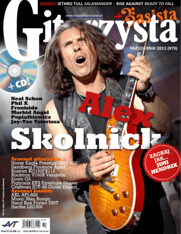 Test Hoyer Eagle Prestige HEG 510 3.280 PLN er kilka razy Jak wiele marek z długą tradycją, tak i Hoy u z rąk do przechodził na przestrzeni ubiegłego wiek pował tak, jak rąk. Nie każdy z nowych właścicieli postę 1874 powołał chciałby tego Franz Hoyer, który w roku m miasteczku do życia lutniczą manufakturę w rodzinny Schönbach/Egerland Krzysztof Inglik A le też niewiele gitarowych firm potrafiło przetrwać na rynku tak długo i utrzymać rzeszę wiernych należy fanów. Mamy XXI wiek, a Hoyer Ltd., pe Euro r Ritte ie nazw o ki do spół e tej ceni której celem stało się przywró ne arza wytw ry marce świetności. Gita ą któr z yce, fabr iej są w koreańsk Martin Ritter współpracował przy różnych projektach na przestrzeni ostatnich 20 lat. Miesiąc temu testowaliśmy Hoyera Black Lady, który zaskoczył bardzo pozytywnie całą redakcję Gitarzysty. Tym razem pod lupę weźmiemy Hoyera Eagle Prestige. W teorii Tytułowy „orzeł” to reedycja modelu wprowadzonego do katalogu Hoyera pod koniec lat 70., o rozpoznawalnym, oryginalnym kształcie ma- honiowego korpusu. Wyglądający jak stara mapa top gitary wykonany został z ozdobnego gatunku klonu o nazwie spalted maple – faktura ta powstaje w drewnie (najczęściej martwym) w wyniku działania organizmów pasożytniczych, takich jak grzyby. Widoczne ciemne linie to bariery, którymi otaczają zajęte przez siebie „terytorium” – wygląda to bardzo efektownie. Na pokładzie zamontowano dwa przetworniki w kremowych ramkach: ceniony przez muzyków model o rozłączanych cewkach Hoyer Humbucker HHB-100 w wersji „B” oraz „N” (od ang. bridge – mostek, neck – gryf). Kontrolę nad nimi sprawujemy za pomocą potencjometrów VOLUME i TONE oraz umieszczonego pomiędzy nimi klasycz- Gry f graw ituje w kie runku tradyc yjnych profili v intage, ale prz y połączeniu z korpusem ma zdec ydowanie mnie jsze kopy to niż to spotyk ane w konstrukcjach ty p u LP 62 Gitarzysta październik 2011 Hoyer Eagle Prestige HEG 510 gitara elektryczna nego przełącznika 3-pozycyjnego. Gałka tonów rozłącza cewki humbuckerów (push-pull). Solidną bazą dla strun, przechodzących przez korpus w specjalnych tulejach, jest mostek Hoyer 3D Bridge. Gryf został wykonany z pięciu warstw (dwie z klonu i trzy z mahoniu) w technologii neck-thru, co widać z tyłu jak na dłoni. Na hebanowej podstrunnicy nabito 22 progi medium, a rolę znaczników pozycji pełnią charakterystyczne markery przypominające rozłożone skrzydła orła. Siodełko wykonano z kości. Na główce znajdziemy firmowe klucze z perłowymi skrzydełkami, rozmieszczone w układzie 3+3. Dostęp do pręta napinającego gryf przysłonięty został owalną przykrywką z logo i nazwą modelu. Tradycyjnie już znaczek Hoyer wykonany został z metalu. Pod nim umieszczono piękną perłową inkrustację orła – nie ma wątpliwości, że jest to Eagle Prestige. W praktyce Pierwszy kontakt z Hoyerem Eagle Prestige jest bardzo pozytywny. Wspominałem już o pięknym wzorze klonu spalted. W połączeniu z lakierem wypolerowanym na wysoki połysk i złotym osprzętem prezentuje się to spektakularnie. Zaskakuje perfekcyjne wykończenie i – trzeba przyznać – jakość koreańskich instrumentów sukcesywnie się poprawia od dłuższego już czasu. Jedyne zastrzeżenie miałbym do bindingu korpusu, który zamiast łączyć się z tym z gryfu lub kończyć się po prostu na korpusie, wchodzi krótkim paskiem na gryf i urywa się nie wiadomo dlaczego. Cała reszta wykonana i zaprojektowana jest bez zastrzeżeń. Ma się wrażenie obcowania z instrumentem z dużo wyższej półki. Manualnie bez niespodzianek: gryf grawituje w kierunku tradycyjnych profili vintage, ale przy połączeniu z korpusem ma zdecydowanie mniejsze kopyto niż to spotykane w konstrukcjach typu LP. Jest to dość gładkie przejście, zupełnie jak w gitarach basowych – zdecydowanie na plus. Krótsza, gibsonowska skala instrumentu 24,75 cala sprawia, że struny wydają się bardziej elastyczne. Na co dzień gram na gitarach o długości czynnej 25,5 cala i muszę powiedzieć, że różnica jest wyraźna, zupełnie jak podczas gry w obniżonym stroju. Odległości pomiędzy progami także są nieco krótsze, co docenią gitarzyści o mniejszych dłoniach. Pomimo podobieństwa budowy i gatunków drewna do testowanego miesiąc temu Hoyera Black Lady ta gitara odzywa się już na sucho nieco inaczej – brzmienie nie jest tak miękkie i elastyczne jak tam. Jest tu pewien twardy pierwiastek, który wychodzi na plan pierwszy po podłączeniu wiosła na czystym kanale wzmacniacza. Barwa dość mocno kopie – to zasługa zarówno konstrukcji neck-thru, jak i dość silnych przetworników. Szczerze mówiąc, dziwię się trochę, że firma nie zastosowała tu ciepłych pickupów typu P.A.F. o niskim sygnale i kremowej górze pasma. Uwypuklony jest za to wyższy środek, który może zakłuć w uszy, szczególnie jeśli mocniej zaatakujemy struny wiolinowe w wyższych pozycjach. Osobiście wolałbym, aby czyste brzmienie nie było aż tak twarde, reklama Poza logotypem producenta i symbolem przedstawiającym sylwetkę orła na główce instrumentu znalazły się klucze marki Hoyer wyposażone w perłowe skrzydełka, zamontowane w układzie 3+3, a także zaślepka pręta regulacyjnego. Test Hoyer Eagle Prestige HEG 510 gitara elektryczna Gryf został wykonany z pięciu kawałków drewna (dwa z klonu oraz trzy z mahoniu). Tworzy on z korpusem monolityczną konstrukcję, co gwarantuje lepszy rezonans. Bardzo dobre brzmienie na rozłączonych humbuckerach w środkowej pozycji switcha może z powodzeniem udawać Strata Dane techniczne ale przy odrobinie EQ da się temu zaradzić. Bardzo dobre brzmienie na rozłączonych humbuckerach w środkowej pozycji switcha może z powodzeniem udawać Strata. Również singiel pod gryfem, po rozłączeniu humbuckera, gra bardzo przyjemnie. Z kolei singiel z przystaw