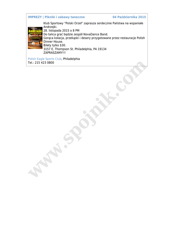 IMPREZY | Pikniki i zabawy taneczne 04 Października 2015 Klub Sportowy "Polski Orzeł" zaprasza serdecznie Państwa na wspaniałe Andrzejki. 28. listopada 2015 o 8 PM Do tańca grać będzie zespół NovaDance Band. Gorąca kolacja, przekąski i desery przygotowane przez restauracje Polish Dinner House. Bilety tylko $30. 3157 E. Thompson St. Philadelphia, PA 19134 ZAPRASZAMY!!! w w w .s po jn ik .c o m Polish Eagle Sports Club, Philadelphia Tel.: 215 423 0800