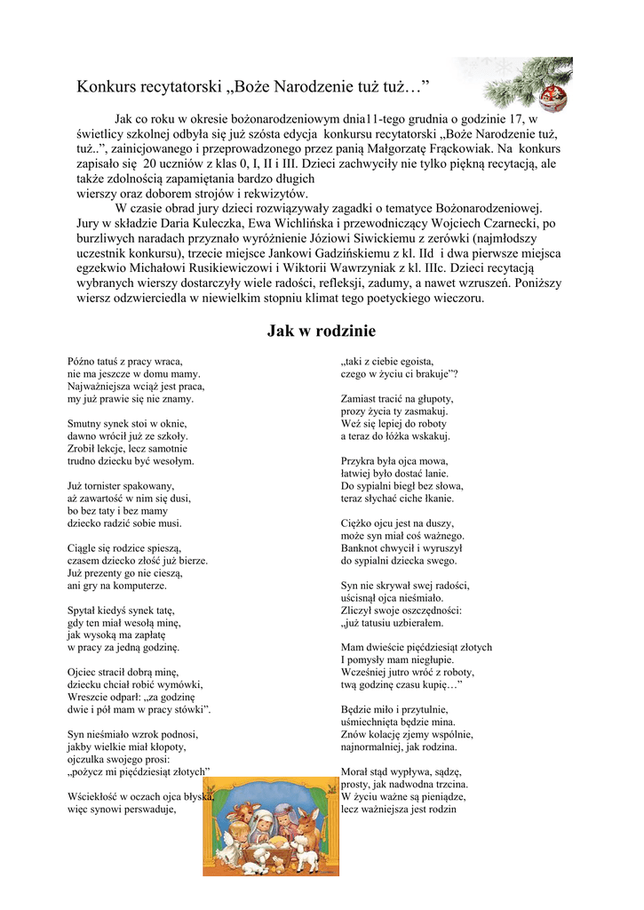 Konkurs recytatorski „Boże Narodzenie tuż tuż…” Jak co roku w okresie bożonarodzeniowym dnia11-tego grudnia o godzinie 17, w świetlicy szkolnej odbyła się już szósta edycja konkursu recytatorski „Boże Narodzenie tuż, tuż..”, zainicjowanego i przeprowadzonego przez panią Małgorzatę Frąckowiak. Na konkurs zapisało się 20 uczniów z klas 0, I, II i III. Dzieci zachwyciły nie tylko piękną recytacją, ale także zdolnością zapamiętania bardzo długich wierszy oraz doborem strojów i rekwizytów. W czasie obrad jury dzieci rozwiązywały zagadki o tematyce Bożonarodzeniowej. Jury w składzie Daria Kuleczka, Ewa Wichlińska i przewodniczący Wojciech Czarnecki, po burzliwych naradach przyznało wyróżnienie Józiowi Siwickiemu z zerówki (najmłodszy uczestnik konkursu), trzecie miejsce Jankowi Gadzińskiemu z kl. IId i dwa pierwsze miejsca egzekwio Michałowi Rusikiewiczowi i Wiktorii Wawrzyniak z kl. IIIc. Dzieci recytacją wybranych wierszy dostarczyły wiele radości, refleksji, zadumy, a nawet wzruszeń. Poniższy wiersz odzwierciedla w niewielkim stopniu klimat tego poetyckiego wieczoru. Jak w rodzinie Późno tatuś z pracy wraca, nie ma jeszcze w domu mamy. Najważniejsza wciąż jest praca, my już prawie się nie znamy. Smutny synek stoi w oknie, dawno wrócił już ze szkoły. Zrobił lekcje, lecz samotnie trudno dziecku być wesołym. Już tornister spakowany, aż zawartość w nim się dusi, bo bez taty i bez mamy dziecko radzić sobie musi. Ciągle się rodzice spieszą, czasem dziecko złość już bierze. Już prezenty go nie cieszą, ani gry na komputerze. Spytał kiedyś synek tatę, gdy ten miał wesołą minę, jak wysoką ma zapłatę w pracy za jedną godzinę. Ojciec stracił dobrą minę, dziecku chciał robić wymówki, Wreszcie odparł: „za godzinę dwie i pół mam w pracy stówki”. Syn nieśmiało wzrok podnosi, jakby wielkie miał kłopoty, ojczulka swojego prosi: „pożycz mi pięćdziesiąt złotych” Wściekłość w oczach ojca błyska, więc synowi perswaduje, „taki z ciebie egoista, czego w życiu ci brakuje”? Zamiast tracić na głupoty, prozy życia ty zasmakuj. Weź się lepiej do roboty a teraz do łóżka wskakuj. Przykra była ojca mowa, łatwiej było dostać lanie. Do sypialni biegł bez słowa, teraz słychać ciche łkanie. Ciężko ojcu jest na duszy, może syn miał coś ważnego. Banknot chwycił i wyruszył do sypialni dziecka swego. Syn nie skrywał swej radości, uścisnął ojca nieśmiało. Zliczył swoje oszczędności: „już tatusiu uzbierałem. Mam dwieście pięćdziesiąt złotych I pomysły mam niegłupie. Wcześniej jutro wróć z roboty, twą godzinę czasu kupię…” Będzie miło i przytulnie, uśmiechnięta będzie mina. Znów kolację zjemy wspólnie, najnormalniej, jak rodzina. Morał stąd wypływa, sądzę, prosty, jak nadwodna trzcina. W życiu ważne są pieniądze, lecz ważniejsza jest rodzin