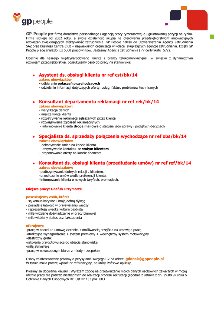 GP People jest firmą doradztwa personalnego i agencją pracy tymczasowej o ugruntowanej pozycji na rynku. Firma istnieje od 2002 roku, a swoją działalność skupia na oferowaniu przedsiębiorstwom innowacyjnych rozwiązań zwiększających efektywność zatrudnienia. GP People należy do Stowarzyszenia Agencji Zatrudnienia SAZ oraz Business Centre Club – największych organizacji w Polsce skupiających agencje zatrudnienia. Dzięki GP People pracę znalazło już 5000 pracowników. Jesteśmy Agencją zatrudnienia ( nr certyfikatu 572). Obecnie dla naszego międzynarodowego Klienta z branży telekomunikacyjnej, w związku z dynamicznym rozwojem przedsiębiorstwa, poszukujemy osób do pracy na stanowiska: Asystent ds. obsługi klienta nr ref cst/bk/14 zakres obowiązków - odbieranie połączeń przychodzących - udzielanie informacji dotyczących oferty, usług, faktur, problemów technicznych Konsultant departamentu reklamacji nr ref rek/bk/14 zakres obowiązków: - weryfikacja danych - analiza konta klienta - rozpatrywanie reklamacji zgłaszanych przez klienta - rozwiązywanie zgłoszeń reklamacyjnych - informowanie klienta drogą mailową o statusie jego sprawy i podjętych decyzjach Specjalista ds. sprzedaży połączenia wychodzące nr ref obs/bk/14 zakres obowiązków: - dokonywanie zmian na koncie klienta - utrzymywanie kontaktu ze stałym klientem - proponowanie oferty na koncie abonenta Konsultant ds. obsługi klienta (przedłużanie umów) nr ref ref/bk/14 zakres obowiązków: -podtrzymywanie dobrych relacji z klientem, -przedłużanie umów wedle preferencji klienta, -informowanie klienta o nowych taryfach, promocjach. Miejsce pracy: Gdańsk Przymorze poszukujemy osób, które: - są komunikatywne i mają dobrą dykcję - posiadają łatwość w przyswajaniu wiedzy - reprezentują wysoką kulturę osobistą - mile widziane doświadczenie w pracy biurowej - mile widziany status ucznia/studenta oferujemy: -pracę w oparciu o umowę zlecenie, z możliwością przejścia na umowę o pracę -atrakcyjne wynagrodzenie + system premiowy + wewnętrzny system motywacyjny -elastyczny grafik -szkolenie przygotowujące do objęcia stanowiska -miłą atmosferę -pracę w nowoczesnym biurze z młodym zespołem Osoby zainteresowane prosimy o przysyłanie swojego CV na adres: [email protected] W tytule maila proszę wpisać nr referencyjny, na który Państwo aplikują. Prosimy za dopisanie klauzuli: Wyrażam zgodę na przetwarzanie moich danych osobowych zawartych w mojej ofercie pracy dla potrzeb niezbędnych do realizacji procesu rekrutacji (zgodnie z ustawą z dn. 29.08.97 roku o Ochronie Danych Osobowych Dz. Ust Nr 133 poz. 883.