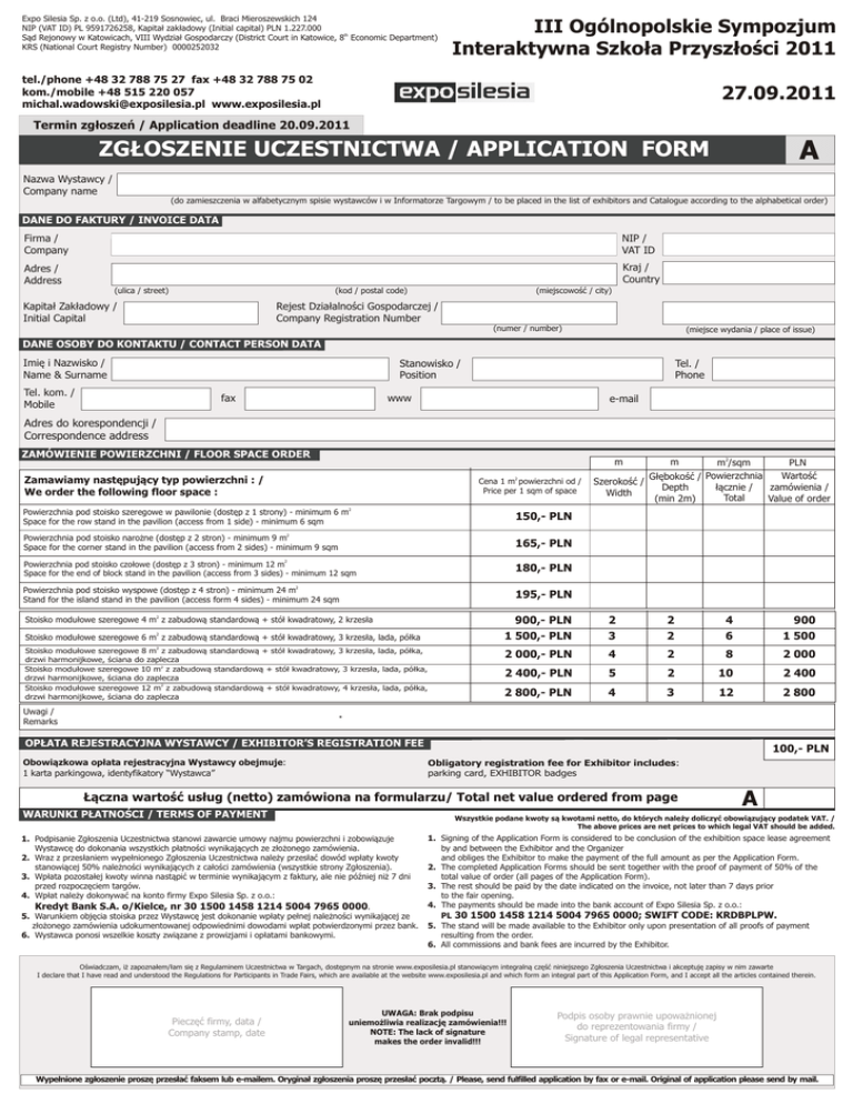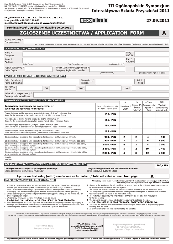 Expo Silesia Sp. z o.o. (Ltd), 41-219 Sosnowiec, ul. Braci Mieroszewskich 124 NIP (VAT ID) PL 9591726258, Kapitał zakładowy (Initial capital) PLN 1.227.000 Sąd Rejonowy w Katowicach, VIII Wydział Gospodarczy (District Court in Katowice, 8th Economic Department) KRS (National Court Registry Number) 0000252032 III Ogólnopolskie Sympozjum Interaktywna Szkoła Przyszłości 2011 tel./phone +48 32 788 75 27 fax +48 32 788 75 02 kom./mobile +48 515 220 057 [email protected] www.exposilesia.pl 27.09.2011 Termin zgłoszeń / Application deadline 20.09.2011 A ZGŁOSZENIE UCZESTNICTWA / APPLICATION FORM Nazwa Wystawcy / Company name (do zamieszczenia w alfabetycznym spisie wystawców i w Informatorze Targowym / to be placed in the list of exhibitors and Catalogue according to the alphabetical order) DANE DO FAKTURY / INVOICE DATA Firma / Company NIP / VAT ID Adres / Address Kraj / Country (ulica / street) (kod / postal code) Kapitał Zakładowy / Initial Capital (miejscowość / city) Rejest Działalności Gospodarczej / Company Registration Number (numer / number) (miejsce wydania / place of issue) DANE OSOBY DO KONTAKTU / CONTACT PERSON DATA Imię i Nazwisko / Name & Surname Stanowisko / Position Tel. kom. / Mobile Tel. / Phone www fax e-mail Adres do korespondencji / Correspondence address ZAMÓWIENIE POWIERZCHNI / FLOOR SPACE ORDER m2/sqm PLN Wartość Głębokość / Powierzchnia Szerokość / łącznie / zamówienia / Depth Width Total Value of order (min 2m) m Zamawiamy następujący typ powierzchni : / We order the following floor space : 2 Cena 1 m powierzchni od / Price per 1 sqm of space m 2 Powierzchnia pod stoisko szeregowe w pawilonie (dostęp z 1 strony) - minimum 6 m Space for the row stand in the pavilion (access from 1 side) - minimum 6 sqm 150,- PLN 2 Powierzchnia pod stoisko narożne (dostęp z 2 stron) - minimum 9 m Space for the corner stand in the pavilion (access from 2 sides) - minimum 9 sqm 165,- PLN 2 Powierzchnia pod stoisko czołowe (dostęp z 3 stron) - minimum 12 m Space for the end of block stand in the pavilion (access from 3 sides) - minimum 12 sqm 180,- PLN 2 Powierzchnia pod stoisko wyspowe (dostęp z 4 stron) - minimum 24 m Stand for the island stand in the pavilion (access form 4 sides) - minimum 24 sqm 195,- PLN 2 900,- PLN 2 1 500,- PLN 2 3 2 2 4 6 900 1 500 2 000,- PLN 4 2 8 2 000 Stoisko modułowe szeregowe 4 m z zabudową standardową + stół kwadratowy, 2 krzesła Stoisko modułowe szeregowe 6 m z zabudową standardową + stół kwadratowy, 3 krzesła, lada, półka 2 Stoisko modułowe szeregowe 8 m z zabudową standardową + stół kwadratowy, 3 krzesła, lada, półka, drzwi harmonijkowe, ściana do zaplecza Stoisko modułowe szeregowe 10 m2 z zabudową standardową + stół kwadratowy, 3 krzesła, lada, półka, drzwi harmonijkowe, ściana do zaplecza Stoisko modułowe szeregowe 12 m2 z zabudową standardową + stół kwadratowy, 4 krzesła, lada, półka, drzwi harmonijkowe, ściana do zaplecza 2 400,- PLN 5 2 10 2 400 2 800,- PLN 4 3 12 2 800 Uwagi / Remarks OPŁATA REJESTRACYJNA WYSTAWCY / EXHIBITOR’S REGISTRATION FEE Obowiązkowa opłata rejestracyjna Wystawcy obejmuje: 1 karta parkingowa, identyfikatory “Wystawca” 100,- PLN Obligatory registration fee for Exhibitor includes: parking card, EXHIBITOR badges Łączna wartość usług (netto) zamówiona na formularzu/ Total net value ordered from page WARUNKI PŁATNOŚCI / TERMS OF PAYMENT A Wszystkie podane kwoty są kwotami netto, do których należy doliczyć obowiązujący podatek VAT. / The above prices are net prices to which legal VAT should be added. 1. Podpisanie Zgłoszenia Uczestnictwa stanowi zawarcie umowy najmu powierzchni i zobowiązuje Wystawcę do dokonania wszystkich płatności wynikających ze złożonego zamówienia. 2. Wraz z przesłaniem wypełnionego Zgłoszenia Uczestnictwa należy przesłać dowód wpłaty kwoty stanowiącej 50% należności wynikających z całości zamówienia (wszystkie strony Zgłoszenia). 3. Wpłata pozostałej kwoty winna nastąpić w terminie wynikającym z faktury, ale nie później niż 7 dni przed rozpoczęciem targów. 4. Wpłat należy dokonywać na konto firmy Expo Silesia Sp. z o.o.: Kredyt Bank S.A. o/Kielce, nr 30 1500 1458 1214 5004 7965 0000. 5. Warunkiem objęcia stoiska przez Wystawcę jest dokonanie wpłaty pełnej należności wynikającej ze złożonego zamówienia udokumentowanej odpowiednimi dowodami wpłat potwierdzonymi przez bank. 6. Wystawca ponosi wszelkie koszty związane z prowizjami i opłatami bankowymi. 1. Signing of the Application Form is considered to be conclusion of the exhibition space lease agreement by and between the Exhibitor and the Organizer and obliges the Exhibitor to make the payment of the full amount as per the Application Form. 2. The completed Application Forms should be sent together with the proof of payment of 50% of the total value of order (all pages of the Application Form). 3. The rest should be paid by the date indicated on the invoice, not later than 7 days prior to the fair opening. 4. The payments should be made into the bank account of Expo Silesia Sp. z o.o.: PL 30 1500 1458 1214 5004 7965 0000; SWIFT CODE: KRDBPLPW. 5. The stand will be made available to the Exhibitor only upon presentation of all proofs of payment resulting from the order. 6. All commissions and bank fees are incurred by the Exhibitor. Oświadczam, iż zapoznałem/łam się z Regulaminem Uczestnictwa w Targach, dostępnym na stronie www.exposilesia.pl stanowiącym integralną część niniejszego Zgłoszenia Uczestnictwa i akceptuję zapisy w nim zawarte I declare that I have read and understood the Regulations for Participants in Trade Fairs, which are available at the website www.exposilesia.pl and which form an integral part of this Application Form, and I accept all the articles contained therein. Pieczęć firmy, data / Company stamp, date UWAGA: Brak podpisu uniemożliwia realizację zamówienia!!! NOTE: T