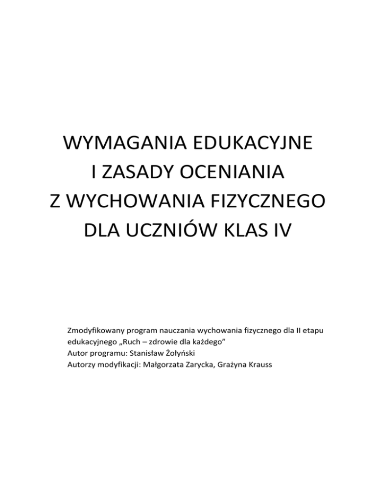 WYMAGANIA EDUKACYJNE I ZASADY OCENIANIA Z WYCHOWANIA FIZYCZNEGO DLA UCZNIÓW KLAS IV Zmodyfikowany program nauczania wychowania fizycznego dla II etapu edukacyjnego „Ruch – zdrowie dla każdego” Autor programu: Stanisław Żołyoski Autorzy modyfikacji: Małgorzata Zarycka, Grażyna Krauss ZASADY OCENIANIA Ocena semestralna/roczna z wychowania fizycznego będzie wypadkową ocen koocowych z poszczególnych obszarów oceniania z zajęd lekcyjnych. Wszystkie obszary oceniania eksponują wysiłek ucznia oraz uwzględniają zdefiniowane w podstawie programowej umiejętności i wiadomości. Przy ocenianiu ucznia z wychowania fizycznego na pierwszym miejscu brany jest pod uwagę wysiłek wkładany przez ucznia w zajęcia Na początku każdego roku szkolnego uczniowie zapoznawani są uczniom szczegółowe kryteria oceniania poszczególnych stopni szkolnych ze wszystkich obszarów oceniania. Bardzo ważnym elementem przy wystawianiu uczniowi oceny z wychowania fizycznego jest regularne przynoszenie przez niego stroju sportowego. Ocena z wychowania fizycznego może byd podniesiona o jedną do góry za wysokie osiągnięcia sportowe lub inne szczególne działania i zasługi. Uczeo ma prawo do poprawy oceny cząstkowej. Uczeo jest informowany o uzyskaniu danej oceny na bieżąco. Rodzice uzyskują informacje o ocenach na zebraniach rodzicielskich. Obszar Postawa ucznia na zajęciach Zachowanie ucznia na zajęciach Poziom umiejętności ruchowych Wiadomości z zakresu edukacji fizycznej OCENA CELUJĄCA Szczegółowe kryteria oceny 1. Wykazuje bardzo dużą aktywnośd i zaangażowanie na lekcjach. 2. Jest zawsze przygotowany do zajęd. 3. Wkłada bardzo dużo wysiłku w wykonywane zadania. 4. Powierzone mu zadania wykonuje sumiennie i starannie. 5. Systematycznie uczęszcza na zajęcia – ewentualne nieobecności ma usprawiedliwione. 6. Przestrzega zasad fair play na boisku i w życiu. 7. Chętnie uczestniczy w zajęciach pozalekcyjnych. 8. Jest zaangażowany w działalnośd sportową szkoły. Chętnie pracuje na rzecz szkolnego wychowania fizycznego. Chętnie reprezentuje szkołę w rozgrywkach sportowych. 1. Prezentuje postawę godną naśladowania: jest koleżeoski, życzliwy, cechuje go wysoka kultura osobista. 2. Nigdy nie używa wulgaryzmów. 3. Nigdy nie stosuje przemocy wobec innych. 4. Troszczy się o bezpieczeostwo swoje i innych. 5. Zawsze przestrzega ustalonych reguł i zasad postepowania. 6. Doskonale potrafi współpracowad na boisku i poza nim. 7. Potrafi dokonad samooceny własnego zachowania. 8. Jest odpowiedzialny za zdrowie własne i innych: nie pali papierosów, nie pije alkoholu, nie zażywa narkotyków i środków psychoaktywnych oraz stosuje zasady bezpieczeostwa. 9. Właściwie pełni role zawodnika, sędziego i kibica. 10. Właściwie i z szacunkiem odnosi się do nauczyciela. 1. Wkłada duży wysiłek w opanowanie nowych umiejętności ruchowych: sportowych, rekreacyjnych i utylitarnych. 2. Potrafi prawidłowo opisad własną postawę ciała. 3. Stosuje prawidłowa technikę w grze podczas: kozłowanie piłki w biegu ze zmianą kierunku ruchu, prowadzenia piłki w biegu ze zmianą kierunku ruchu, podania piłki jednorącz i oburącz, rzutu piłki do kosza, rzutu i strzału piłki do bramki, odbicia piłki sposobem górnym. 4. Stosuje prawidłową technikę podczas gry w: tenisa stołowego, unihokeja, kometkę i inne gry rekreacyjne. 5. Wykonuje bezbłędnie przewrót w przód z marszu i przewrót w tył. 6. Wykonuje własny układ gimnastyczny. 7. Inicjuje i organizuje dowolną zabawę lub grę ruchową. 8. Dobiera odpowiedni strój i obuwie do dwiczeo w zależności od miejsca zajęd i pogody. 9. Potrafi dobrad kilka dwiczeo kształtujących wybrane zdolności motoryczne. 10. Potrafi dobrad po trzy dwiczenia ułatwiające utrzymanie prawidłowej postawy ciała. 11. Potrafi zademonstrowad prawidłowa technikę podnoszenia ciężarów z podłoża. 1. Wyjaśnia zależnośd pomiędzy aktywnością fizyczną a zdrowiem. 2. Wymienia i omawia zasady zdrowego stylu życia. 3. Omawia sposoby postępowania w sytuacji zagrożenia zdrowia lub życia. 4. Wyjaśnia, dlaczego należy chronid organizm przed nadmiernym nasłonecznieniem i wyziębieniem. Obszar Postawa ucznia na zajęciach Zachowanie ucznia na zajęciach Poziom umiejętności ruchowych 5. Zna zasady bezpieczeostwa podczas zajęd ruchowych oraz zasady bezpiecznego zachowania się nad woda i w górach. 6. Wymienia zasady czystej gry w sporcie i w życiu oraz wyjaśnia, dlaczego należy przestrzegad ustalonych reguł w trakcie rywalizacji sportowej. 7. Opisuje prawidłowa postawę ciała. 8. Wymienia zasady i metody hartowania organizmu. 9. Interpretuje wynik pomiaru tętna przed i po wysiłku fizycznym. 10. Omawia znaczenie prawidłowego podnoszenia ciężarów. 11. Zna podstawowe przepisy gier sportowych i rekreacyjnych. 12. Wymienia nazwiska wybitnych polskich sportowców. 13. Zna podstawowe zasady poruszania się po drodze. 14. Omawia prawidłowe zachowanie się zawodnika i kibica sportowego. 15. Zna zasady zachowania się na balu, zabawie tanecznej, dyskotece. OCENA BARDZO DOBRA Szczegółowe kryteria oceny 1. Na zajęciach jest aktywny i zaangażowany. 2. Jest przygotowany do zajęd (dopuszcza się trzykrotny brak stroju sportowego w semestrze). 3. Starannie i sumiennie wykonuje powierzone mu zadania. 4. Systematycznie uczęszcza na zajęcia – zdarzają się obecności nieusprawiedliwione. 5. Przestrzega zasad fair play na boisku. 6. Dośd regularnie uczestniczy w zajęciach pozalekcyjnych. 7. Pracuje na rzecz szkolnego wychowania fizycznego. 1. Jest koleżeoski i kulturalny wobec innych. 2. Zdarzają mu się pojedyncze przypadki brzydkiego wyrażania się. 3. Zdarzają mu się pojedyncze przypadki użycia siły wobec innych. 4. Stara się przestrzegad ustalonych reguł i zasad postepowania. 5. Unika zachowao zagrażających zdrowiu własnemu i innych. 6. Współpracuje w zespole. 7. Dokonuje próby samooceny wł