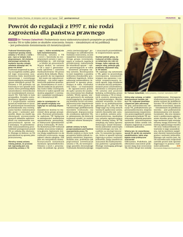 Wygenerowano dnia 2016-08-16 dla loginu: K744366 Dziennik Gazeta Prawna, 16 sierpnia 2016 nr 157 (4304) prawnik gazetaprawna.pl B7 Powrót do regulacji z 1997 r. nie rodzi zagrożenia dla państwa prawnego wywiad Dr Tomasz Zalasiński: Pozbawienie mocy niekonstytucyjnych przepisów po publikacji wyroku TK to tylko jeden ze skutków orzeczenia. Innym – niezależnym od tej publikacji – jest podważenie domniemania ich konstytucyjności Trybunał rozpoznał tę sprawę szczególnie szybko, gdyż od tego orzeczenia uzależniona była możliwość sprawnego i rzetelnego rozstrzygnięcia wszystkich spraw zawisłych przed TK. Ustawa o TK pozwala na kontrolę w ten sposób tych ustaw, które powielają błędy ustawodawcy stwierdzone we wcześniejszych orzeczeniach TK. Tak było w tym przypadku. Ponadto wnioskodawcy zgodnie wnosili o rozpoznanie ustawy przed jej wejściem w życie. W pierwotnym brzmieniu przewidywała ona rozwiązanie bardzo niekorzystne dla praw i wolności jednostki. Mam na myśli np. obowiązek wyznaczania nowych składów sędziowskich czy zawieszenie rozpatrywanych spraw na 6 miesięcy. To powodowałoby nieuzasadnioną przewlekłość postępowań przed TK ze szkodą dla obywateli. Dlatego to dobrze, że TK potraktował tę sprawę jako priorytetową. Obrońcy nowej ustawy mówią jednak, że przecież tak naprawdę jest ona powtórką ustawy o TK z 1997 r., która wcześniej nie była kwestionowana. Owszem, ustawa o TK z 2016 r. bazowała na rozwiązaniach ustawy z 1997 r., powielając ją – jak szacuję – w blisko 90 procentach. Warto dodać, że ustawa o TK z 1997 r. gwarantowała sprawne i rzetelne funkcjonowanie TK przez prawie dwie dekady. Dlatego powrót do tej regulacji – być może nie najnowocześniejszej – nie rodzi zagrożenia dla państwa prawnego. Ustawodawca w 2016 r. jednak dodał do jej pierwotnej treści kilka rozwiązań, których w żaden sposób nie można pogodzić z normami i zasadami wynikającymi z Konstytucji RP RP. Jakie to rozwiązania i w jaki sposób mogłyby one wpłynąć na sytuację obywateli? Zasadniczo można tu wyróżnić dwie grupy przepisów. Pierwsza przyznawała sędziom TK będącym w mniejszości nadmierne uprawnienia, pozwalające faktycznie sparaliżować pracę trybunału. W świetle Konstytucji RP trybunał wydaje orzeczenia większością głosów. Sędziowie, którzy mają wątpliwości co do trafności orzeczenia, mogą zgłosić zdanie odrębne. Tak jest we wszystkich demokratycznych systemach wymiaru sprawiedliwości. Ustawa z 2016 r. przyznawała im jednak np. prawo prenumeratorów „weta zawieszającego”, pozwalające na zablokowanie wydania orzeczenia, co jest wątpliwe konstytucyjnie. Druga grupa rozwiązań, ujęta w ramach regulacji przejściowej, nakazywała do wszelkich spraw – także pozostających w toku – stosować przepisy nowej ustawy. Rozwiązanie to jest wątpliwe z punktu widzenia standardów prawidłowej legislacji, które zakazują ustawodawcy ingerować w sprawy pozostające w toku. Prowadzi ono także – co ważniejsze – do ograniczenia prawa do sądu i prawa do uzyskania orzeczenia bez zbędnej zwłoki. Wiele spraw, niemal gotowych do wydania rozstrzygnięcia, musiałoby się bowiem toczyć od nowa. Jednoznacznie negatywnie TK ocenił także prawo do wybiórczego publikowania wyroków trybunału czy obowiązek dopuszczania do orzekania sędziów TK, w odniesieniu do których trybunał orzekł, że zostali wybrani wbrew Konstytucji RP RP. Jednak zmiany te były przeprowadzane pod hasłem usprawnienia pracy TK. Skutki wejścia w życie tych przepisów byłyby jednak zupełnie odmienne. Doprowadziłyby one, podobnie jak poprzednie nowelizacje ustawy o TK, do wewnętrznego paraliżu decyzyjnego Trybunału Konstytucyjnego i znacznych przewlekłości w rozpatrywaniu spraw. Słychać jednak głosy, że trybunał od kilku miesięcy właściwie nie robi nic innego, tylko zajmuje się samym sobą, podczas gdy problemy obywateli leżą w TK latami. TK zajmuje się ustawami o TK, gdyż te przewidują rozwiązania uniemożliwiające mu sprawne i rzetelne rozpatrywanie innych spraw. Jego działania to skutek decyzji podejmowanych przez ustawodawcę. Oceniona 11 sierpnia przez TK ustawa jest przecież kolejną uchwaloną przez Sejm ustawą o TK w ostatnich sześciu miesiącach. To zastanawiające. Można odnieść wrażenie, że działania te są podejmowane głównie po to, aby TK nie mógł zająć się oceną innych ważnych społecznie ustaw, takich chociażby jak: ustawa o policji, ustawa antyterrorystyczna, medialna czy ustawa ograniczająca obrót ziemią rolną. W TK znajdują się także sprawy dotyczące zasad finansowania jednostek samorządu terytorialnego czy tzw. ryczałtów za noclegi kierowców. To wszystko są regulacje, które w sposób istotny ingerują w prawa i wolności jednostki, mają zasadnicze znaczenie dla funkcjonowania państwa i gospodarki. Dlatego wymagają pilnego rozpatrzenia. FOT. WOJTEK GÓRSKI Trybunał Konstytucyjny rozpatrzył sprawę nowej ustawy o TK (Dz.U. z 2016 r. poz. 1157) w tempie iście ekspresowym. Od złożenia pierwszego wniosku do wydania wyroku minęło zaledwie dziewięć dni. To pana nie dziwi? Dr Tomasz Zalasiński, radca prawny, counsel, kancelaria DZP Którą więc ustawę, w takim ekspresowym tempie, jak tę o TK, trybunał powinien rozpatrzeć jako pierwszą? To jest autonomiczna decyzja TK, podejmowana po przeanalizowaniu stopnia zaawansowania rozpatrywania poszczególnych spraw. Z pewnością jednak TK wyznaczając wokandę powinien nadawać pierwszeństwo sprawom także wedle ich stopnia ingerencji w prawa i wolności jednostki. Wiemy już, że czwartkowy wyrok (K 39/16) nie zostanie opublikowany. Jakie więc będzie miał praktyczne znaczenie? Olbrzymie. Podobnie, jak olbrzymie znaczenie praktyczne mają inne orzeczenia TK, które dotąd nie zostały opublikowane. Derogacja niekonstytucyjnych przepisów ustawy po publikacji wyroku T