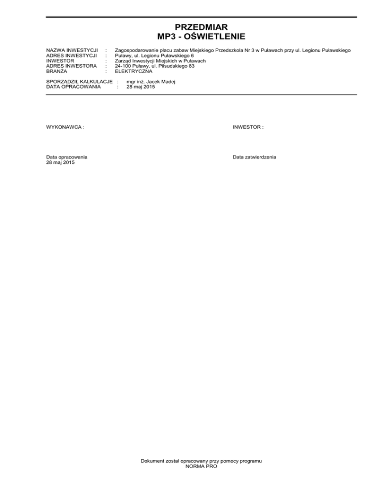 PRZEDMIAR MP3 - OŚWIETLENIE NAZWA INWESTYCJI ADRES INWESTYCJI INWESTOR ADRES INWESTORA BRANŻA : : : : : Zagospodarowanie placu zabaw Miejskiego Przedszkola Nr 3 w Puławach przy ul. Legionu Puławskiego Puławy, ul. Legionu Puławskiego 6 Zarząd Inwestycji Miejskich w Puławach 24-100 Puławy, ul. Piłsudskiego 83 ELEKTRYCZNA SPORZĄDZIŁ KALKULACJE : DATA OPRACOWANIA : mgr inż. Jacek Madej 28 maj 2015 WYKONAWCA : INWESTOR : Data opracowania 28 maj 2015 Data zatwierdzenia Dokument został opracowany przy pomocy programu NORMA PRO Oświetlenie - MP3 PRZEDMIAR Lp. Podstawa Opis i wyliczenia Budowa oświetlenia terenu MP nr 3 1 Budowa oświetlenia terenu placu zabaw przy MP3 1.1 KNNR 5 Tablice rozdzielcze i obudowy, obudowa do 0,1 m2 OBUDOWA 2xS-12 0404-05 1 1.2 KNNR 5 0407-02 1.3 KNNR 5 0701-02 1.4 KNNR 5 0706-01 1.5 KNNR 5 0702-02 1.6 KNNR 5 0705-01 1.7 KNNR 5 1001-01 1.8 KNNR 5 1001-01 1.9 KNNR 5 1003-0102 1.10 KNNR 5 1003-0202 1.11 KNNR 5 1004-01 j.m. szt Osprzęt modułowy w rozdzielnicach, wyłącznik nadprądowy, 3 biegunowy ANALOGIA - montaż osprzętu w T8 4 szt Kopanie rowów dla kabli, ręcznie, grunt kategorii III m3 174.5*0.4*0.8 m3 Nasypanie warstwy piasku na dnie rowu kablowego, szerokość do 0,4 m Krotność = 2 174.5 m Zasypanie rowów dla kabli, ręcznie, grunt kategorii III m3 174.5*0.4*0.6 m3 Ułożenie rur osłonowych PVC do Fi 140 mm DVK-75 m 16.5 m Montaż i stawianie słupów oświetleniowych, słup do 100 kg, stalowy SAL-4E szt 8 szt Montaż i stawianie słupów oświetleniowych, słup do 100 kg, stalowy SAL-5E szt 1 szt szt m Montaż przewodów do opraw oświetleniowych, wciąganych w słupy, rury osło- kpl nowe i wysięgniki, wysokość latarń do 4 m, bez wysięgnika, przewody kabelkowe 8 kpl Montaż przewodów do opraw oświetleniowych, wciąganych w słupy, rury osło- kpl nowe i wysięgniki, wysokość latarń do 5 m, przewody kabelkowe 1 kpl szt Układanie uziomów w rowach kablowych m 3*6 m Mechaniczne pogrążanie uziomów pionowych prętowych, kategoria gruntu III m 3*6 m Listwy elektroinstalacyjne z PVC (naścienne, przypodłogowe i ścienne), przykręcane na cegle LN 40x25 10 m Układanie kabli w rowach kablowych - ręcznie, kabel do 1,0 kg/m, przykrycie folią YAKYżo 5x16mm2 223.5-47 m 1.16 KNNR 5 0713-02 w rurach w słupach w listwie Układanie kabli w rurach, pustakach lub kanałach zamkniętych, kabel do 1,0 kg/m YAKYżo 5x16mm2 11 17*1.5 10 m 1.17 KNNR 5 0212-01 Przewody kabelkowe układane w listwach i kanałach elektroinstalacyjnych, przekrój do 7,5 mm2 YDY 2x1,5mm2 10 m 1.13 KNNR 5 0907-05 1.14 KNNR 5 0110-04 1.15 KNNR 5 0707-0201 1.18 KNNR 5 0301-02 szt m m m m m m Przygotowanie podłoża pod osprzęt instalacyjny, kołki plastikowe osadzane w szt cegle -2- Norma PRO Wersja 4.48 Nr seryjny: 18917 Razem szt Montaż opraw oświetlenia zewnętrznego, na słupie Oprawa np. OP-004 + HQI-E 70W 9 1.12 KNNR 5 0907-06 Poszcz. 1.000 RAZEM 1 4.000 RAZEM 4 55.840 RAZEM 174.500 RAZEM 55.84 174.5 41.880 RAZEM 41.88 16.500 RAZEM 16.5 8.000 RAZEM 8 1.000 RAZEM 1 8.000 RAZEM 8 1.000 RAZEM 1 9.000 RAZEM 9 18.000 RAZEM 18 18.000 RAZEM 18 10.000 RAZEM 10 176.500 RAZEM 177 11.000 25.500 10.000 RAZEM 47 10.000 RAZEM 10 Oświetlenie - MP3 Lp. PRZEDMIAR Podstawa 1.19 KNNR 5 0306-0501 1.20 KNNR 5 0405-06 1.21 KNNR 5 0406-01 1.22 KNNR 5 0726-09 1.23 KNNR 5 1302-04 1.24 KNNR 5 1304-01 1.25 KNNR 5 1304-02 2 2.1 KNNR 5 0403-03 2.2 KNNR 5 0907-06 1 Opis i wyliczenia j.m. szt Łącznik nt 10A, 250V 1-biegunowy WNt-1A szt 1 szt Skrzynki i rozdzielnice skrzynkowe o masie do 10 kg wraz z konstrukcją moco- szt. waną do podłoża przez przykręcenie Obudowa izolacyjna IGA 10V2 IP54 1 szt. Aparaty elektryczne o masie do 2.5 kg Ochronnik przeciwprzepięciowy DEHNventil M TNS 255 1 szt. Obróbka na sucho kabli na napięcie do 1kV o izolacji i powłoce z tworzyw sztucznych, kabel 5-żyłowy, do 16 mm2 18 szt szt. szt Badanie linii kablowej średniego napięcia, niskiego napięcia i sterowniczej, ka- odcibel n.n., 5-żyłowy nek 9 odcinek Badania i pomiary instalacji uziemiającej, piorunochronnej i skuteczności zero- szt wania, uziemienie ochronne lub robocze, pomiar pierwszy 1 szt Badania i pomiary instalacji uziemiającej, piorunochronnej i skuteczności zero- szt wania, uziemienie ochronne lub robocze, pomiar każdy następny 2 szt Montaż szafy zasilającej SR (przedszkole) Urządzenia rozdzielcze (zestawy) na fundamentach, masa ponad 20 kg, na fundamencie prefabrykowanym SŁUPEK ROZGAŁĘŹNY SKR 1 szt m Mechaniczne pogrążanie uziomów pionowych prętowych, kategoria gruntu III m 6 m Ułożenie rur osłonowych PVC do Fi 140 mm DVK-75 m 5.5 m Listwy elektroinstalacyjne z PVC (naścienne, przypodłogowe i ścienne), przykręcane na cegle LN 40x25 10 m Układanie kabli w rowach kablowych - ręcznie, kabel do 1,0 kg/m, przykrycie folią YAKYżo 5x16mm2 40-17 m 2.7 KNNR 5 0713-02 w SR w listwie w rurze Układanie kabli w rurach, pustakach lub kanałach zamkniętych, kabel do 1,0 kg/m YAKYżo 5x16mm2 1.5 10 5.5 m 2.8 KNNR 5 0726-09 Obróbka na sucho kabli na napięcie do 1kV o izolacji i powłoce z tworzyw sztucznych, kabel 5-żyłowy, do 16 mm2 2 szt 2.4 KNNR 5 0705-01 2.5 KNNR 5 0110-04 2.6 KNNR 5 0707-0201 2.9 KNNR 5 1302-04 m m m m m m szt Badanie linii kablowej średniego napięcia, niskiego napięcia i sterowniczej, ka- odcibel n.n., 5-żyłowy nek 1 odcinek Norma PRO Wersja 4.48 Nr seryjny: 18917 1 1.000 RAZEM 1 1.000 RAZEM 1.000 1.000 RAZEM 1.000 18.000 RAZEM 18 9.000 RAZEM 9 1.000 RAZEM 1 2.000 RAZEM 2 1.000 RAZEM 1 6.000 RAZEM 6 6.000 RAZEM 6 5.500 RAZEM 5.5 10.000 RAZEM 10 23.000 RAZEM 23 1.500 10.000 5.500 RAZEM 17 2.000 RAZEM 2 1.000 RAZEM -3- Razem szt Układanie uziomów w rowach kablowych Bednarka ocynkowana 25x4mm 6 2.3 KNNR 5 0907-05 Poszcz. 1.000 RAZEM 1